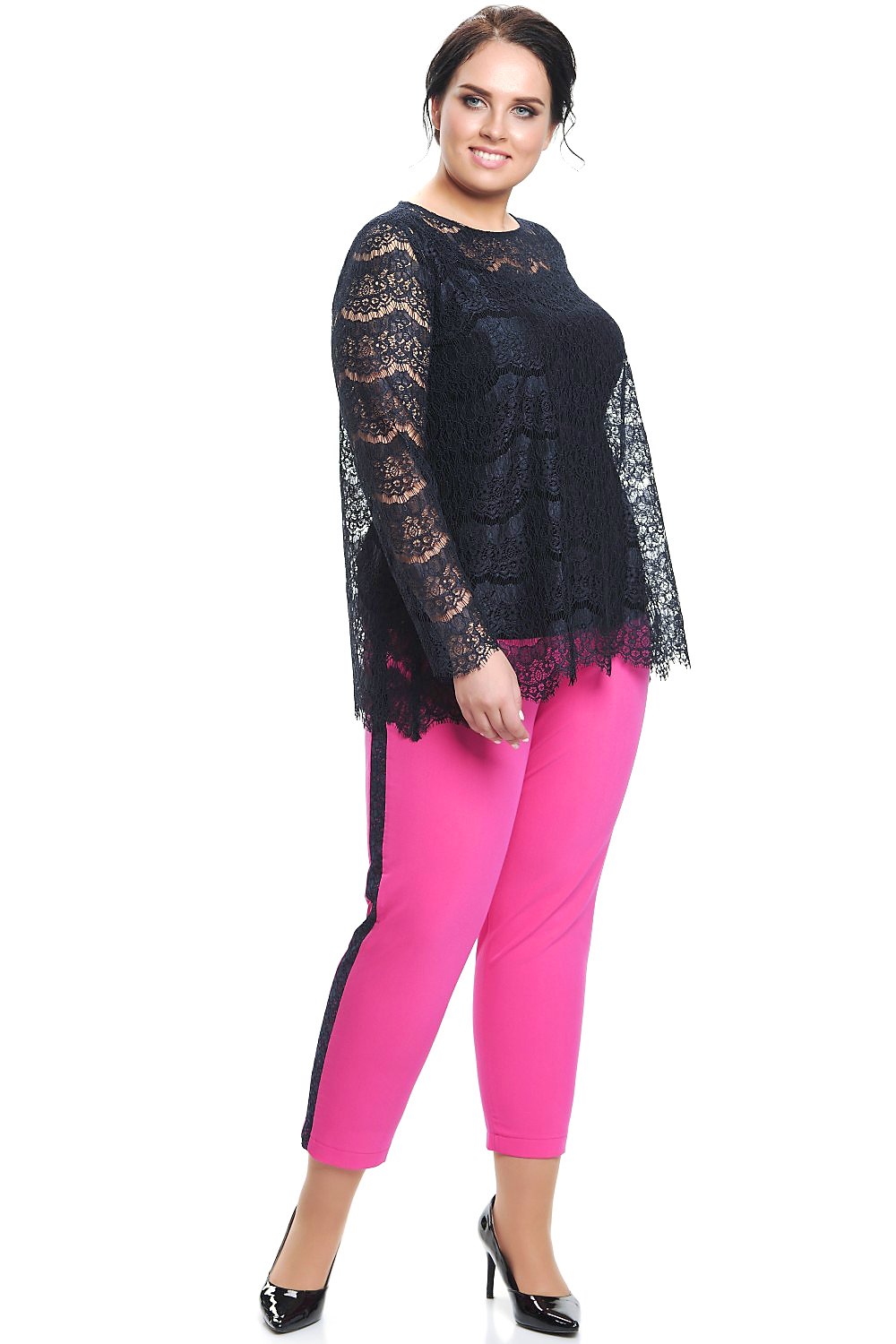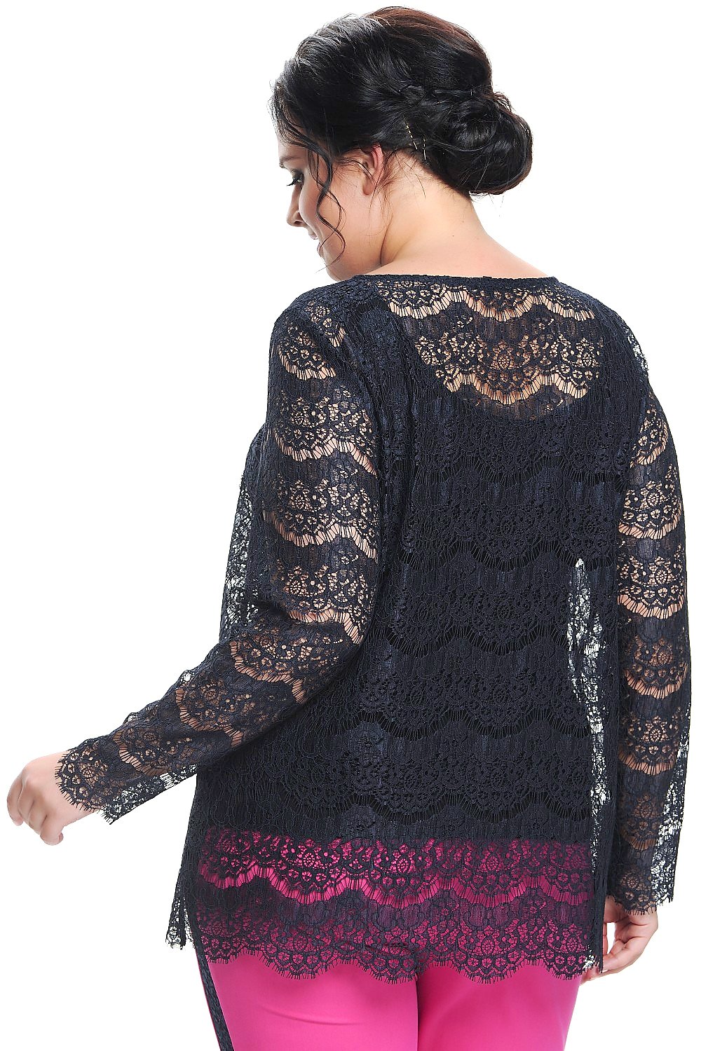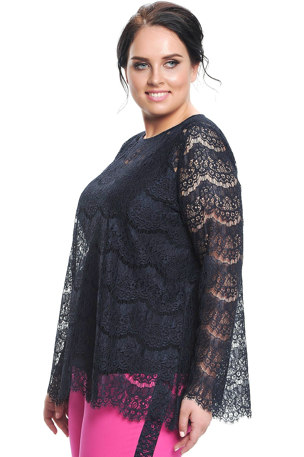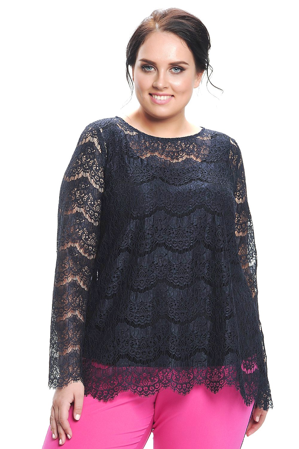 Элегантная блуза из кружевного полотна темно синего цвета, А-образного силуэта. Круглая горловина. Втачной рукав, полная длина. Прекрасно сочетается с данными брюками, арт 4729. На фото модель 52 размера, рост 174 см. Блуза без подклада.