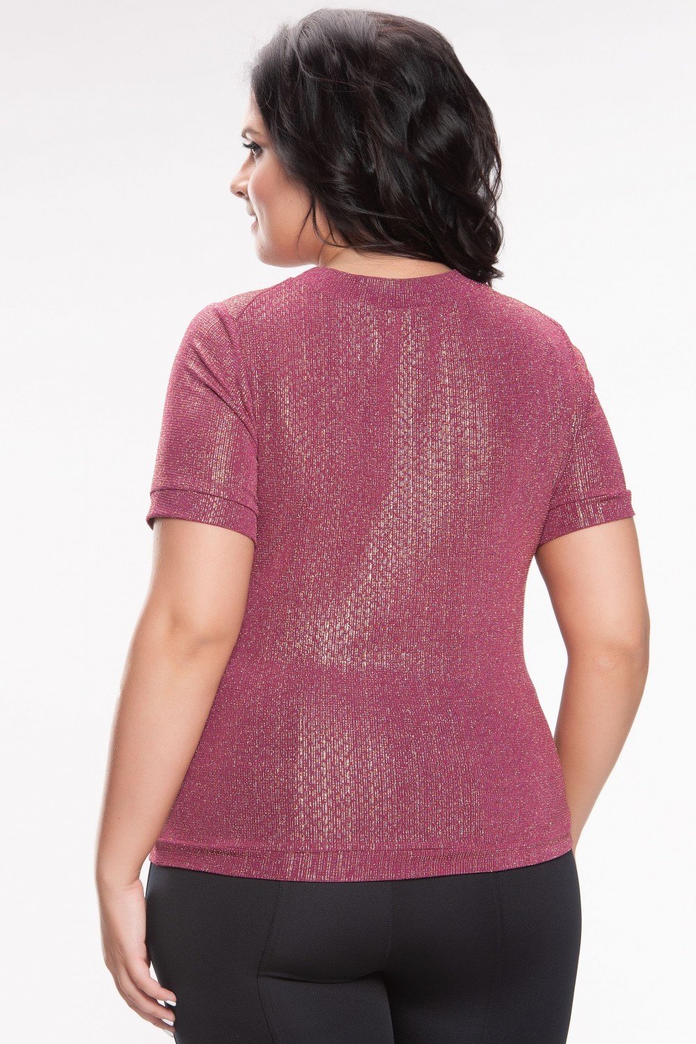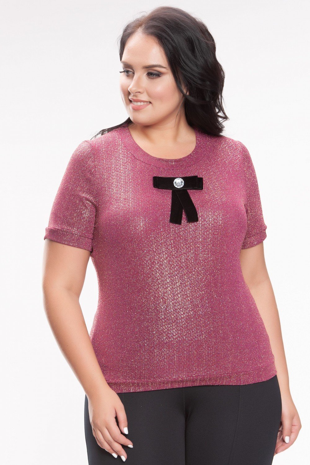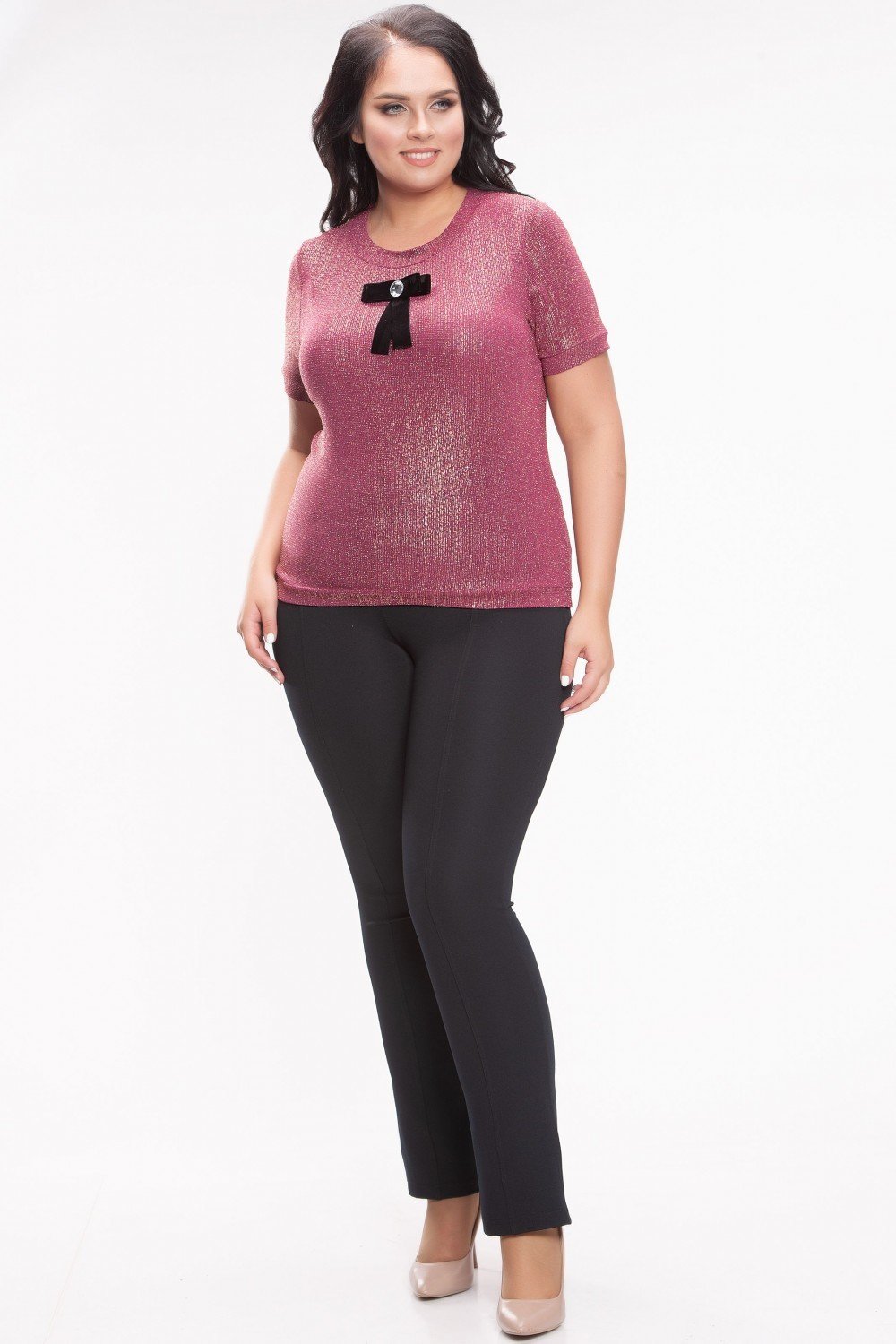 Блуза прямого силуэта из трикотажного полотна розового цвета с люрексом. Круглая горловина, втачной рукав. Горловина, низ рукава и низ блузы обработаны манжетой. В комплекте бархатный бантик в ассортименте. На фото модель 46 размера, рост 171 см.