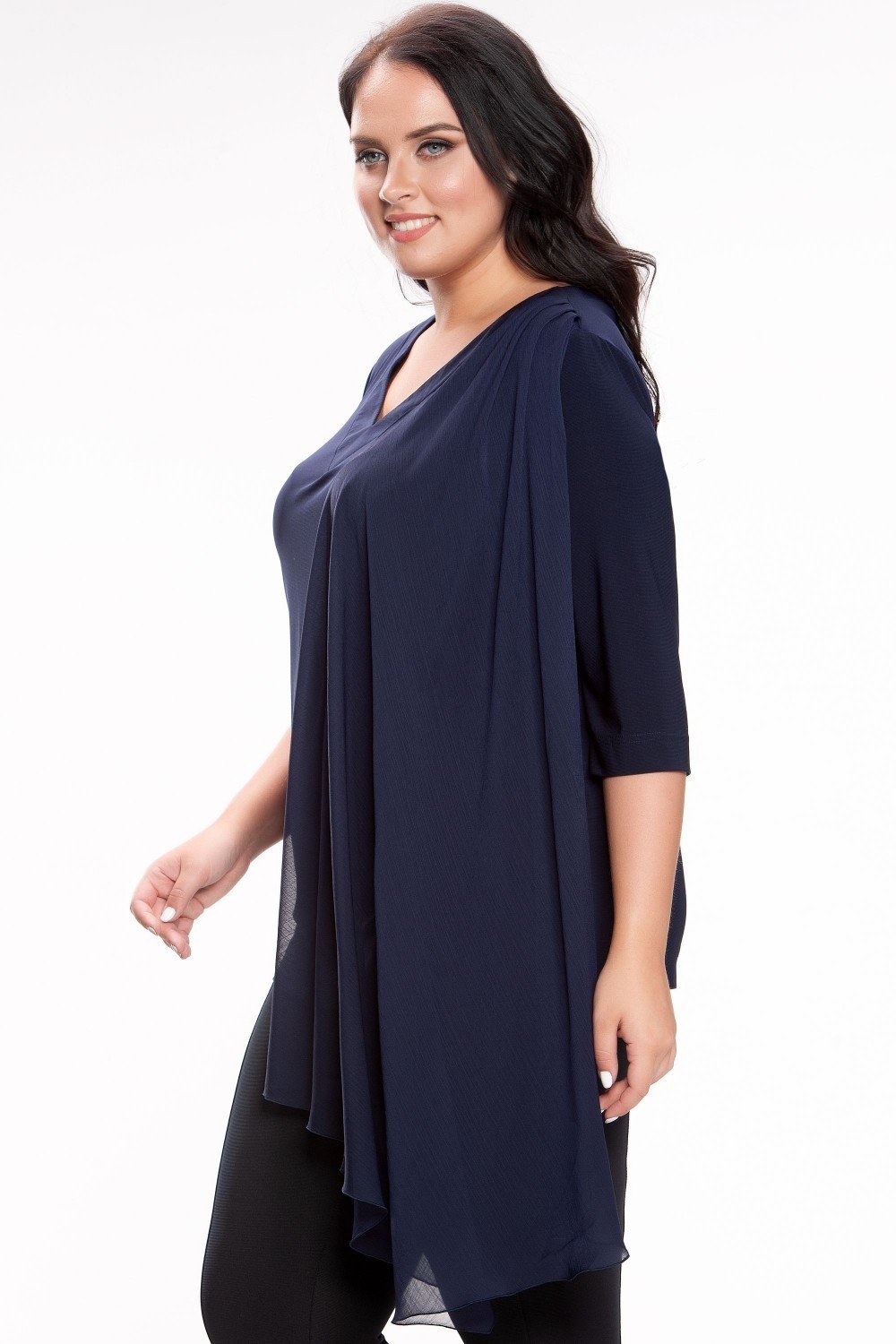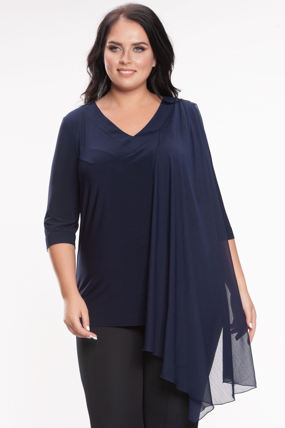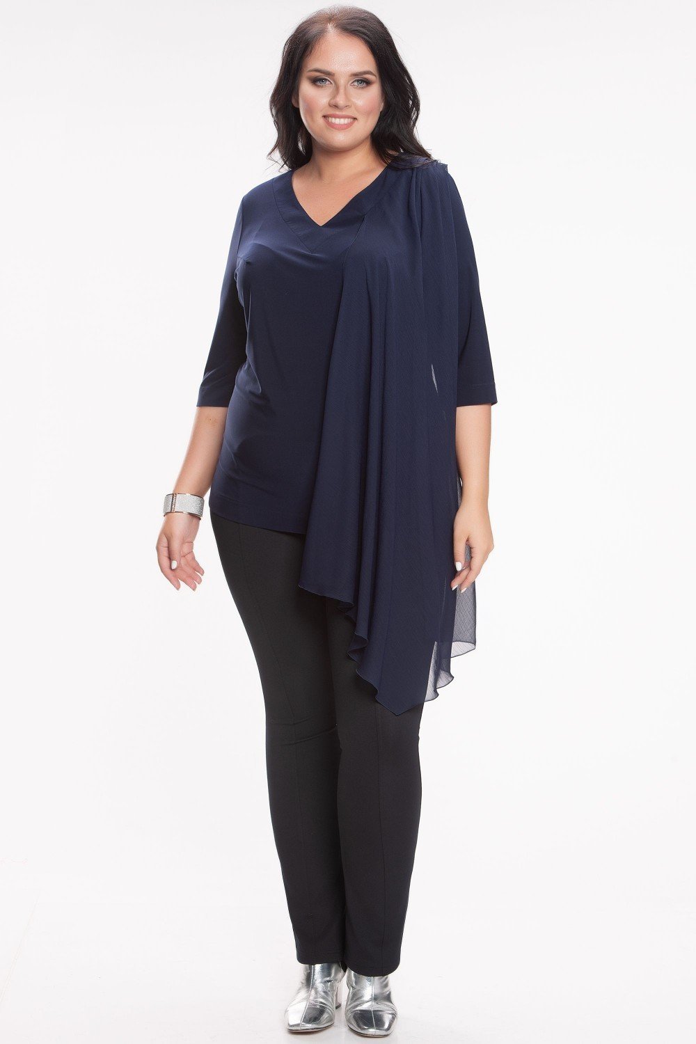 Блуза слегка расклешенная к низу, низ асимметричен по горизонтали, по переду идет декоративная вертикальная вставка из однотонного шифона в тон трикотажного полотна. V-образный вырез, втачной рукав. Элегантная блуза и на праздник и в офис! На фото модель 46 размера, рост 171 см.