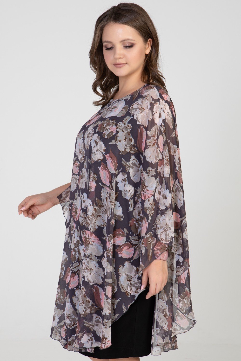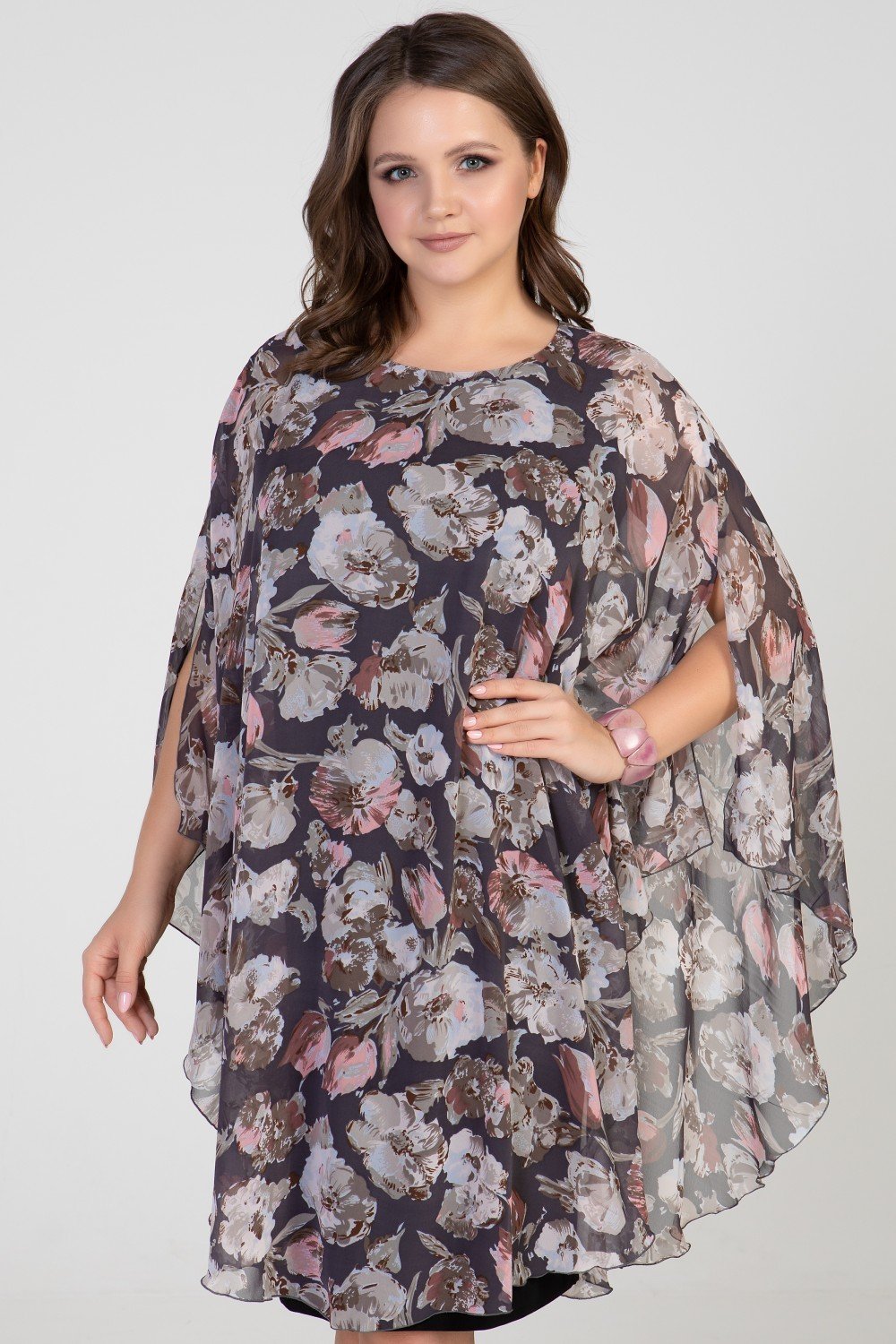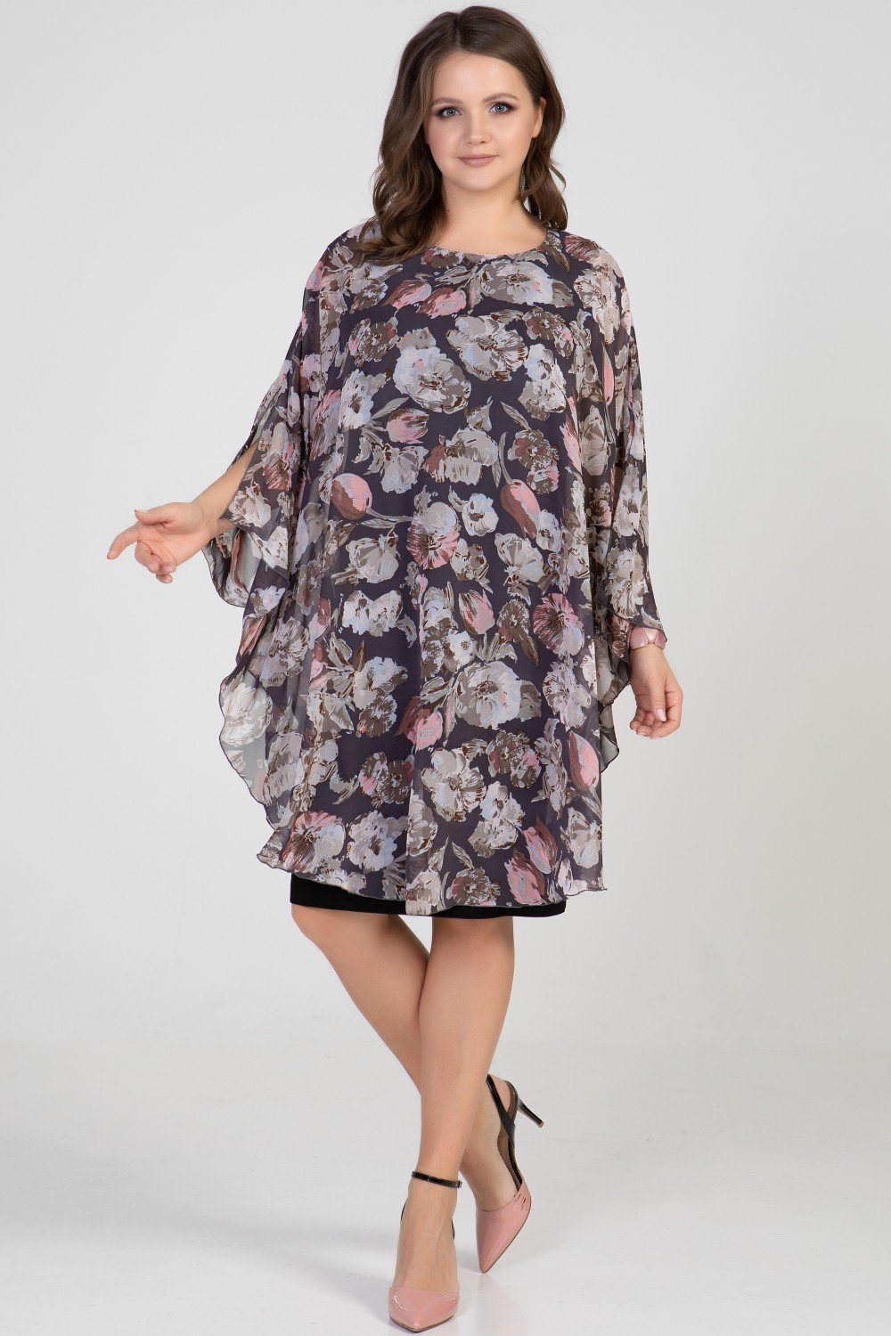 Платье из двух тканей.Пелерина переда и спинки расклешенная из шифона, нижнее платье прилегающего силуэта из масла. Горловина круглая. На фото модель 52 размера, рост 174 см.