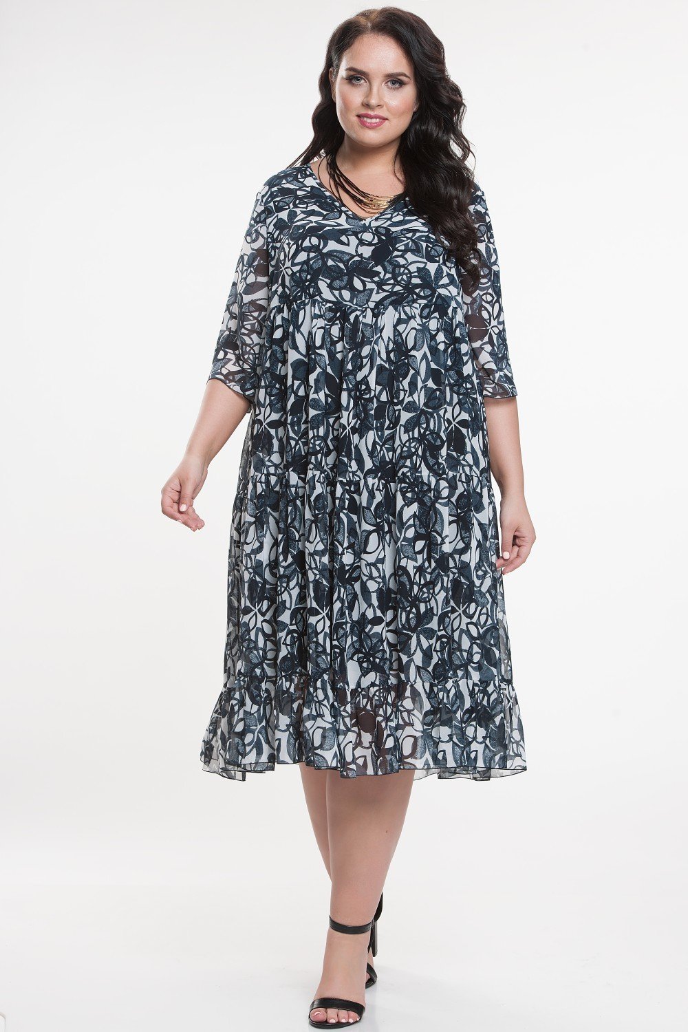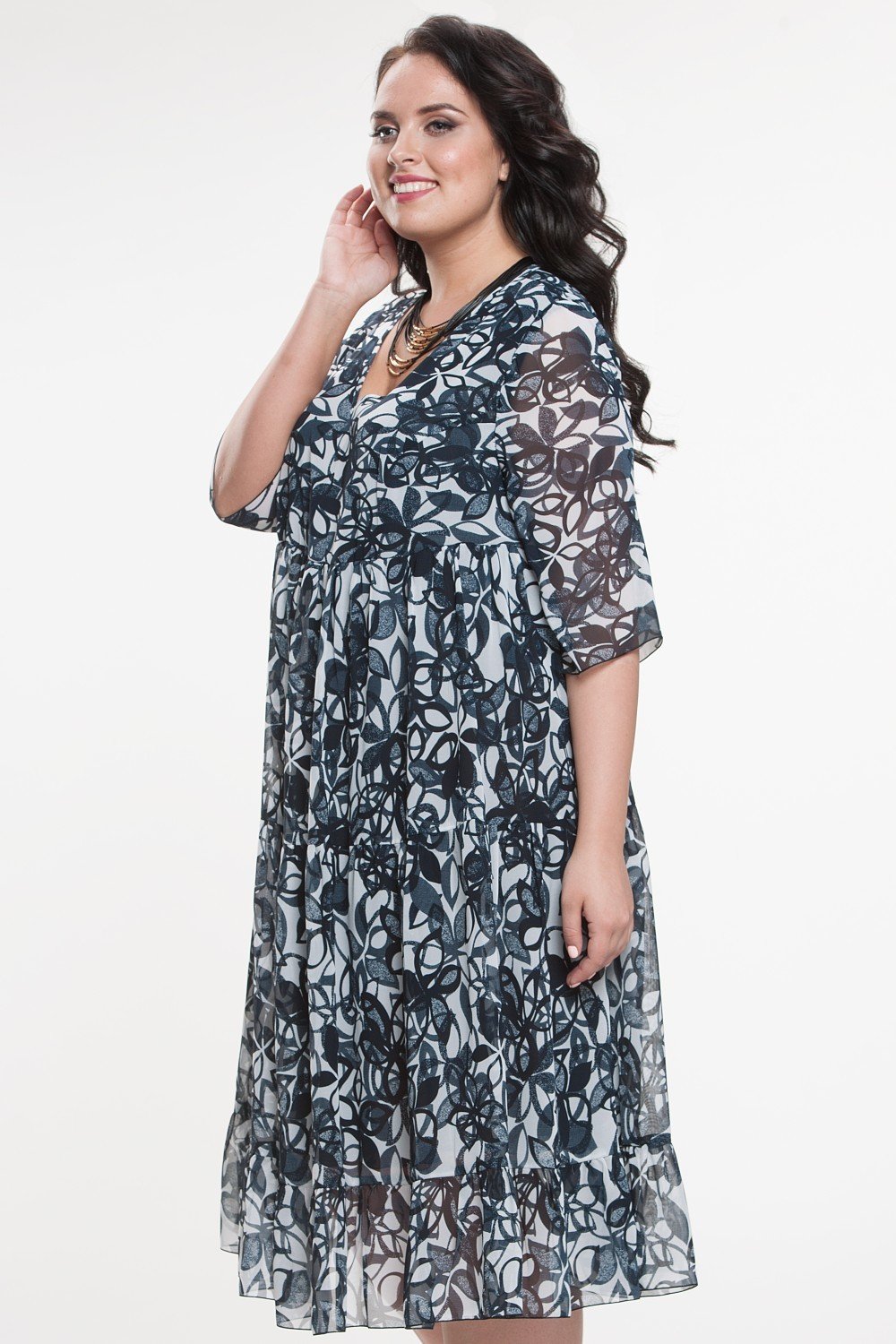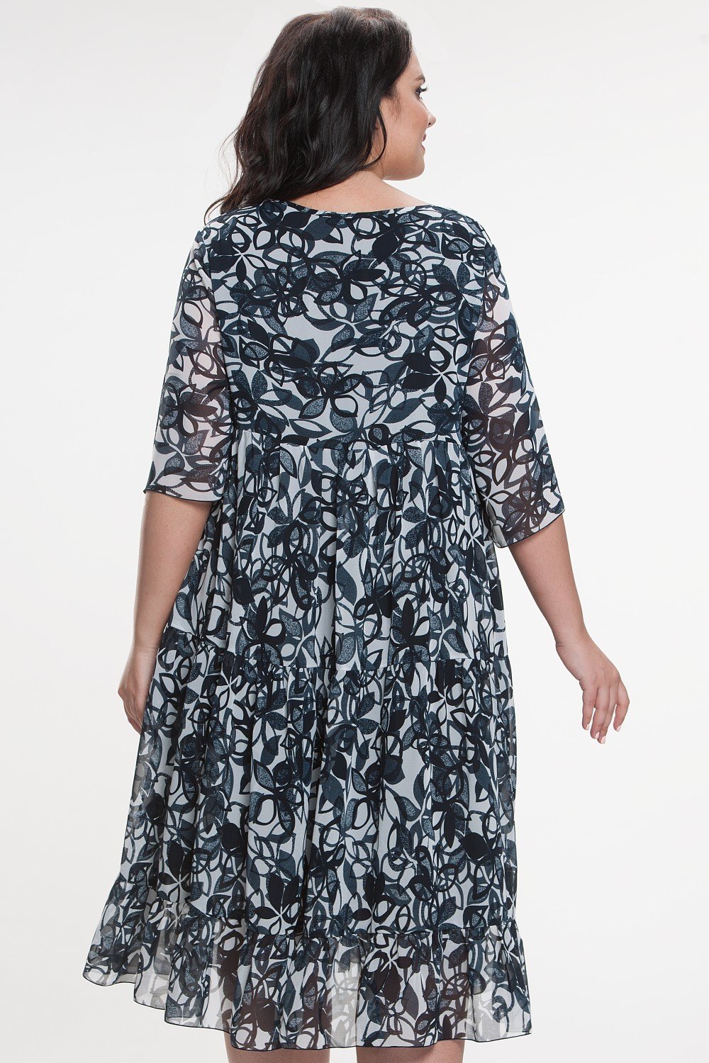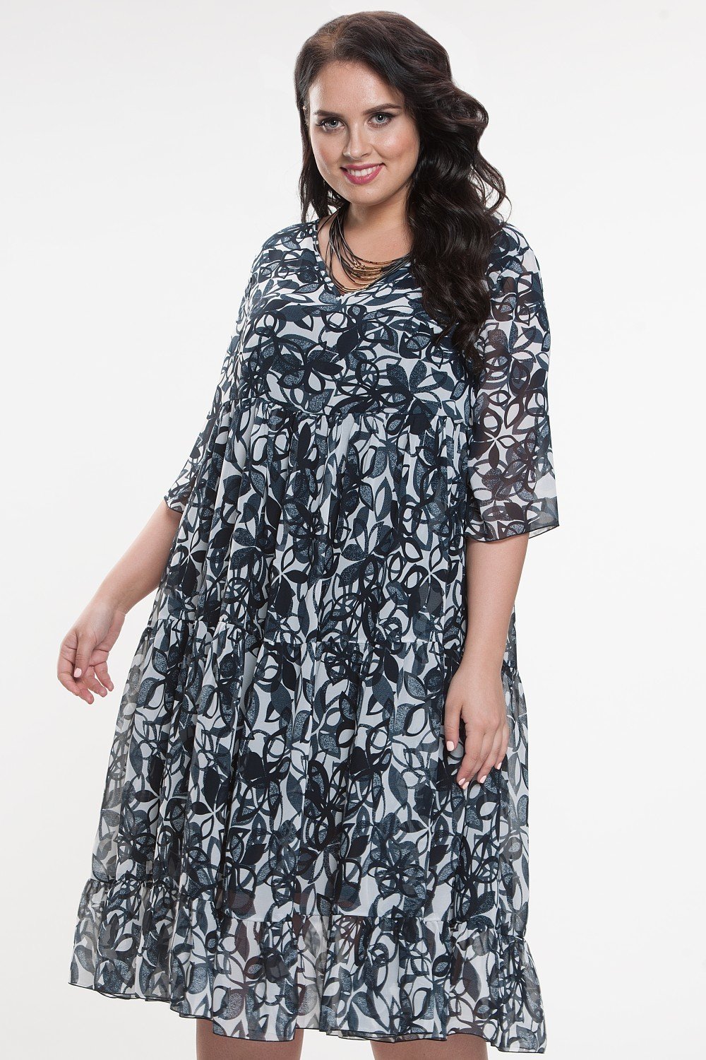 Платья из набивного шифона, трапецевидного силуэта. Горловина V-образная. Рукав втачной 3/4. Нижняя часть платья состоит из 4-х присборенных воланов. На фото модель 52 размера, рост 174 см. С подкладом.