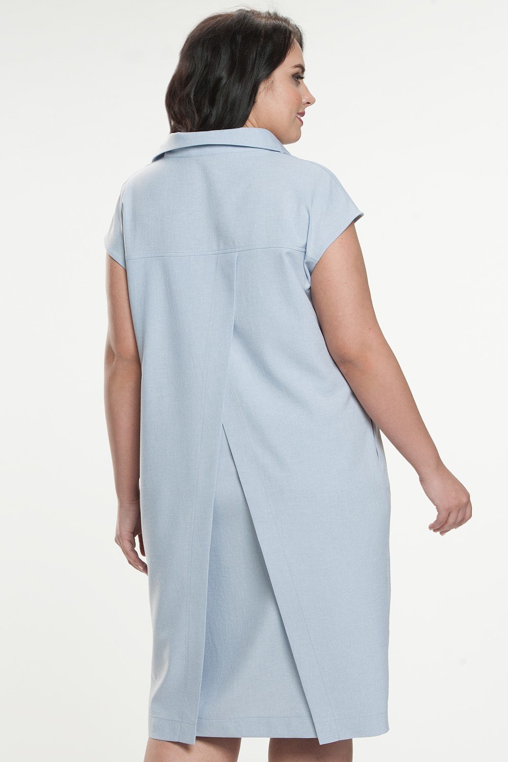 Платье полуприлегающего силуэта, с карманами в боковых швах, по низу с разрезами из полульняной ткани. Плечо спущенное, V-образная горловина с воротником на стойке. Спинка двойная с плечевой кокеткой, нижняя часть спинки двухслойная за счет отлетной детали уложенной по шву кокетки с запахом. Отлетная деталь спинки входит в боковые швы и шов кокетки. На фото модель 52 размера, рост 174 см.