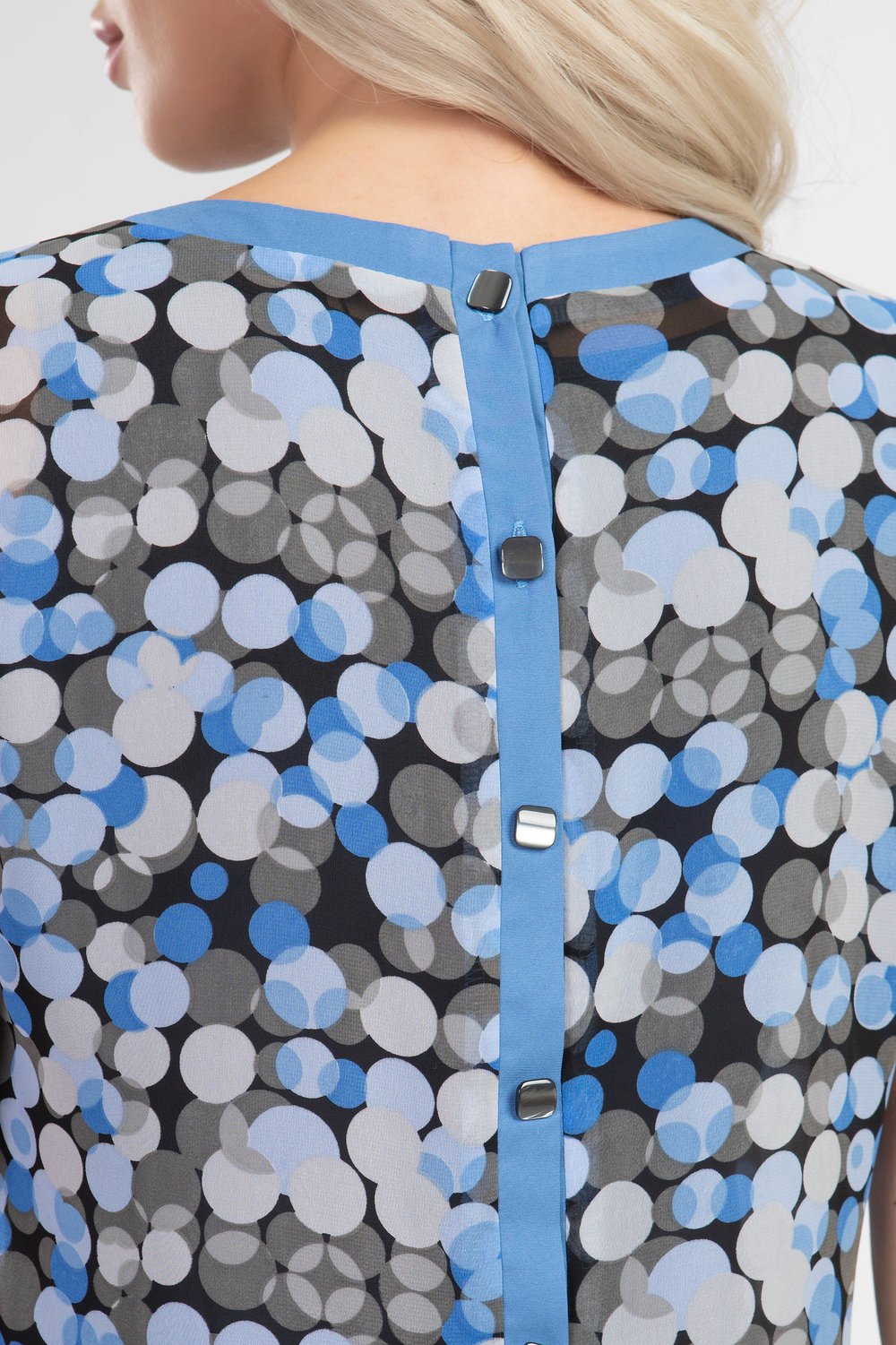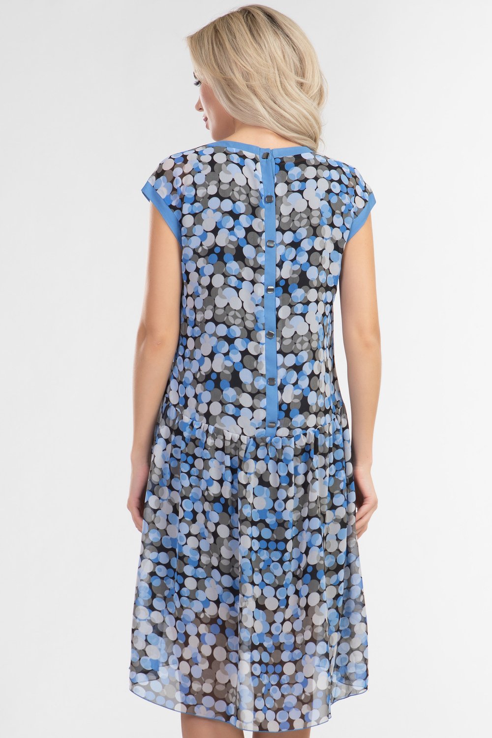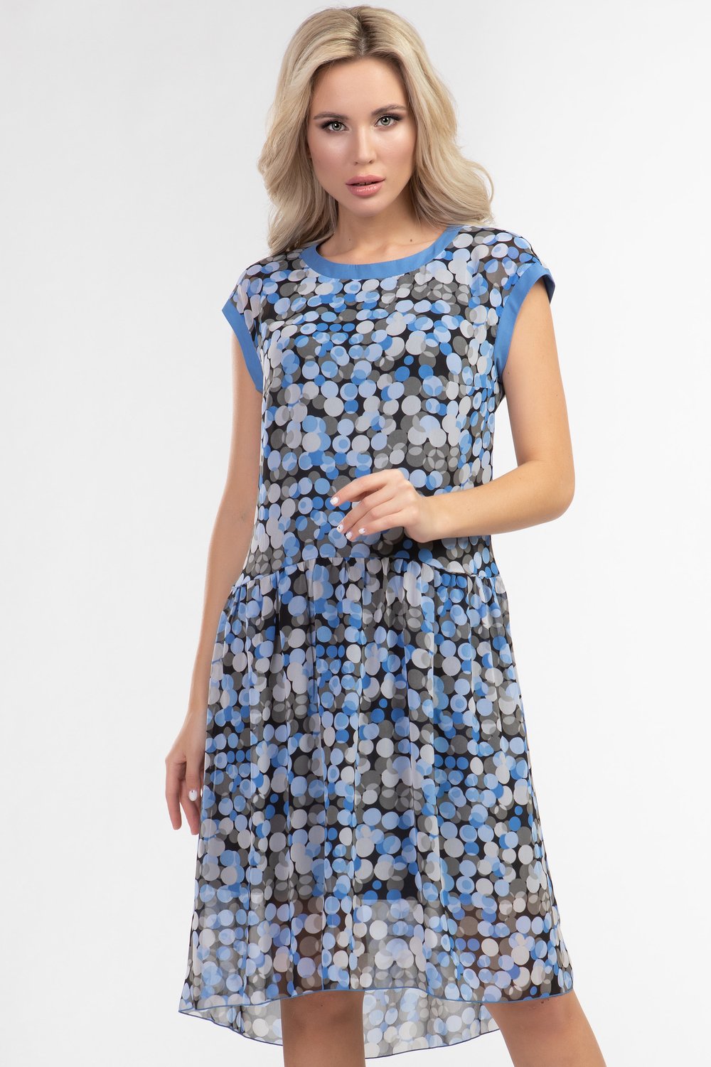 Стильное молодежное платье из шифона! Свободный силуэт, пышная юбка отрезная ниже талии. Платье с разноуровневым низом, по переду длина 91 см. Круглая горловина, приспущенный рукав.По горловине, проймам отделка контрастной тканью, по спинке планка с пуговицами. С подкладом. На фото модель 52 размера, рост 174 см.