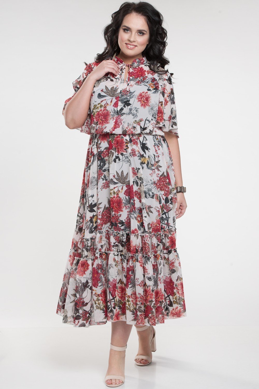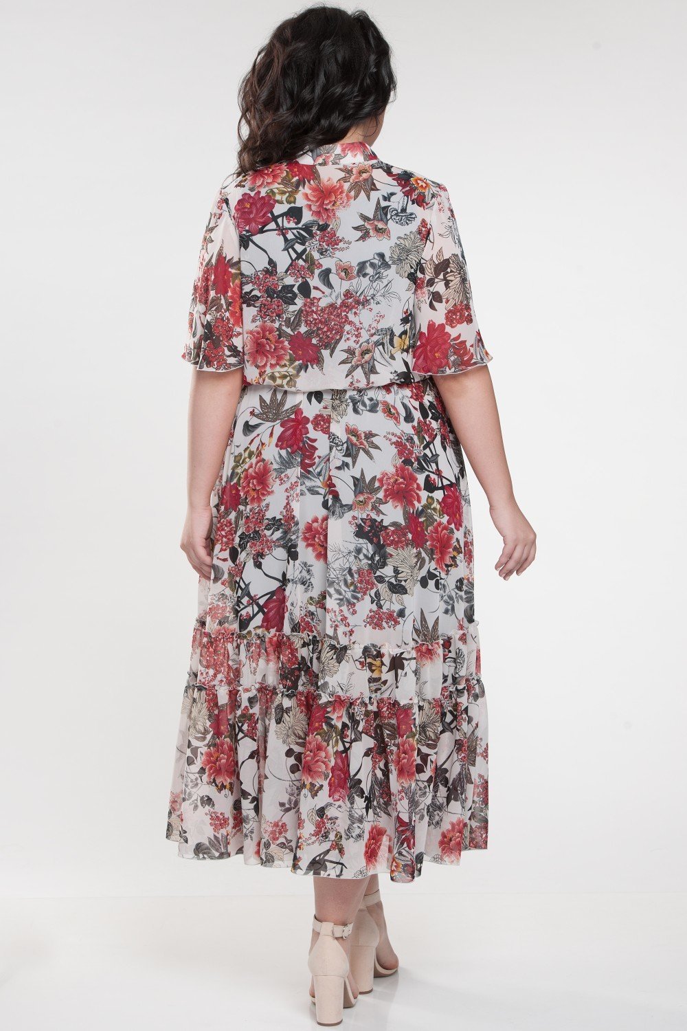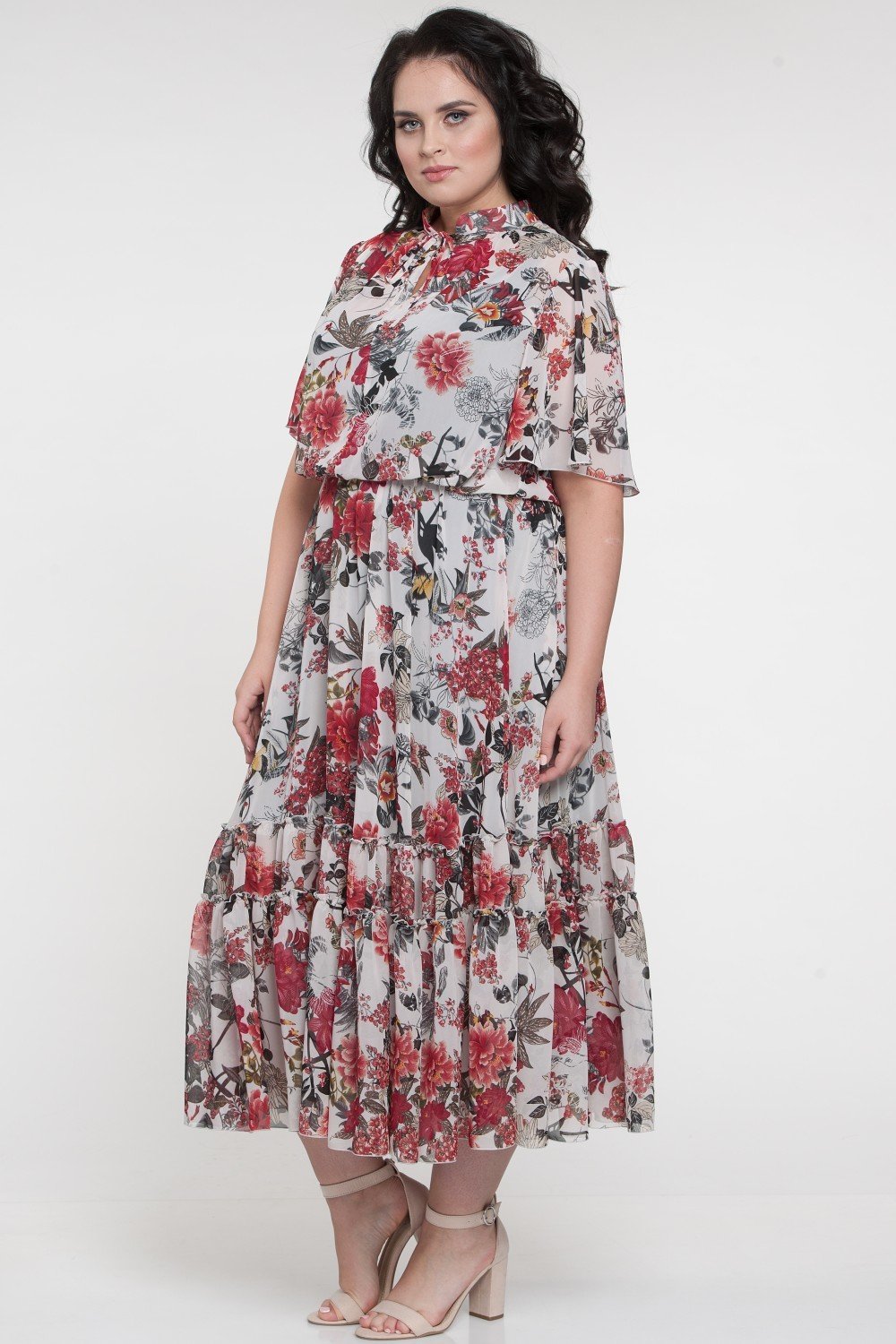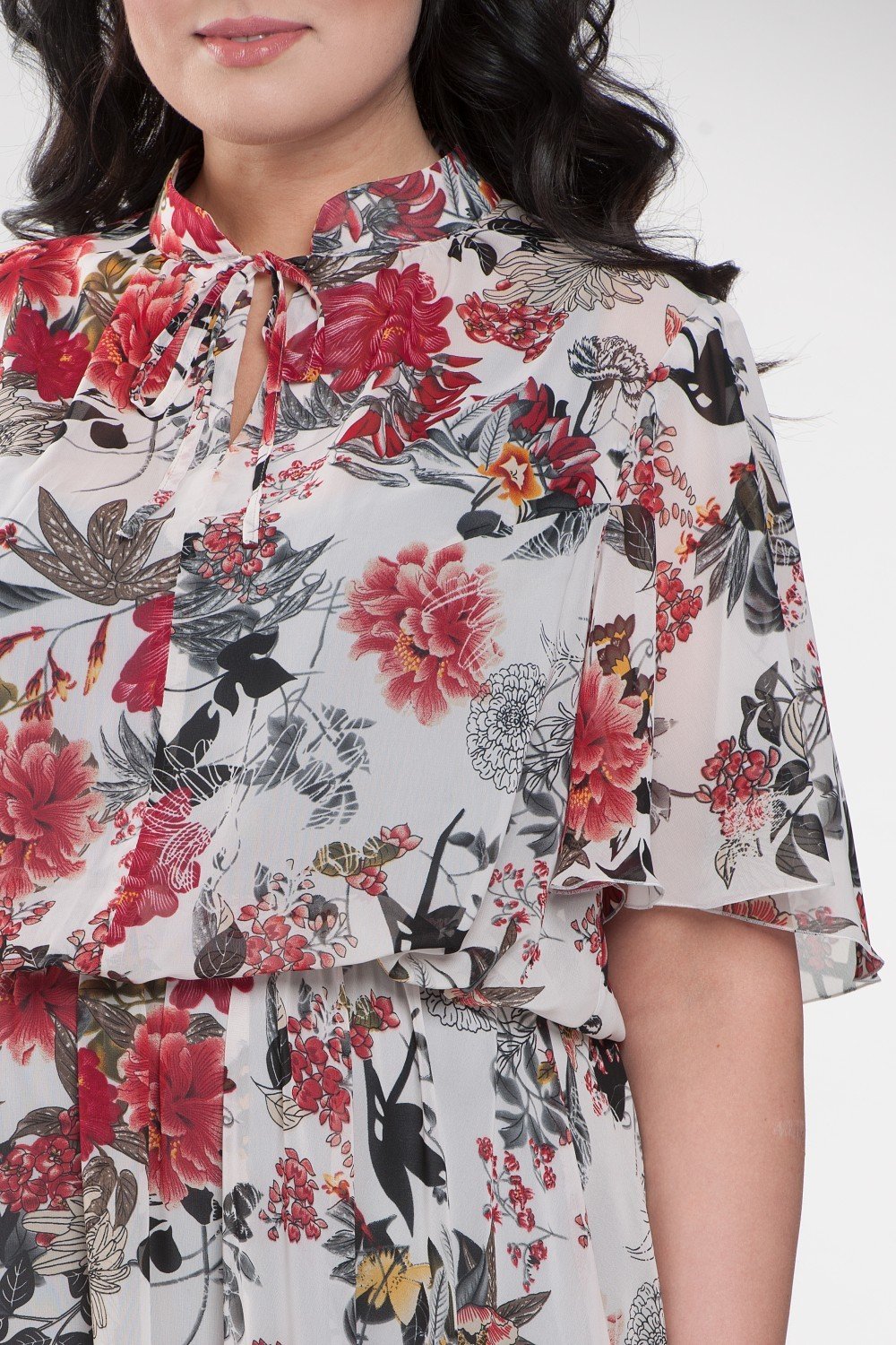 Платье из струящегося шифона отрезное по талии, на резинке. Воротник стойка с закругленными концами. Рукав крылышко. В среднем шве переда разрез по горловине, от стойки притаченны завязки из окантованной бейки. Трапецевидная юбка четырехклинка, по низу юбки двойная оборка. К платью прилагается платье-майка из вискозы. На фото модель 52 размера, рост 174 см.