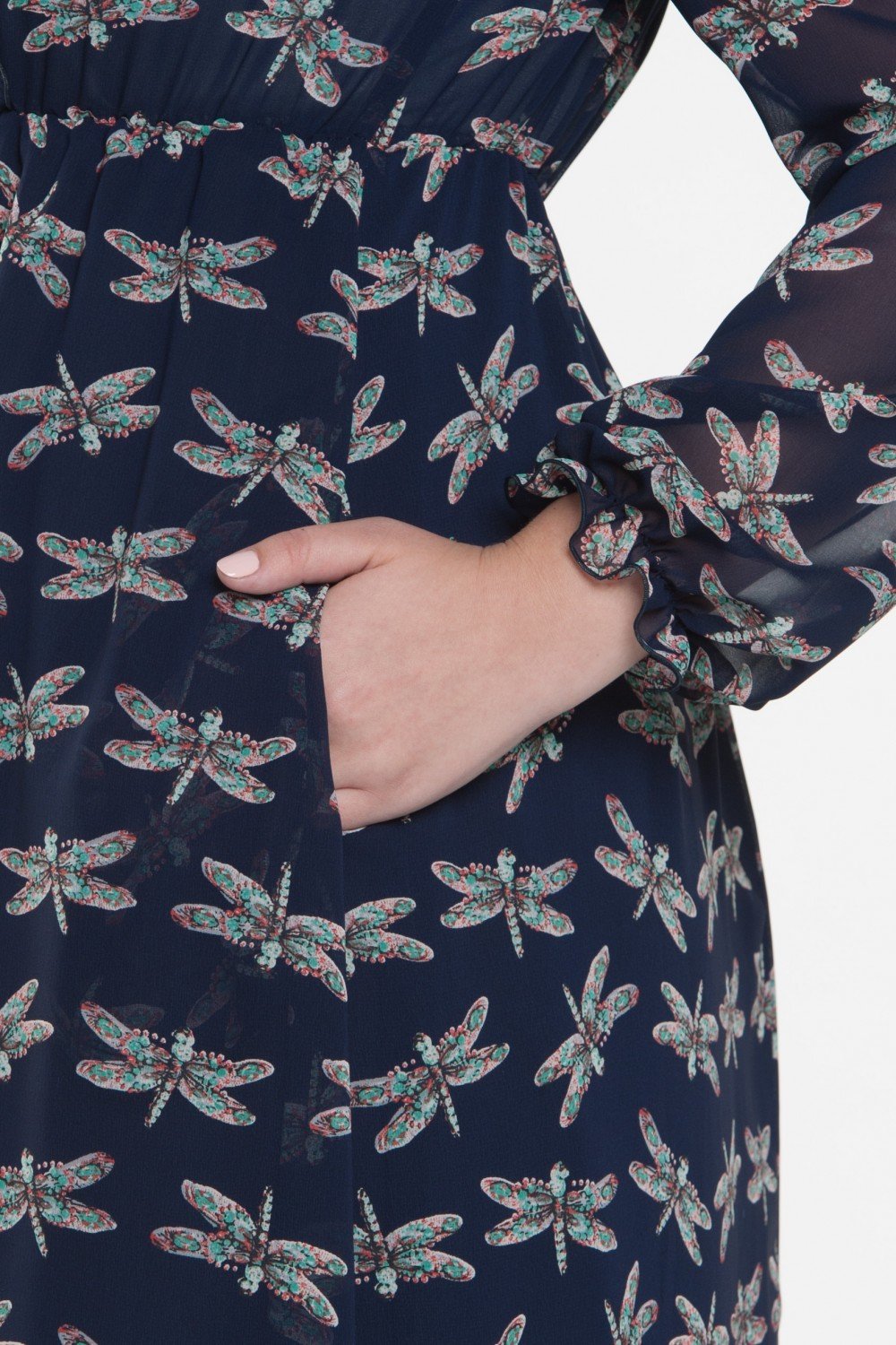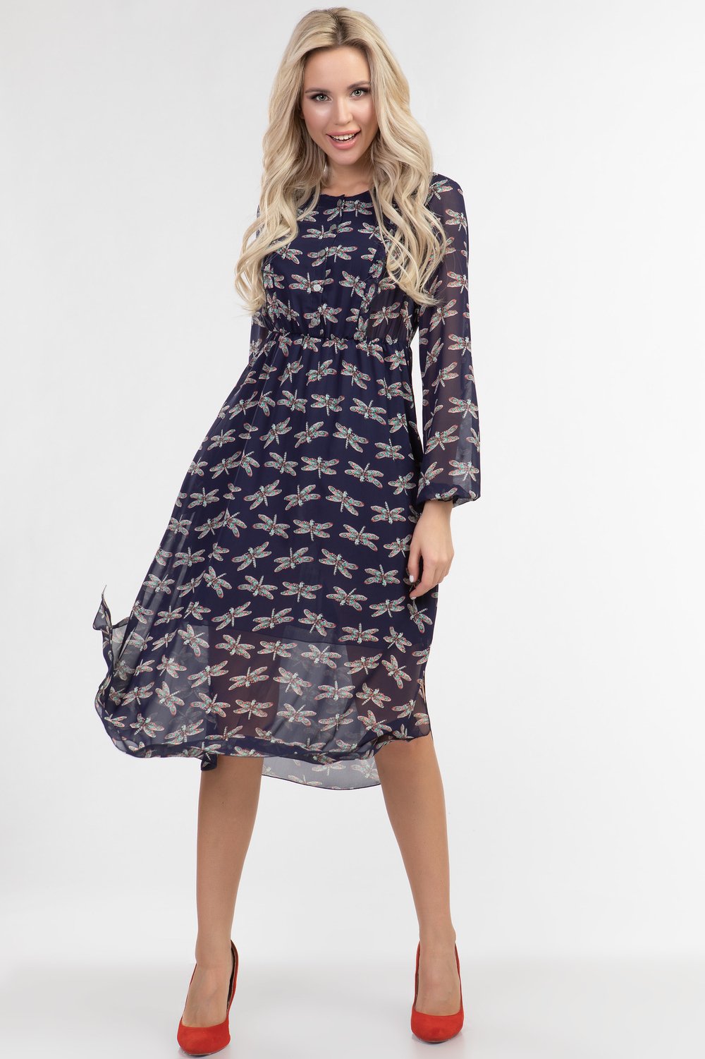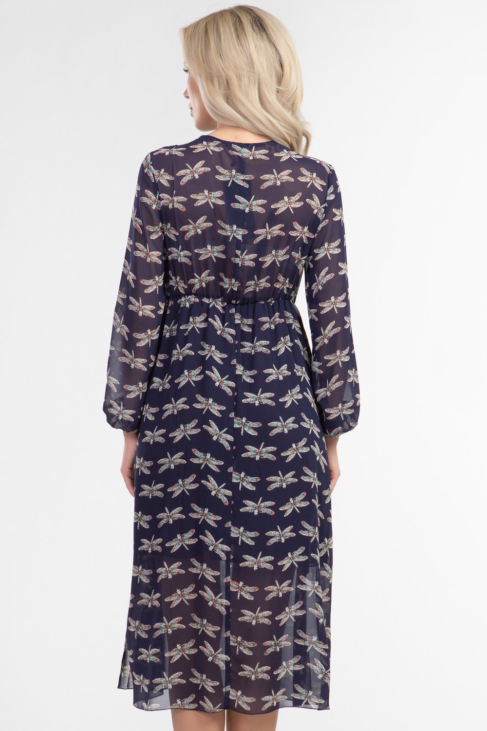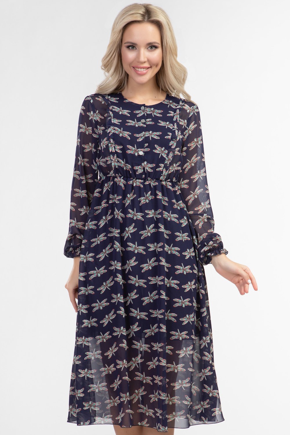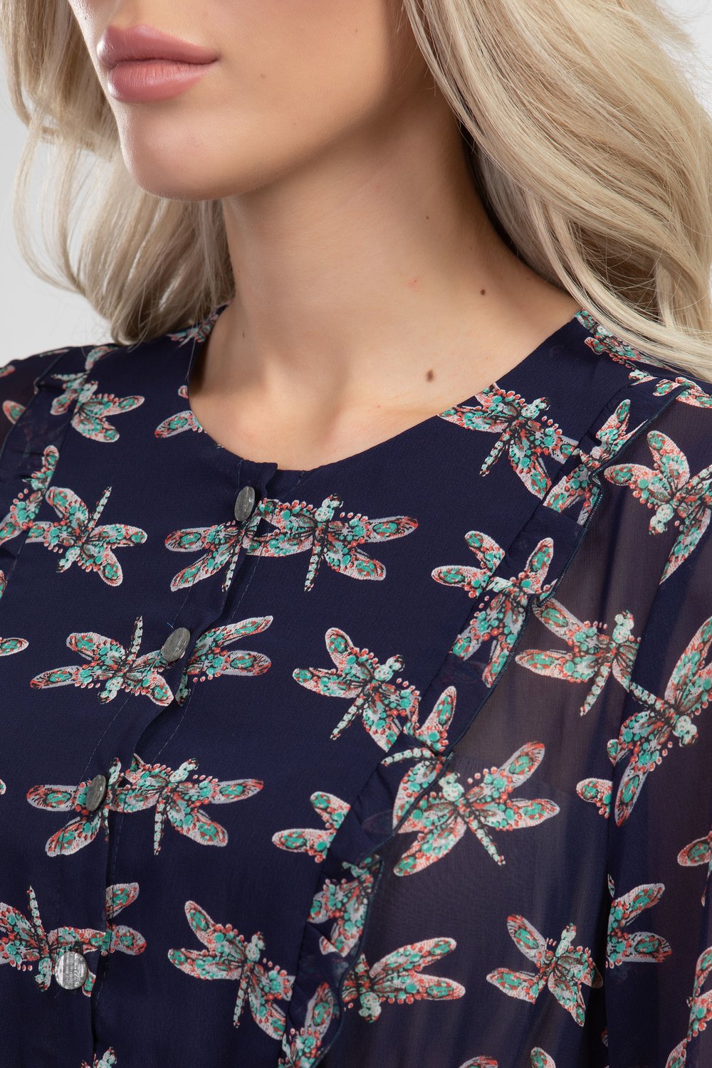 Платье из шифона прямого силуэта с завышенной талией на резине. Втачной полный рукав на резинке. По переду декоративные вертикальные рюши, петли и пуговицы до резины. Эффектное платье от Прима Линии. Верхняя часть платья без подклада, от пояса подклад- юбка. На фото модель 52 размера, рост 174 см.