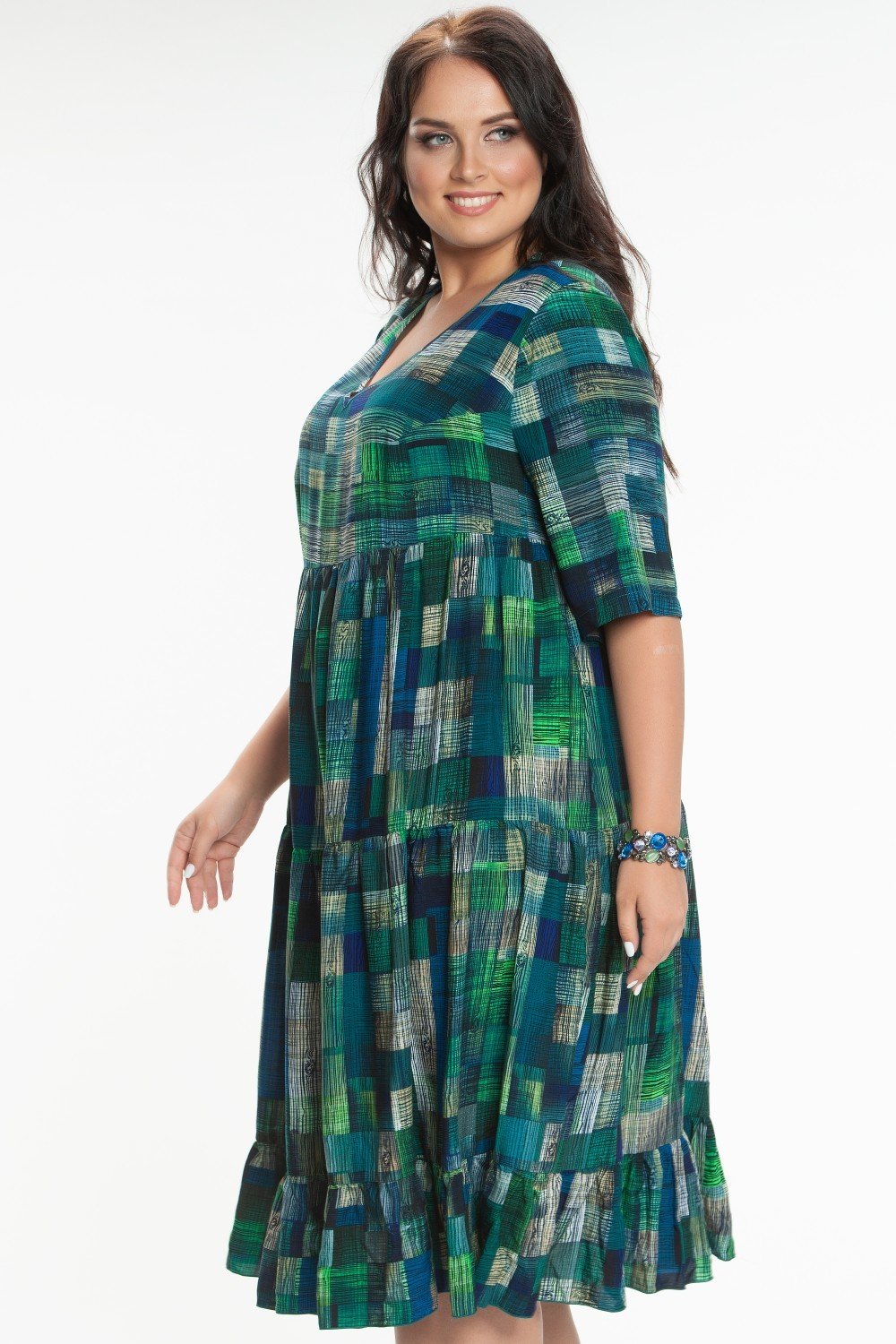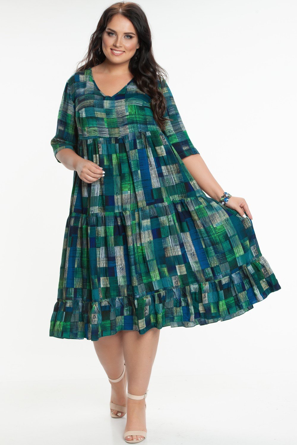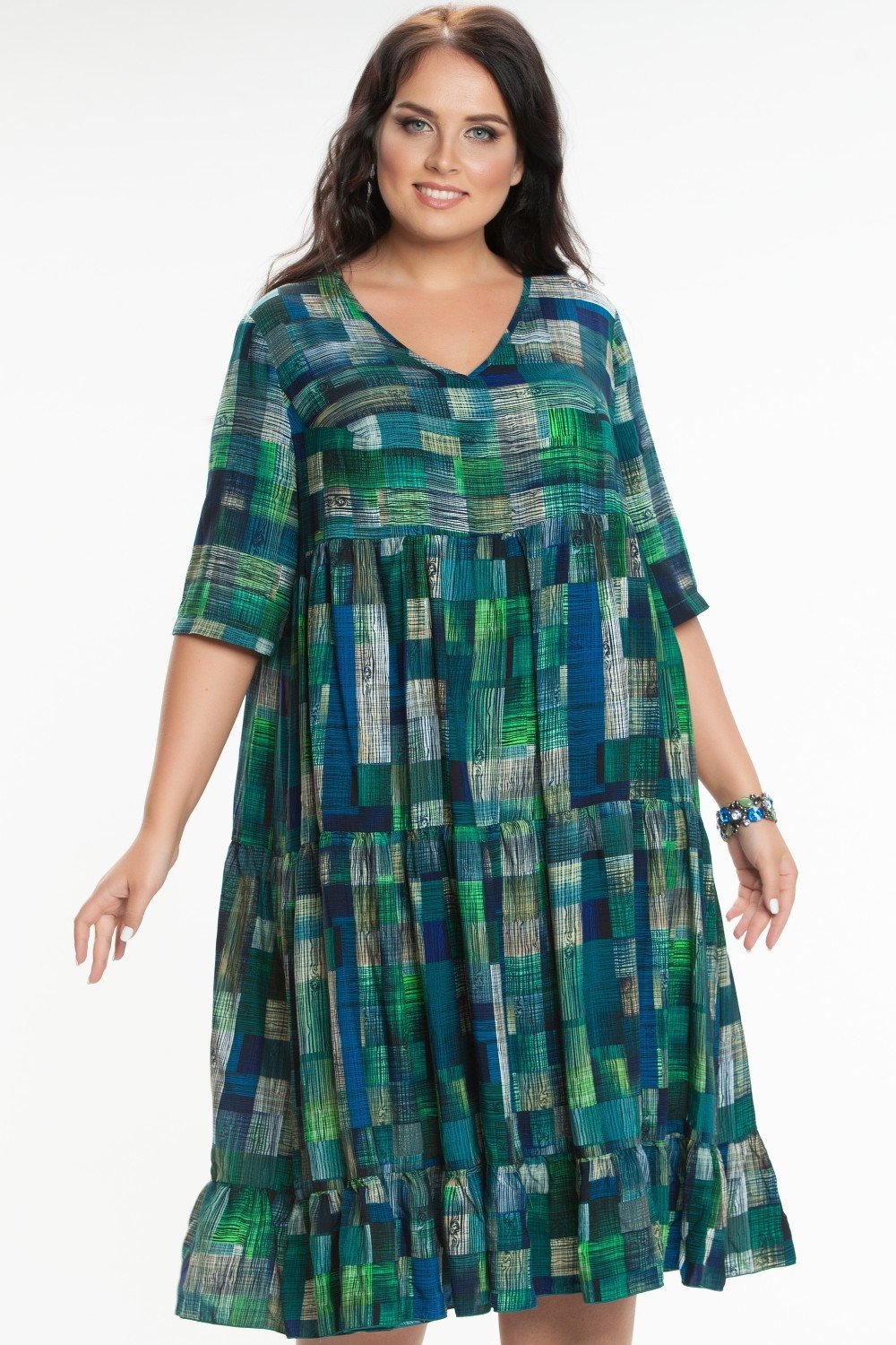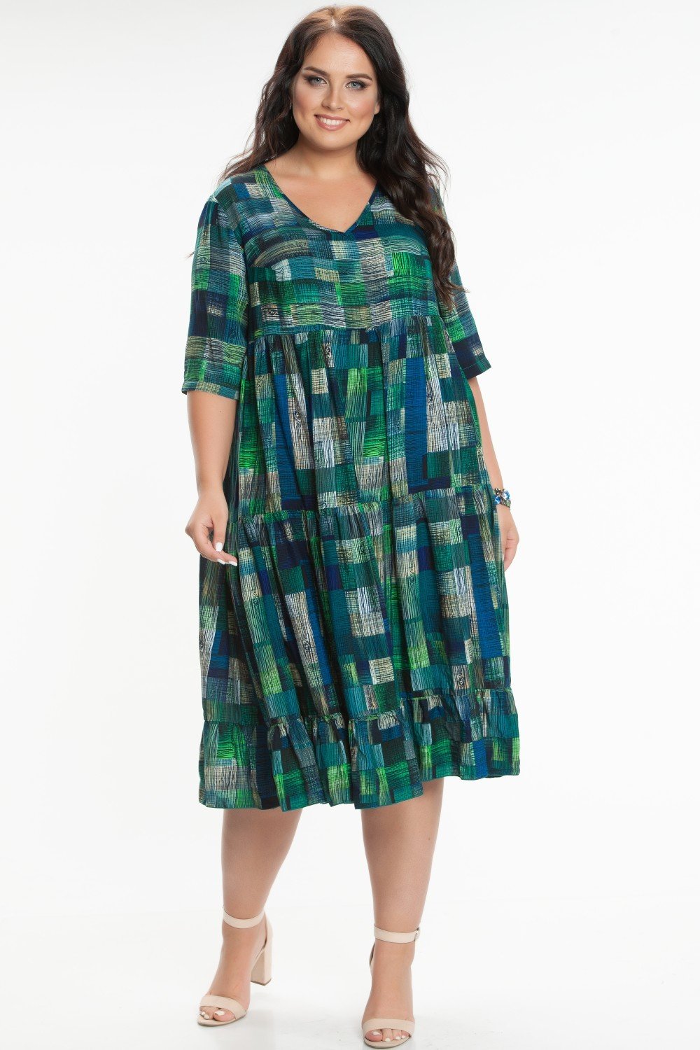 Платье из штапеля, трапециевидного силуэта. Горловина V-образная. Рукав втачной 3/4. Нижняя часть платья состоит из 3-х присборенных воланов. На фото модель 52 размера, рост 174 см. Платье без подклада.