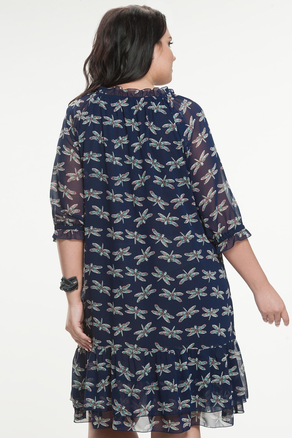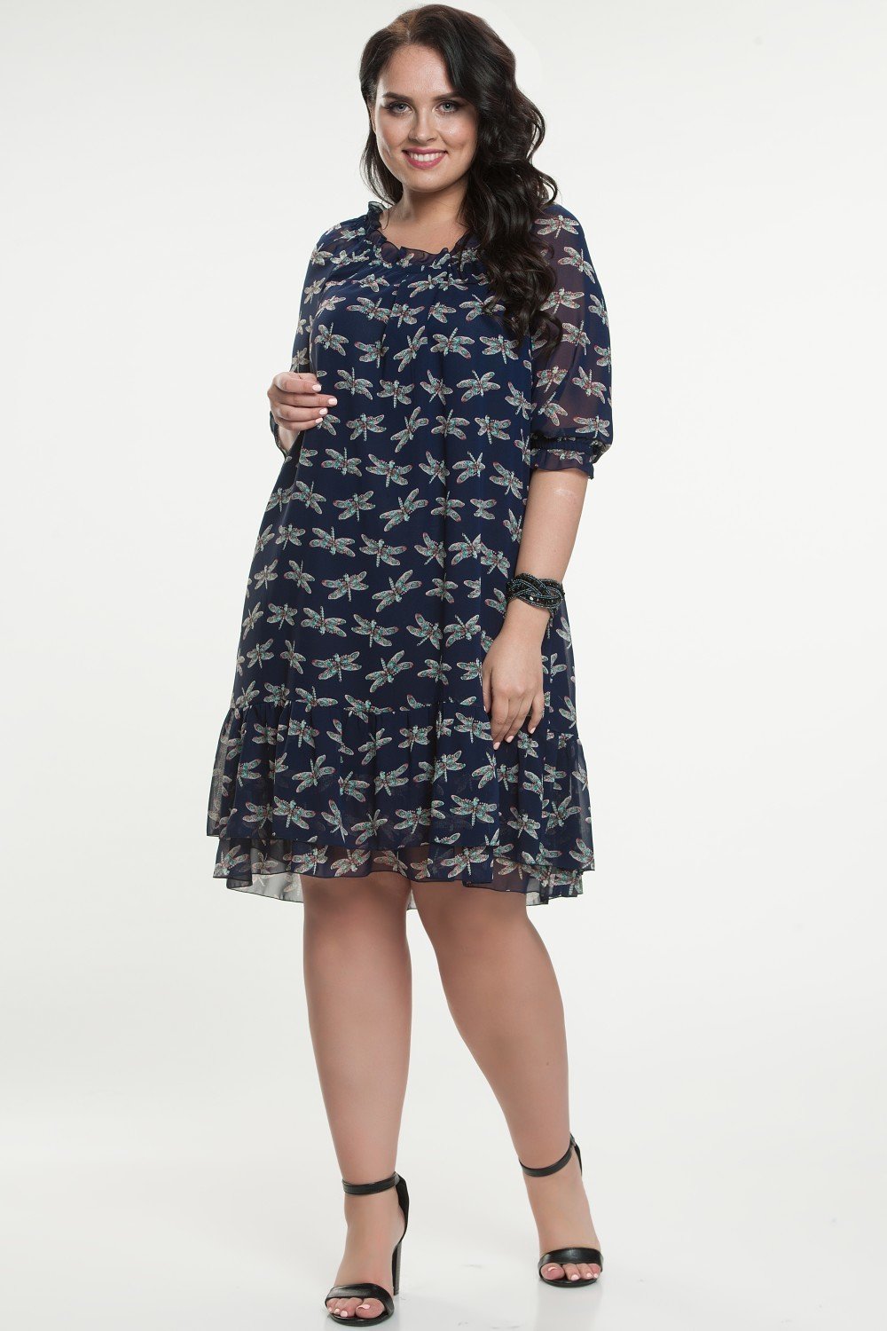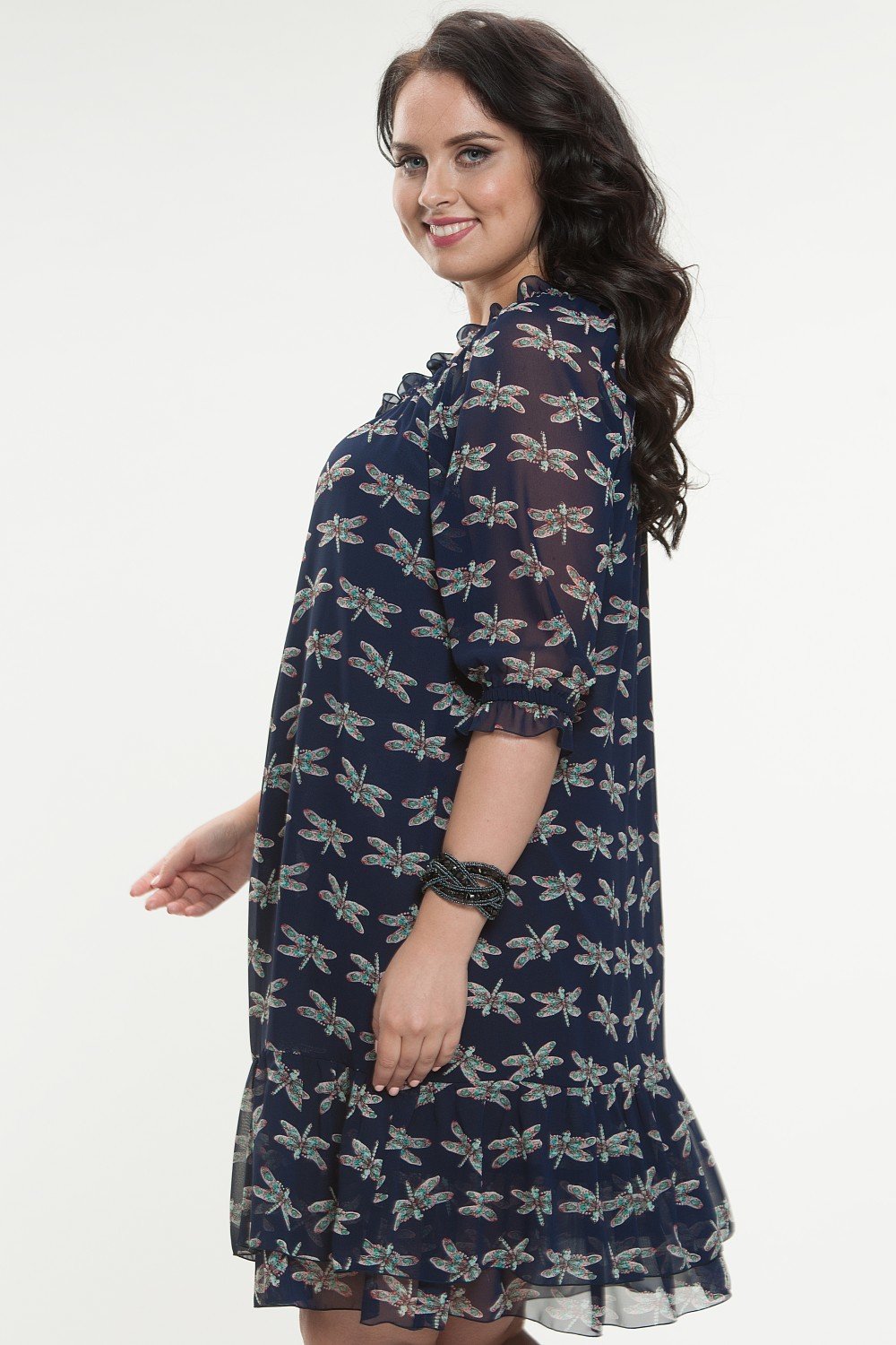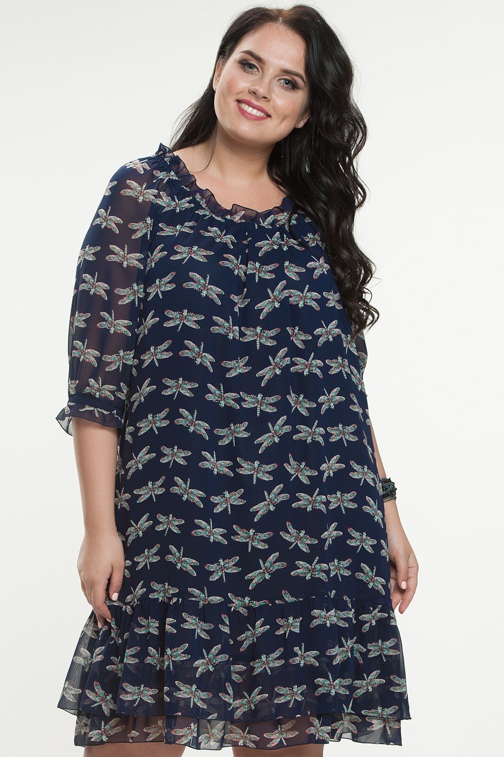 Платье А-образного силуэта из струящегося шифона. Горловина и низ рукава с оборкой, собраны на узкую резину. Перед и спинка с подкладом. Имеются два волана, нижний притачан к подкладу, верхний к основной ткани. Универсальное платье для любого случая и погоды. На фото модель 56 размера, рост 174см.