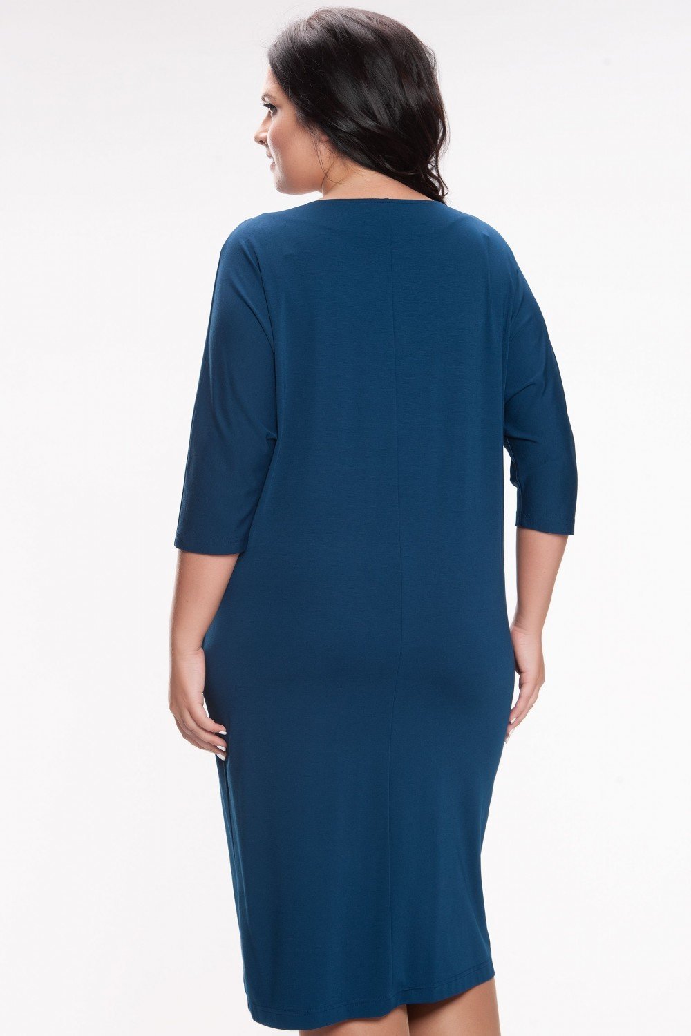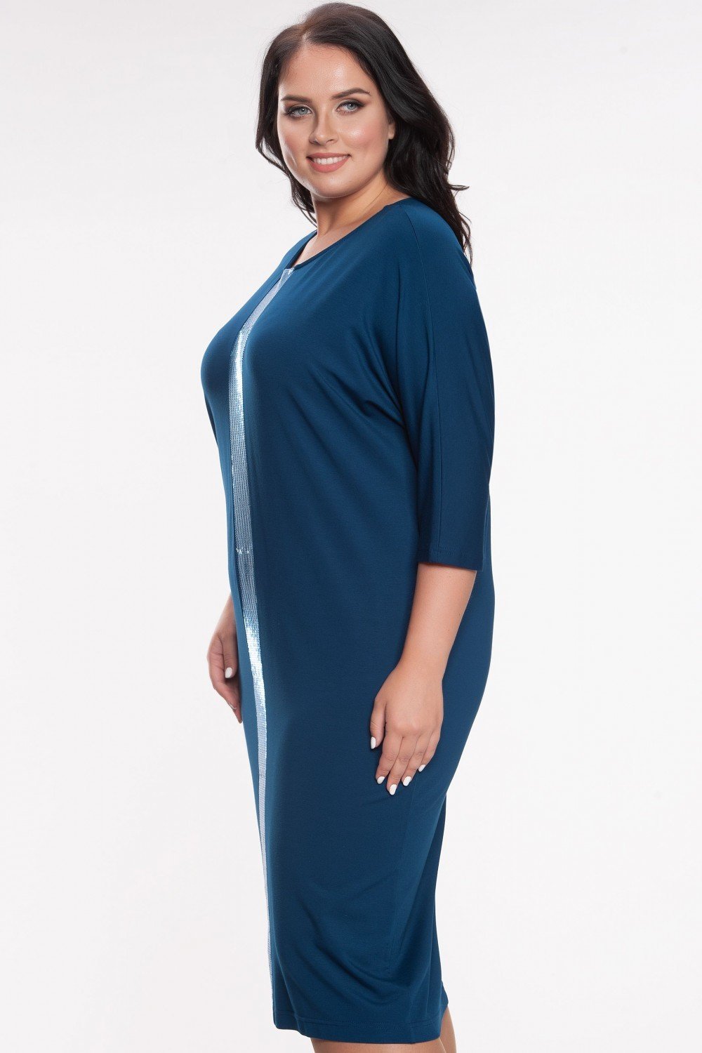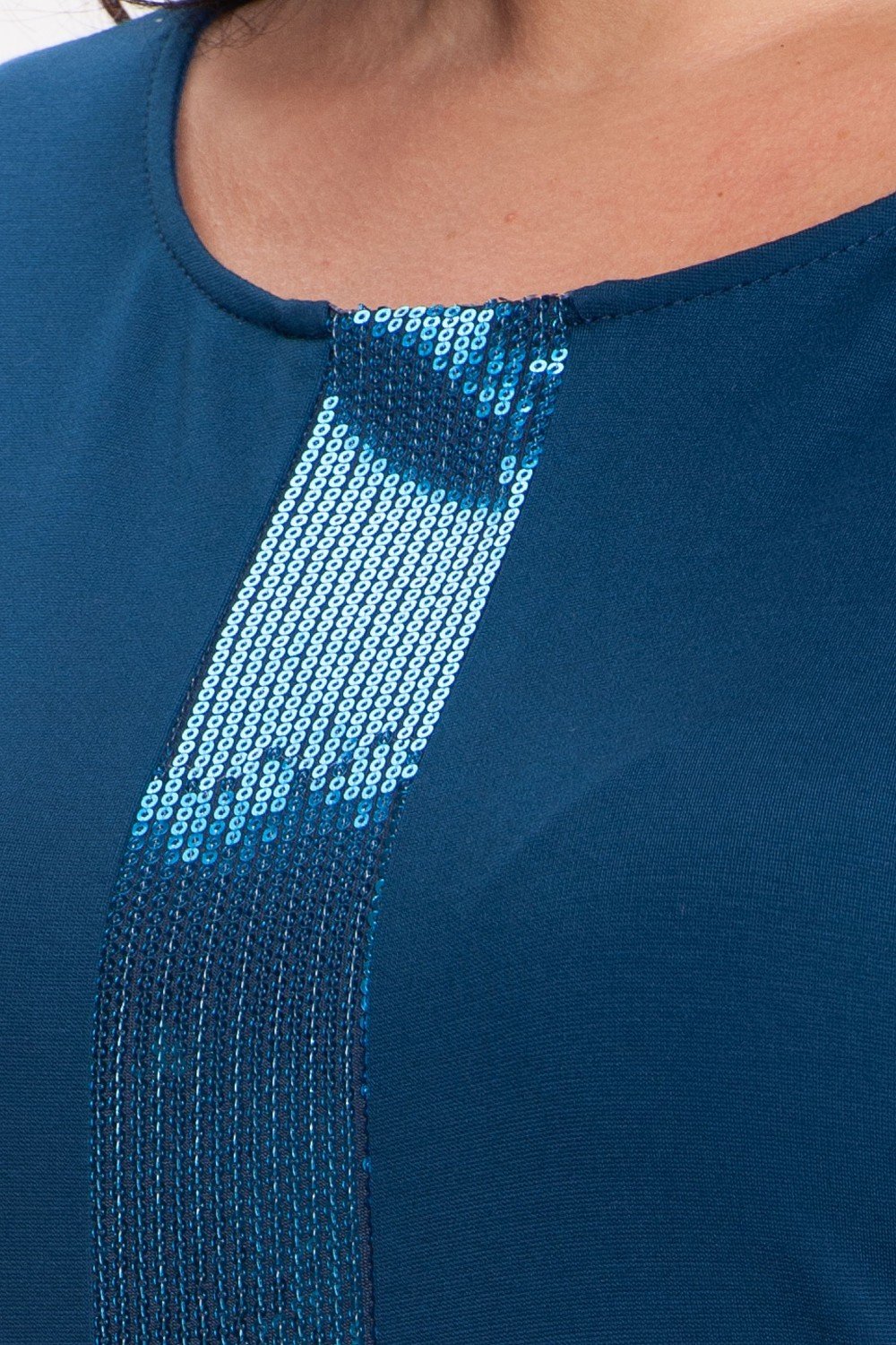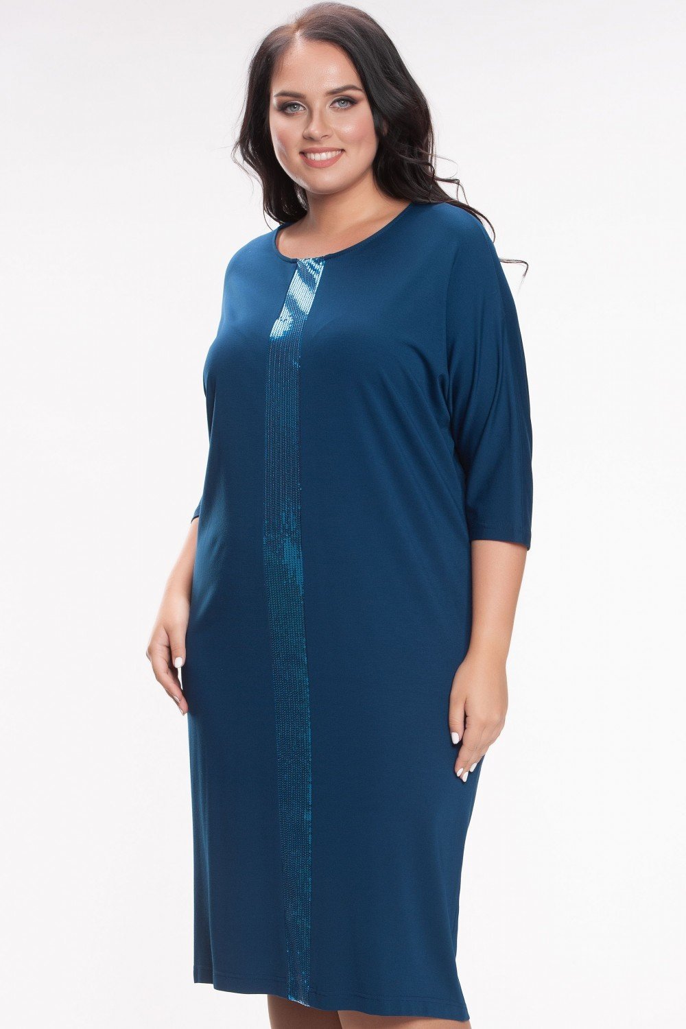 Стильное платье прямого силуэта, из мягкого вискозного полотна, цельнокроеный рукав 3/4 длины, горловина круглая, без застежки.Изюминка платья - по переду вертикальная вставка из пайеток вдоль всего платья.; На фото модель 46 размера, 171 см.