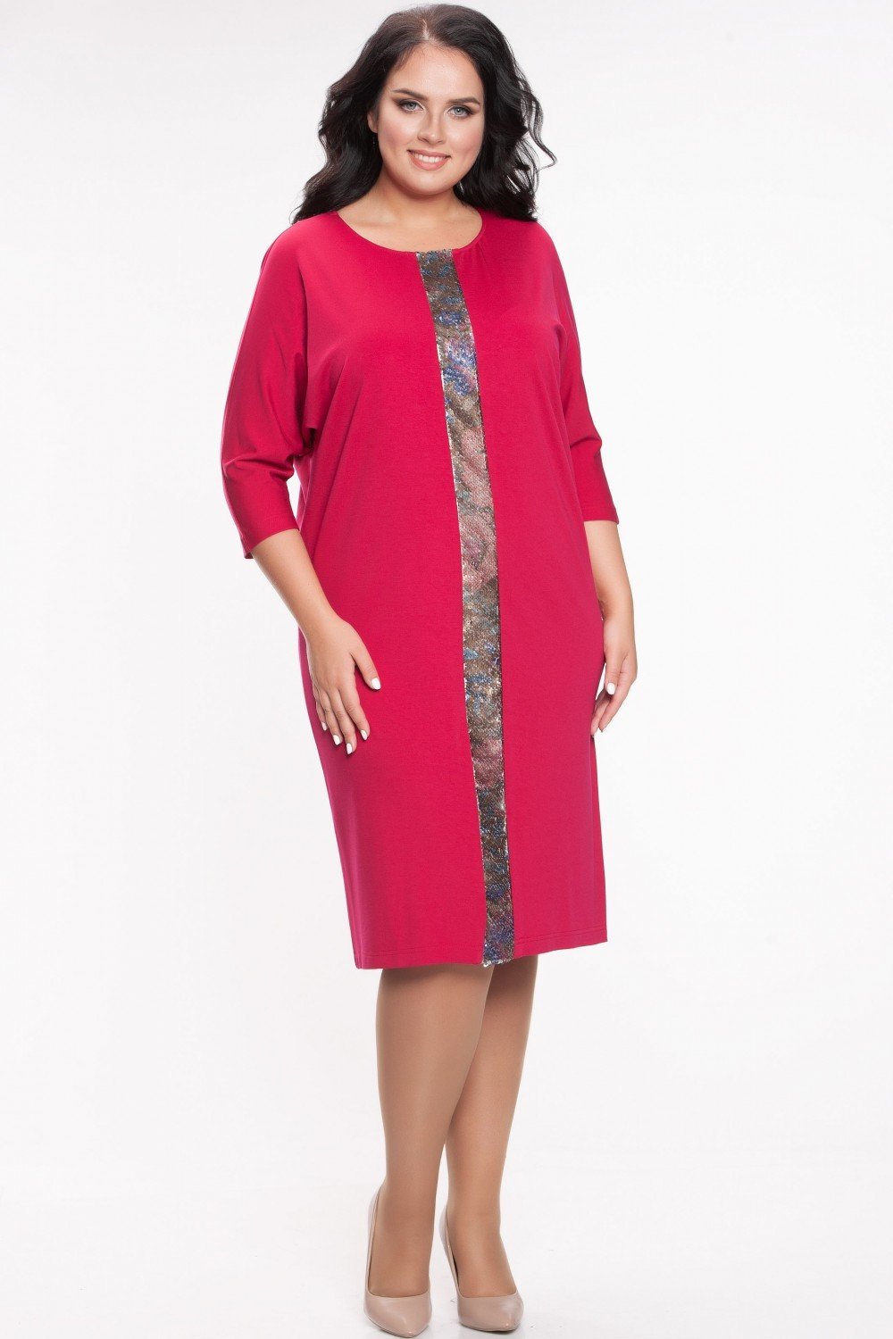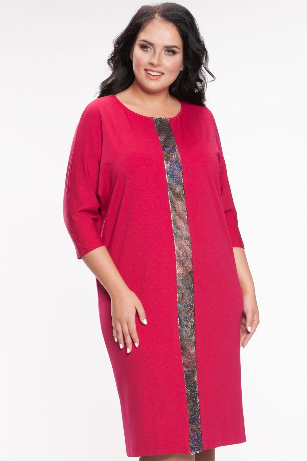 Стильное платье прямого силуэта, из мягкого вискозного полотна, цельнокроенный рукав 3/4 длины, горловина круглая, без застежки. Изюминка платья - по переду вертикальная вставка из пайеток вдоль всего переда.; На фото модель 46 размера, 171 см.
