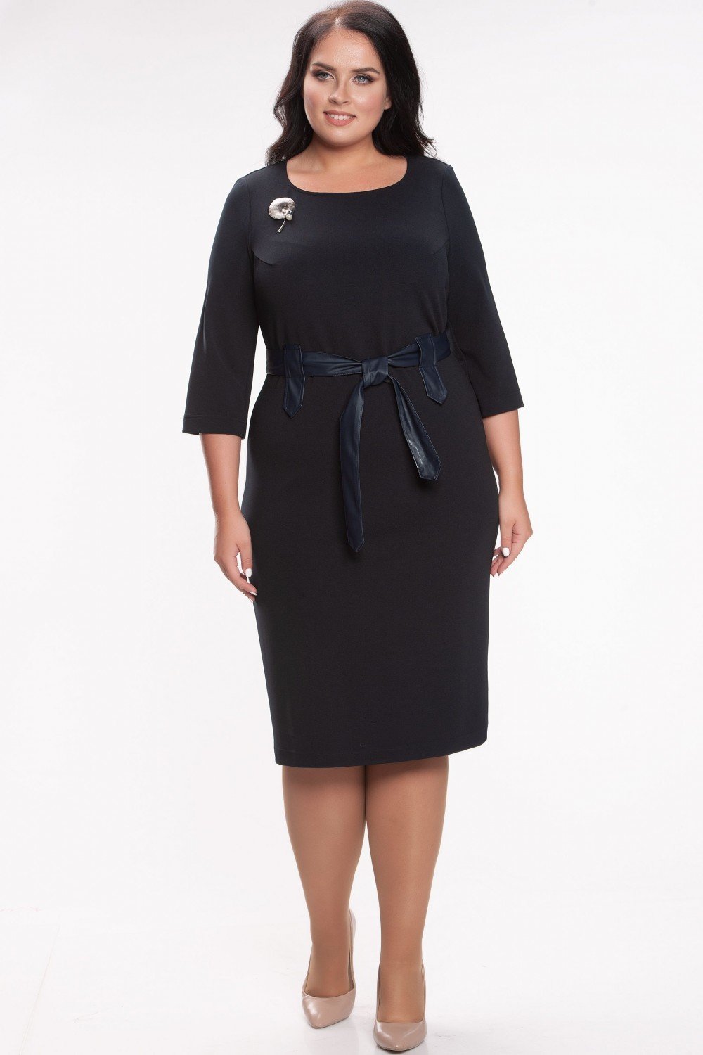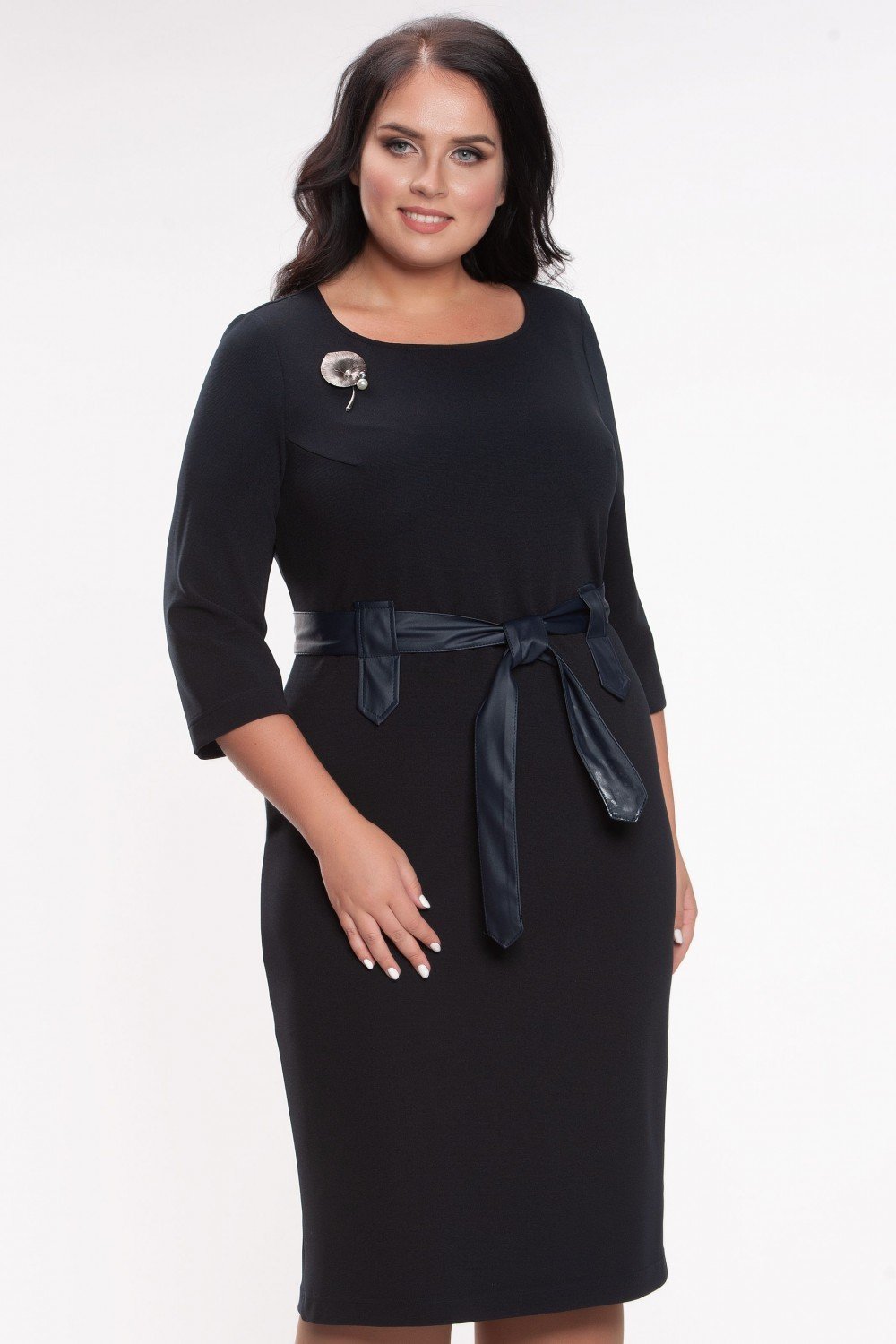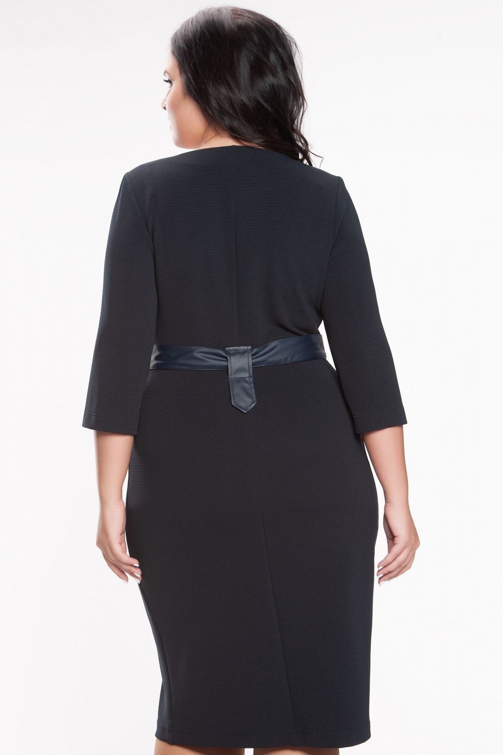Платье-футляр классического прямого силуэта из темно-синего трикотажного полотна. Рукав 3/4. Горловина круглая без застежки. Изюминкой данной модели являются шлевки, выполненные из темно-синей искусственной кожи и пояс из того же материала. На фото модель 46 размера, рост 171см.