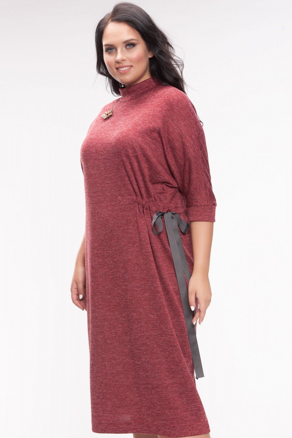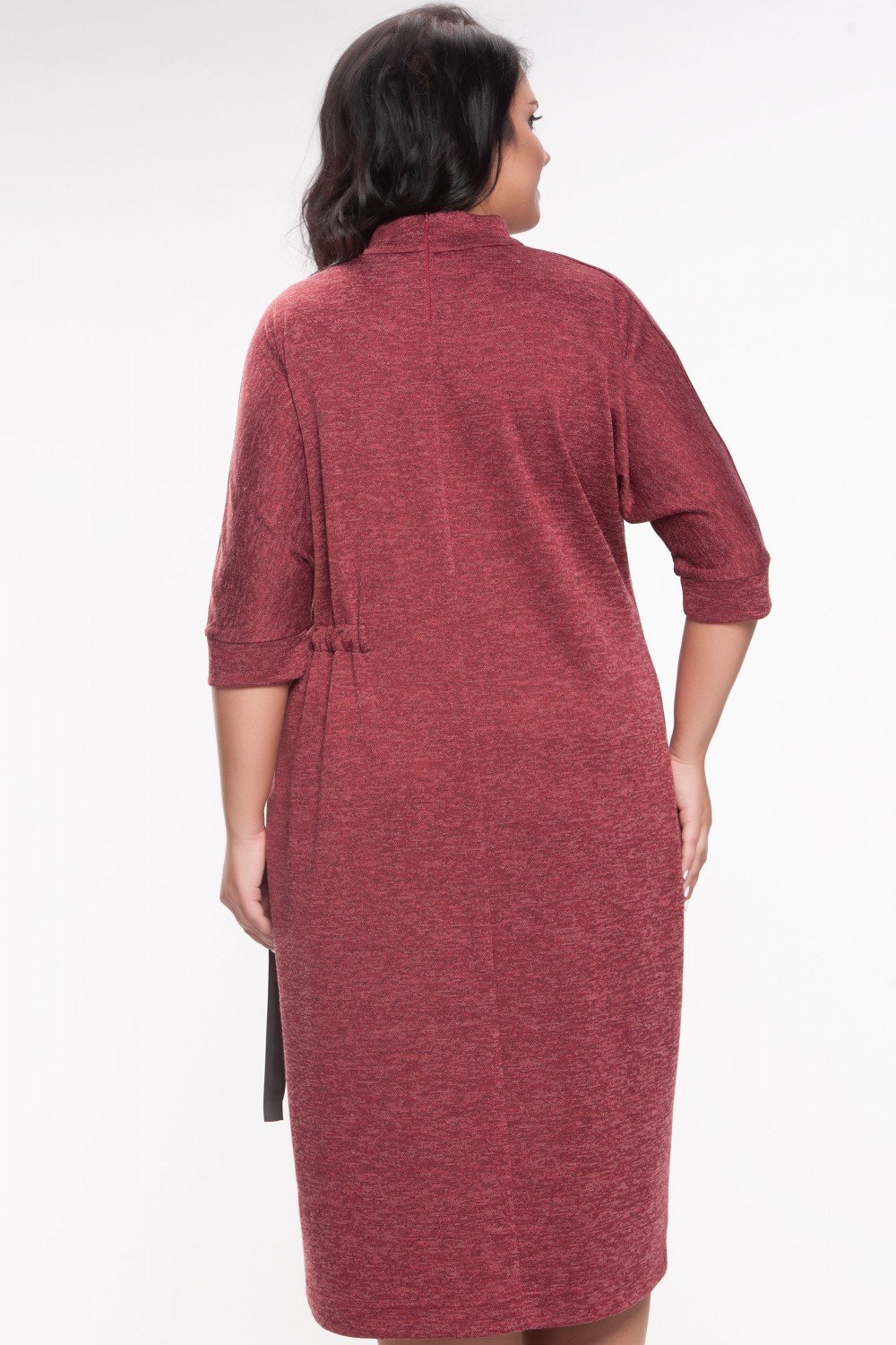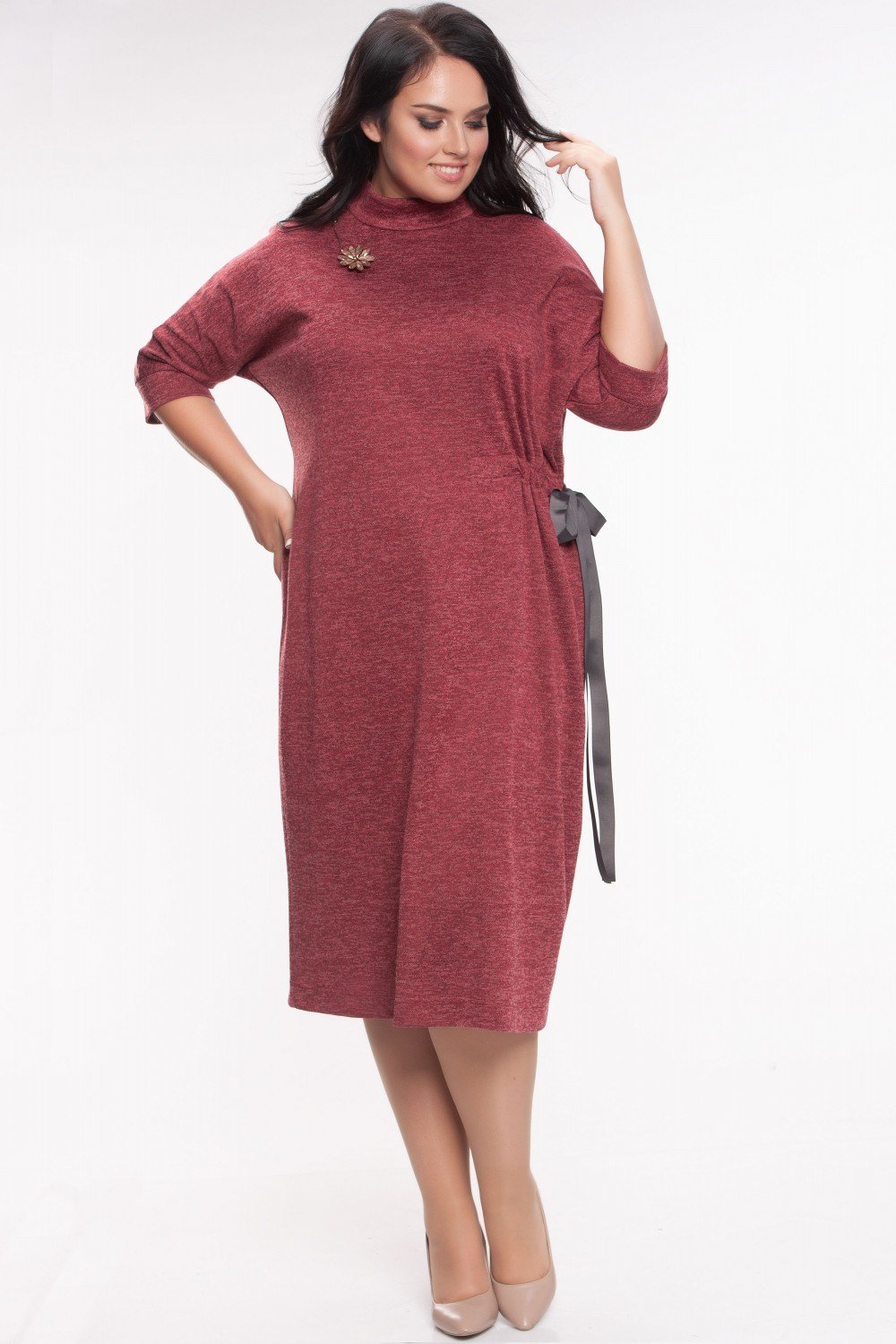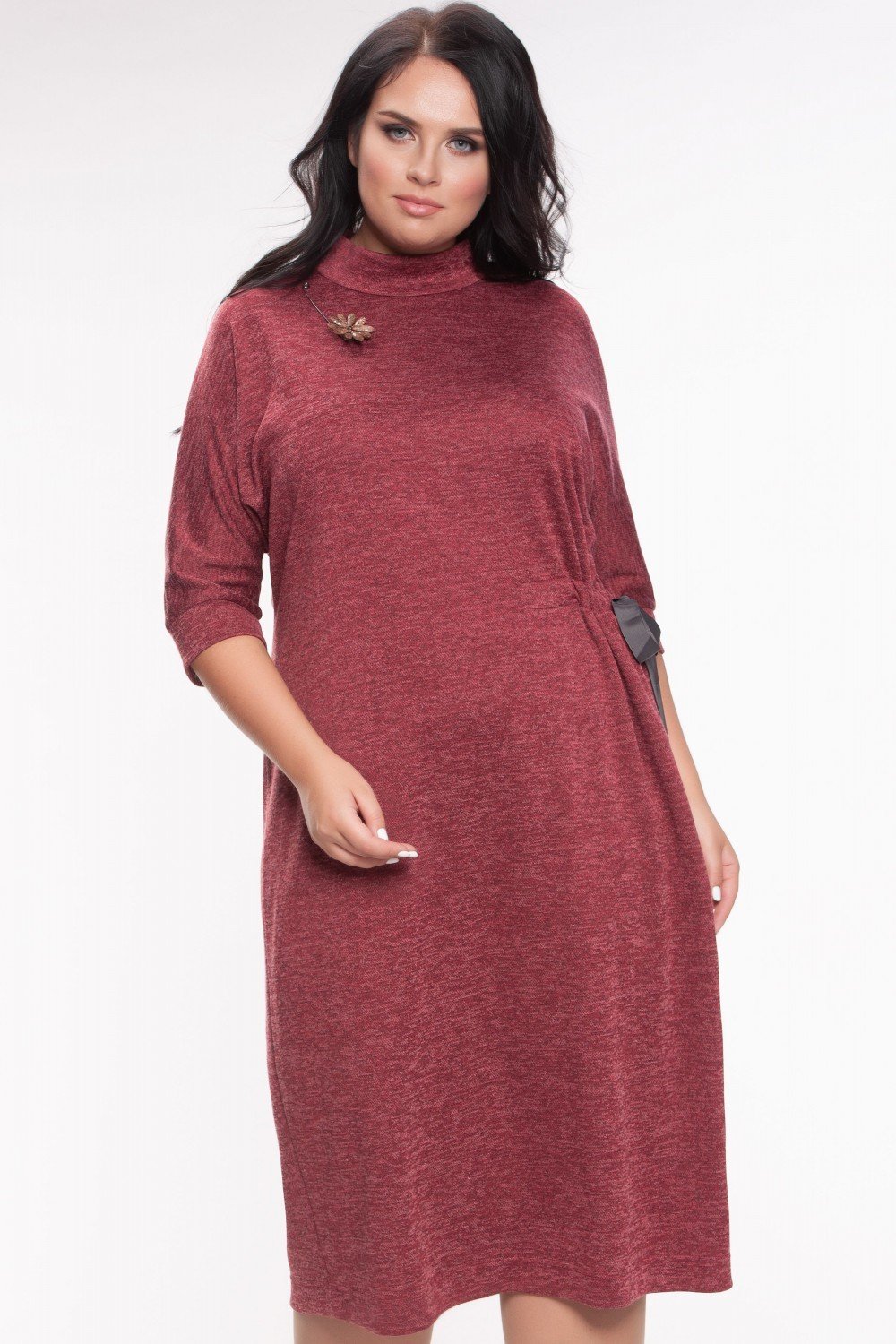 Стильное платье из приятного к телу трикотажа, винный цвет, меланж. Цельнокроенный рукав, воротник стоечка, сбоку идет потайная сборка репсовой лентой, которая завязывается в бант. По спинке горловины замочек 12 см. На фото модель 46 размера, рост 171 см.