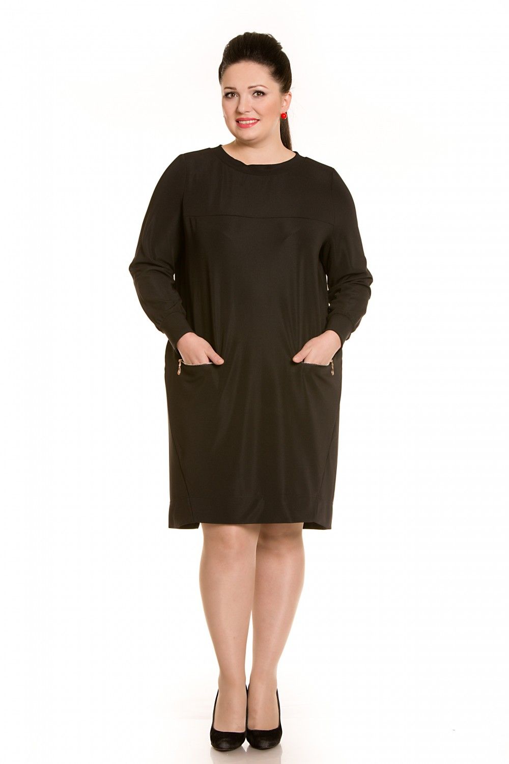 Разноуровневое платье черного цвета прямого силуэта на кокетке, втачной рукав на манжете.В боковом шве декоративная разноуровневая вставка из основной ткани. Подробно этот элемент можно рассмотреть на фотографии в карточке товара. Платье декорировано карманами с молниями.По спинке шов.Горловина обработана трикотажной бейкой.; На фото модель 56 размера, рост 174 см.