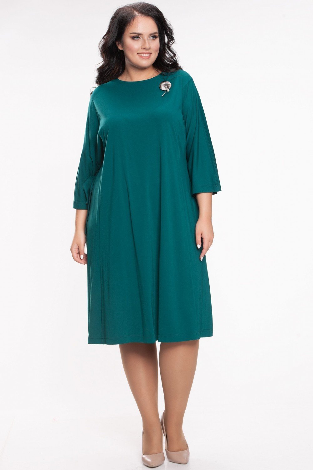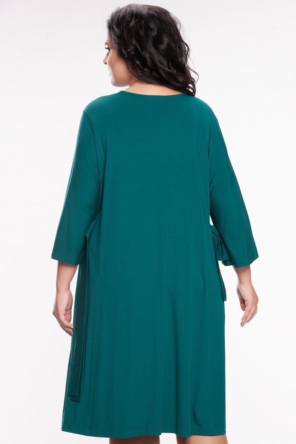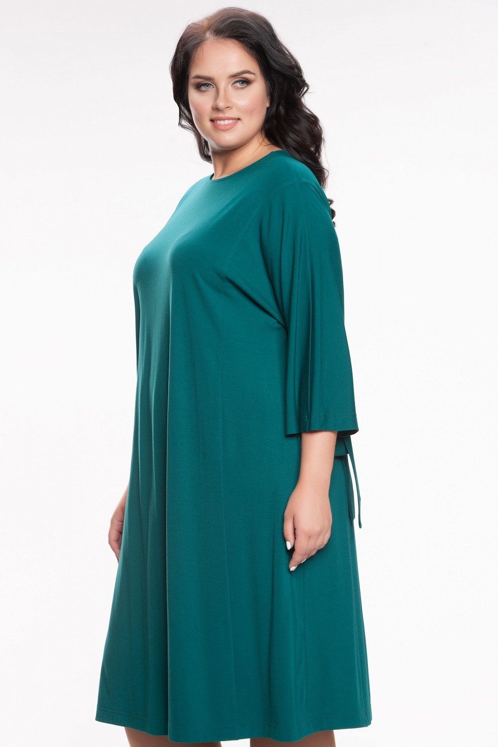 Стильное модное платье из однотонного плательного полотна изумрудного цвета, высокого качества с большим содержанием вискозы. А-образного силуэта с боковыми вертикальными рельефами и цельнокроенным рукавом, что придает дополнительную свободу и комфорт. Рукав декорирован бантами из основной ткани. Бант вшит в шов рукава. Однотонная ткань позволит женщине дополнить при необходимости платье аксессуаром. На фото модель 56 размера, рост 174 см.