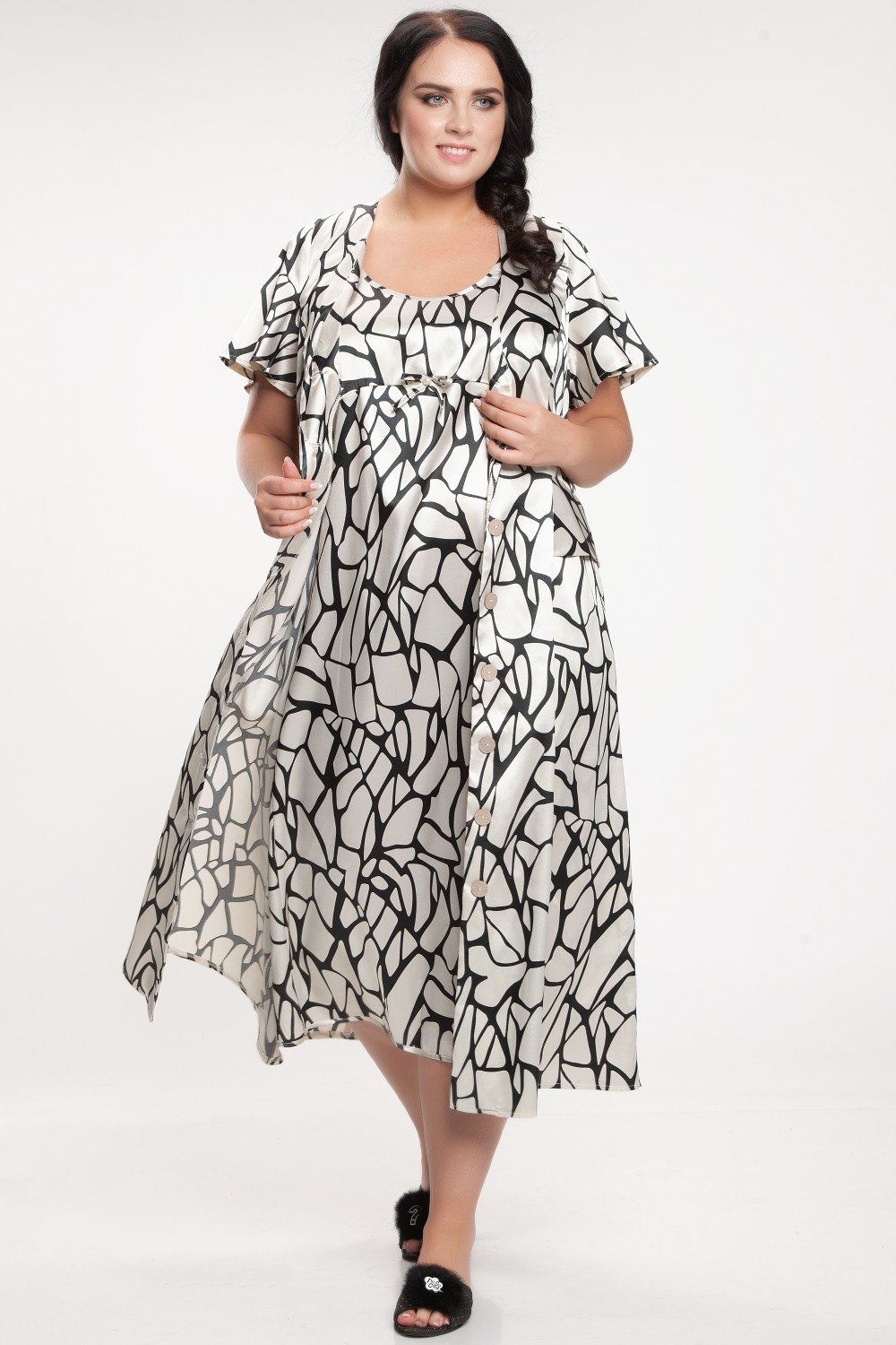 Атласный комплект двойка: халат и сорочка. Сорочка А-силуэта, на тонких двойных бретелях, длинна 106 см. По переду к кокетке пришиты декоративный бантик и украшение. Низ сорочки по краям закругленный и с одной стороны так же пришит декор. Халат А-образного силуэта, с рельефами по переду с центральной застежкой на петли и пуговицы с завязывающимися полупоясами. Длина халата 125 см. Втачной рукав до локтя. На фото модель 60 размера, рост 182 см.