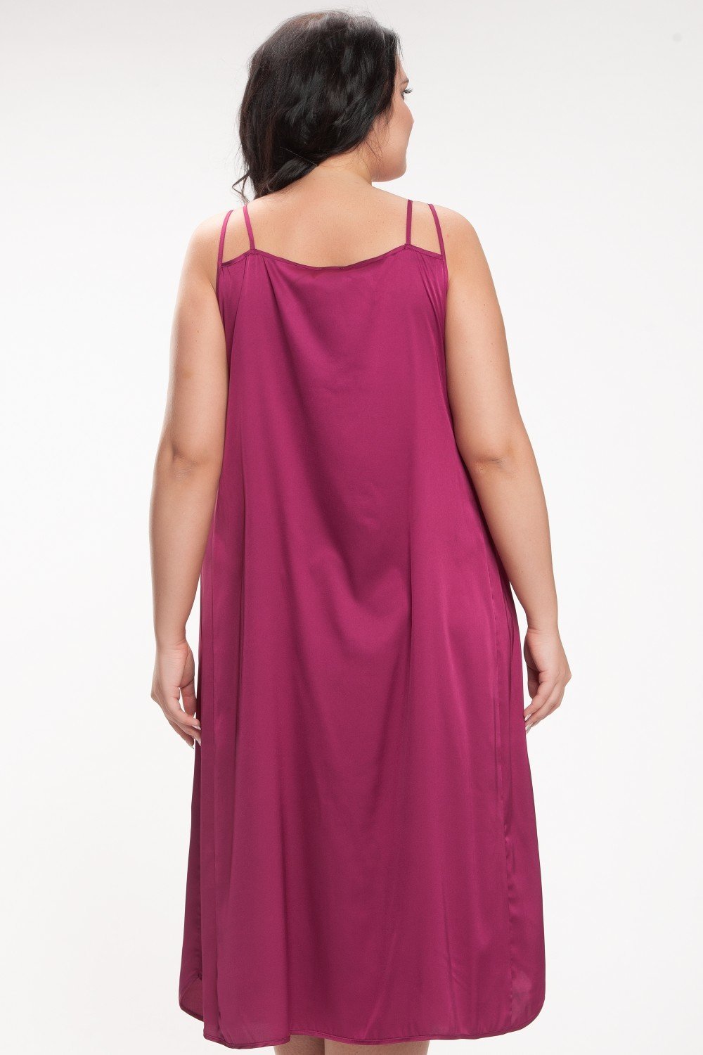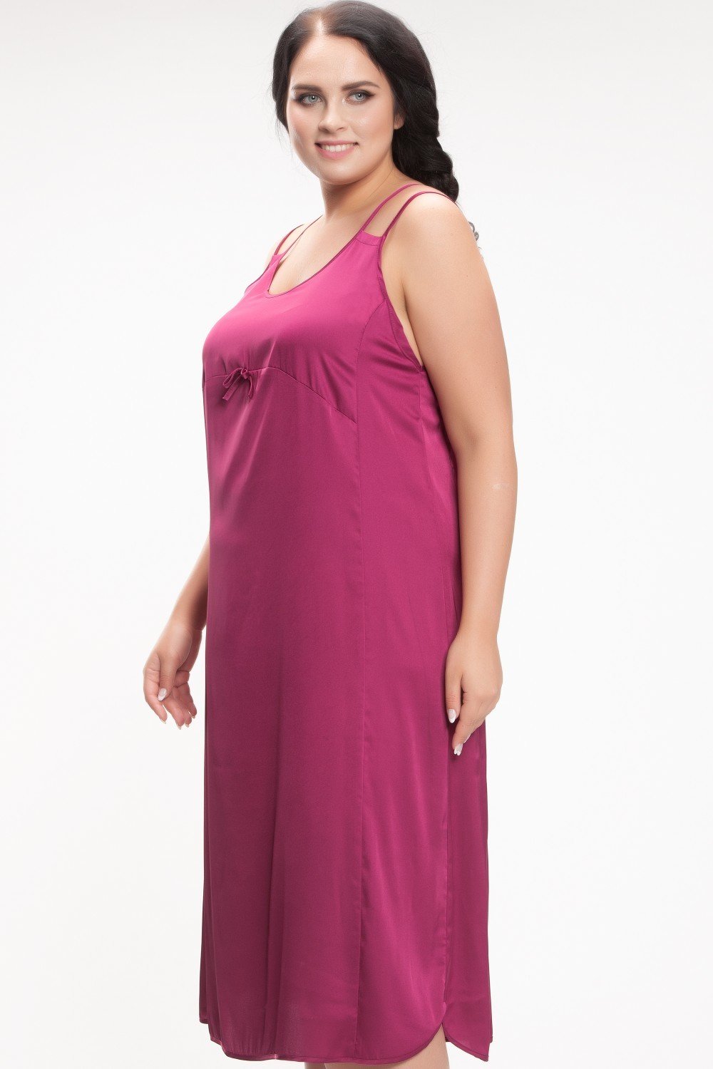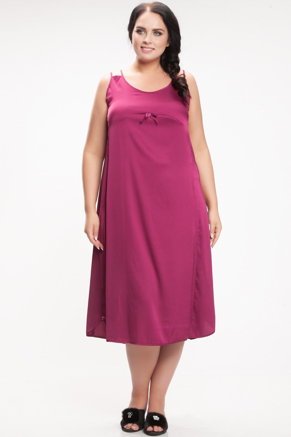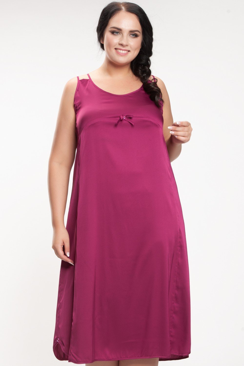 Атласная сорочка А-силуэта, на тонких двойных бретелях, длинна 106 см. По переду к кокетке пришиты декоративный бантик и украшение. Низ сорочки по краям закругленный и с одной стороны так же пришит декор. На фото модель 60 размера, рост 182 см.