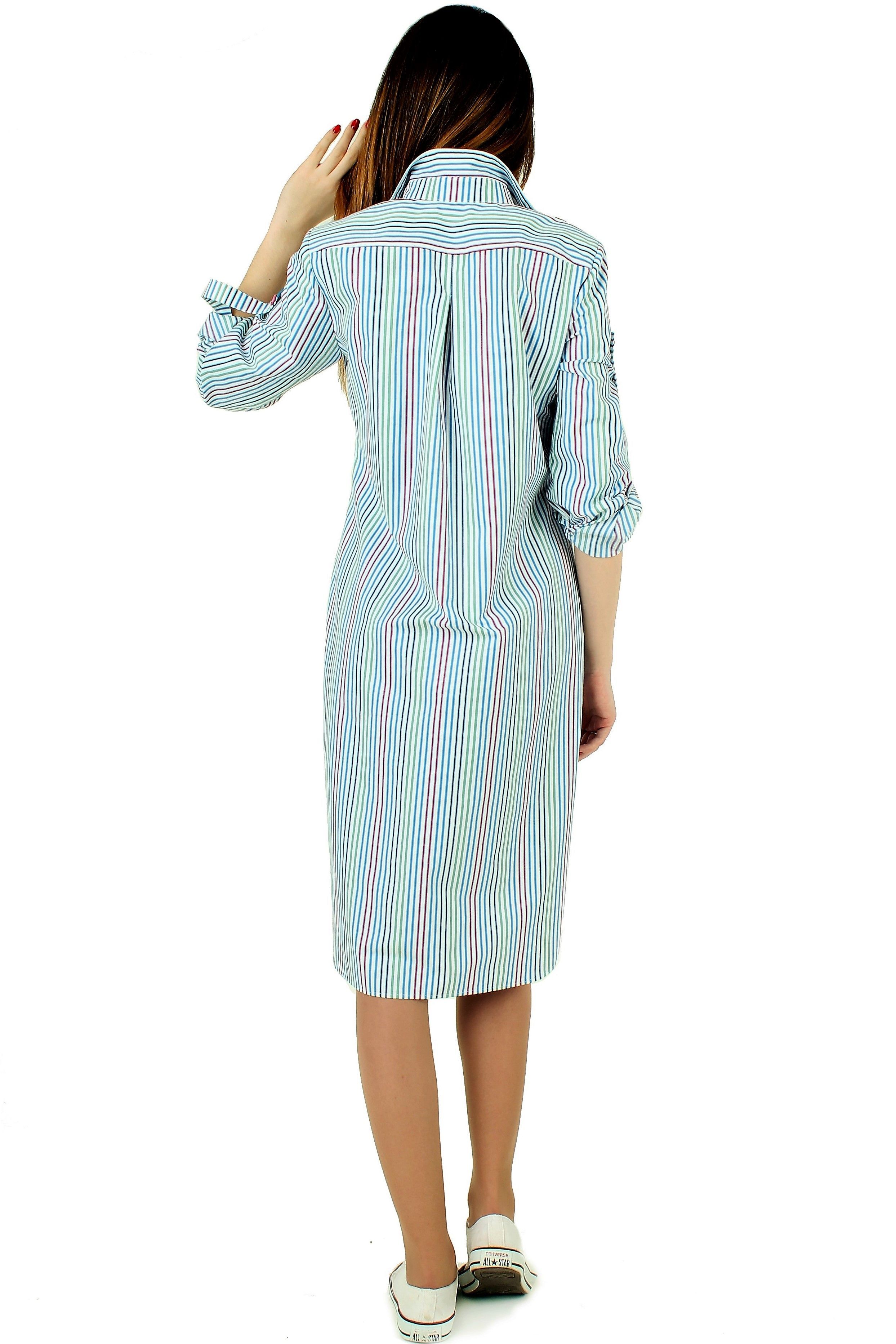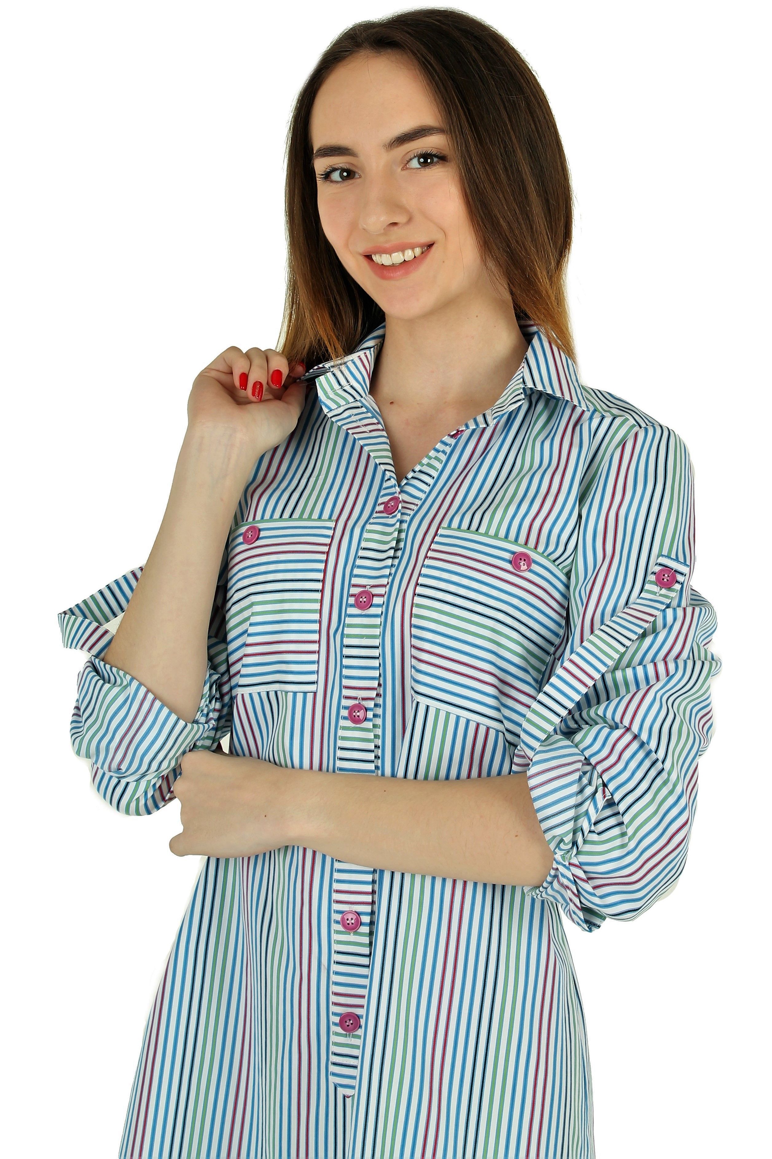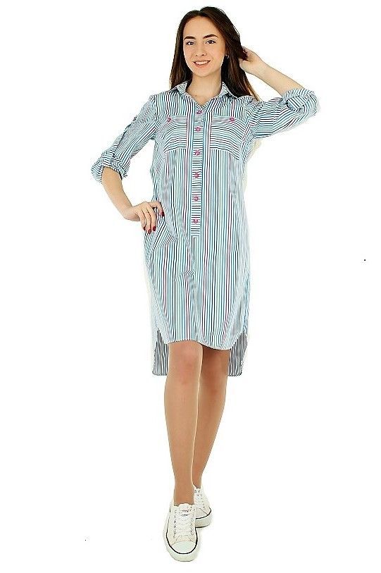 Платье-рубашка из ткани в полоску свободного прямого кроя.