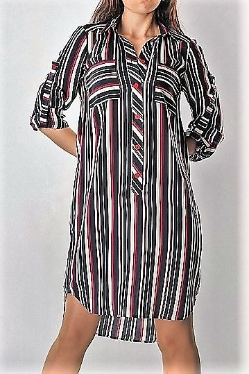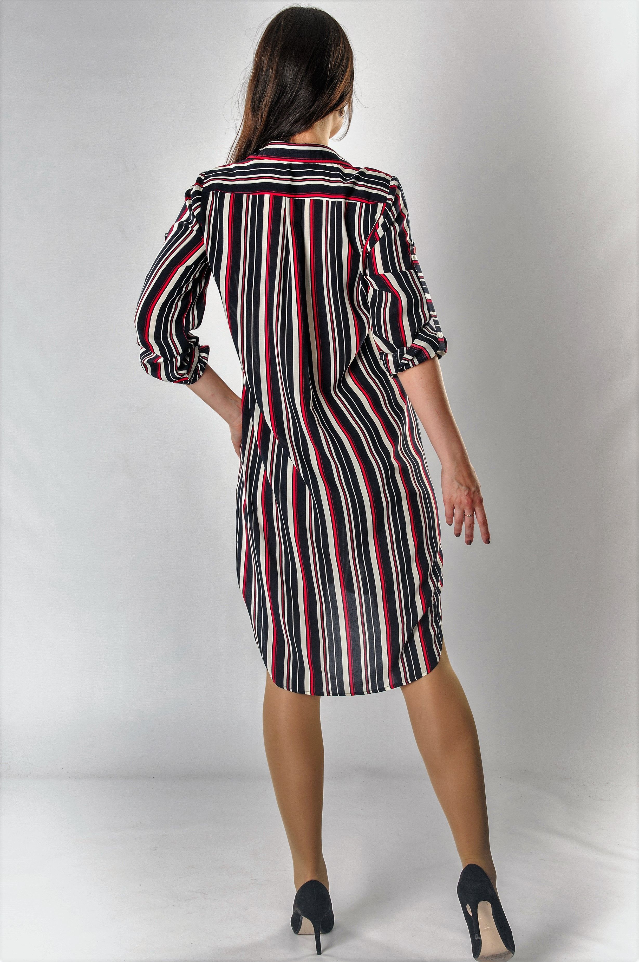 Платье-рубашка из ткани в полоску свободного прямого кроя.
