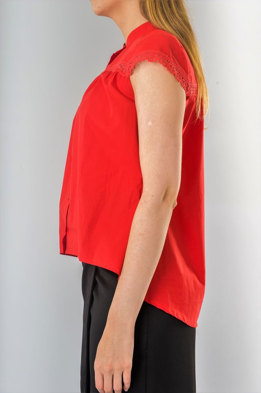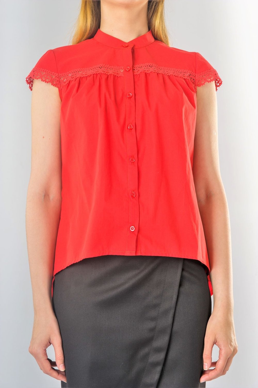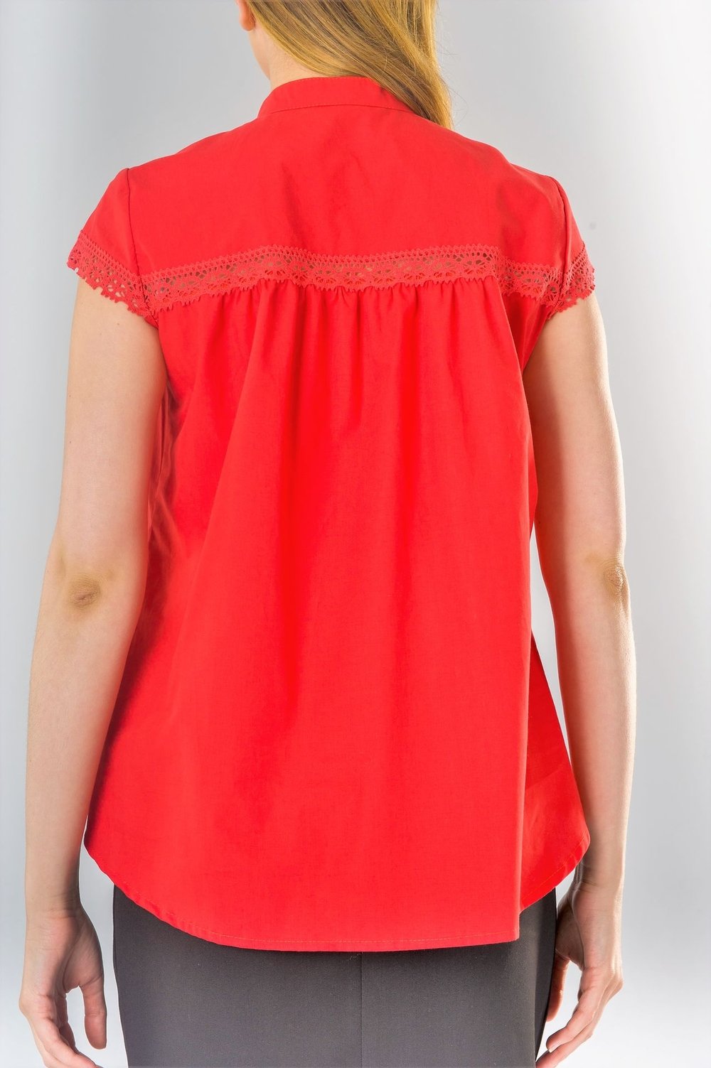 Однотонная блузка с коротким рукавом, с отделкой из кружева.