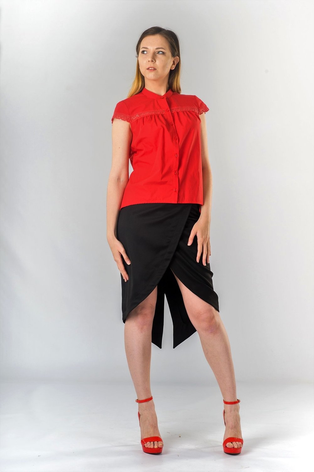Низ блузки фигурный, спереди длина короче и постепенно удлиняется по направлению к спинке.