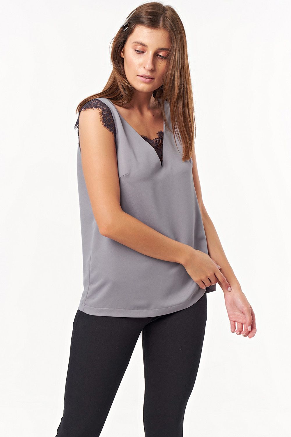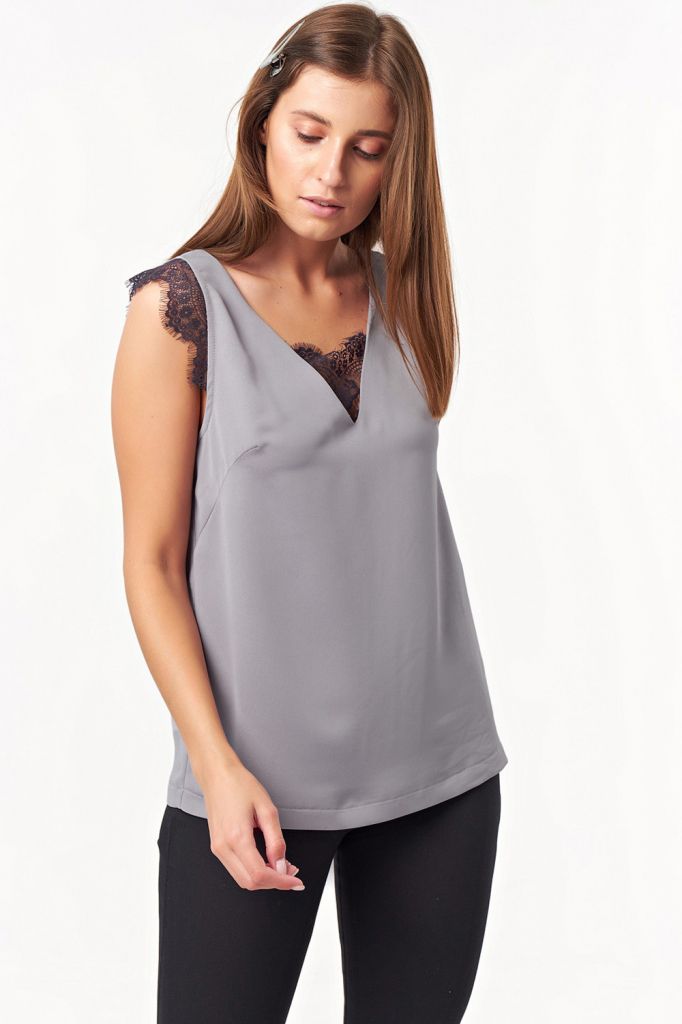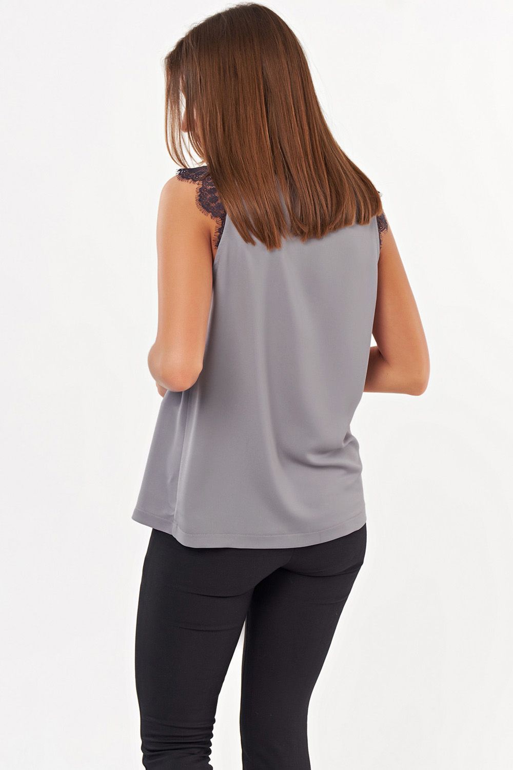 • Особенности: Топ прямого силуэта из плотной ткани с отделкой кружевом. Детали: V-образный вырез по переду с кружевной вставкой, по проймам выполнена кружевная отделка в виде крылышек. Без застежки.