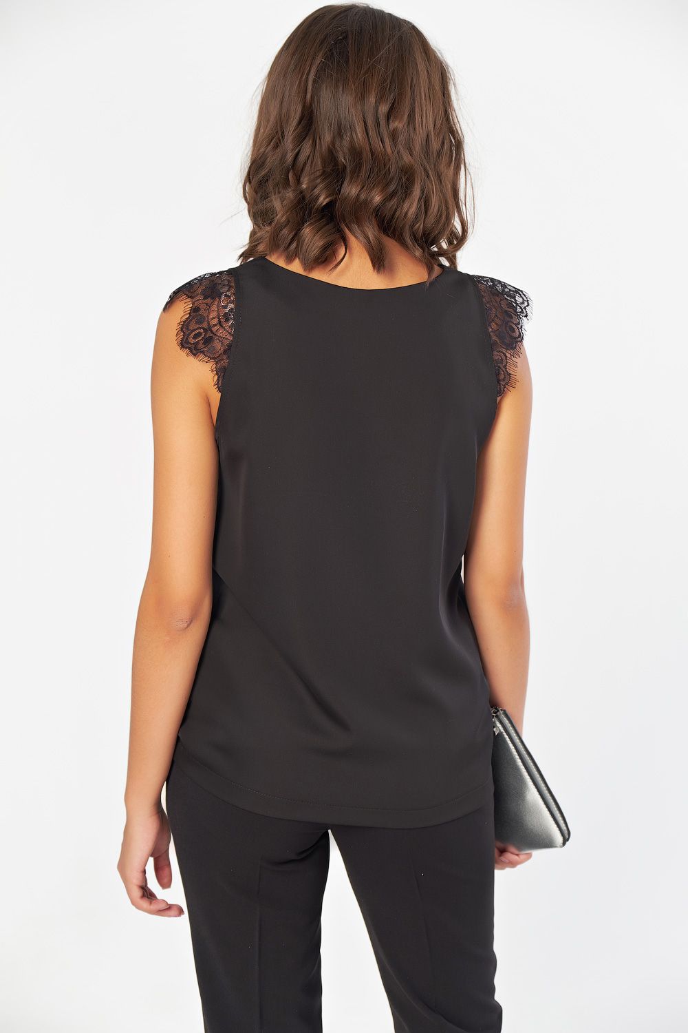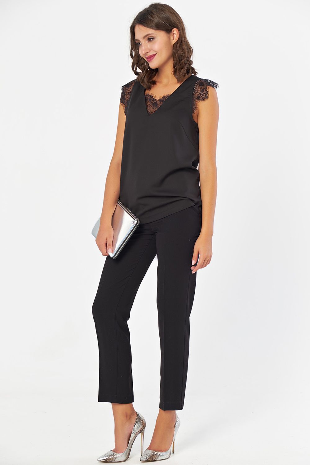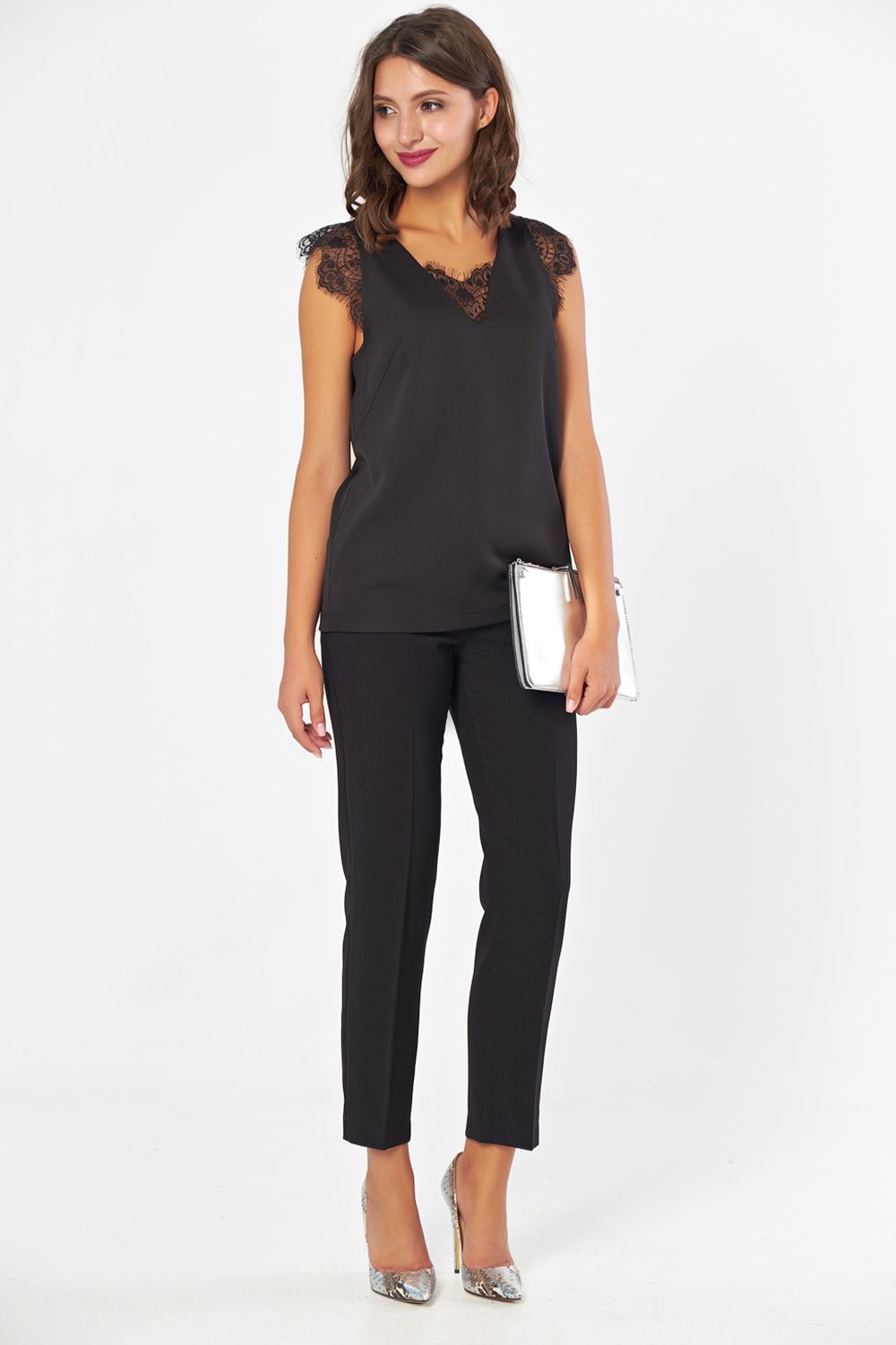 • Особенности: Топ прямого силуэта из плотной ткани с отделкой кружевом. Детали: V-образный вырез по переду с кружевной вставкой, по проймам выполнена кружевная отделка в виде крылышек. Без застежки.