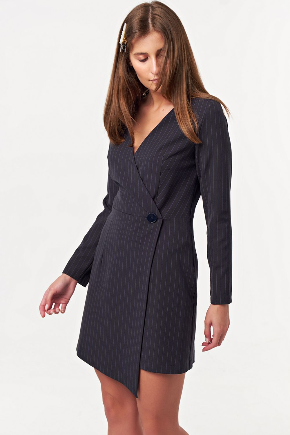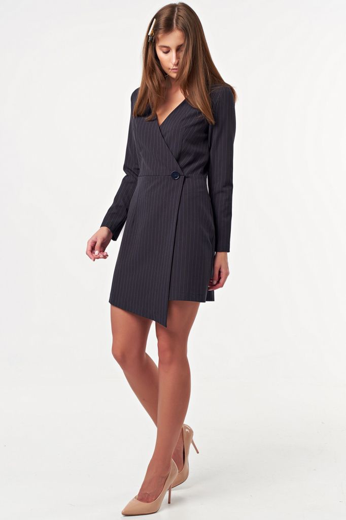 • Особенности: Платье прилегающего силуэта из ткани в полоску. Детали: имитация запаха по переду, V-образный вырез горловины, вытачки, декоративная пуговица, низ асимметричный. Застежка на потайную молнию.