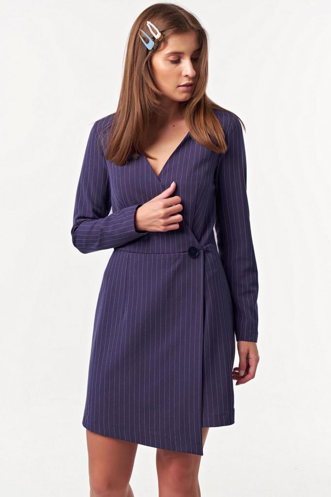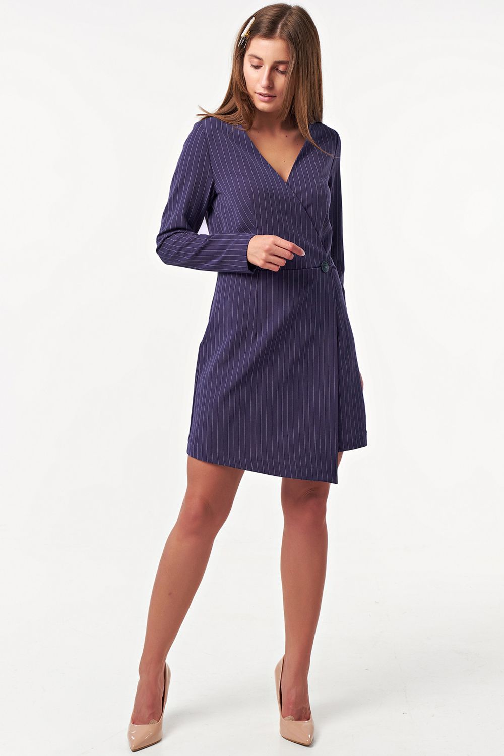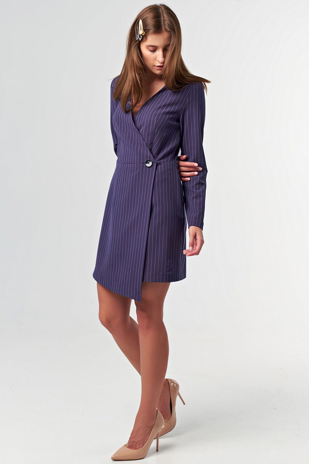 • Особенности: Платье прилегающего силуэта из ткани в полоску. Детали: имитация запаха по переду, V-образный вырез горловины, вытачки, декоративная пуговица, низ асимметричный. Застежка на потайную молнию.