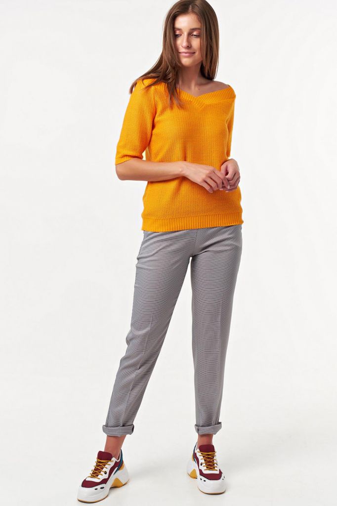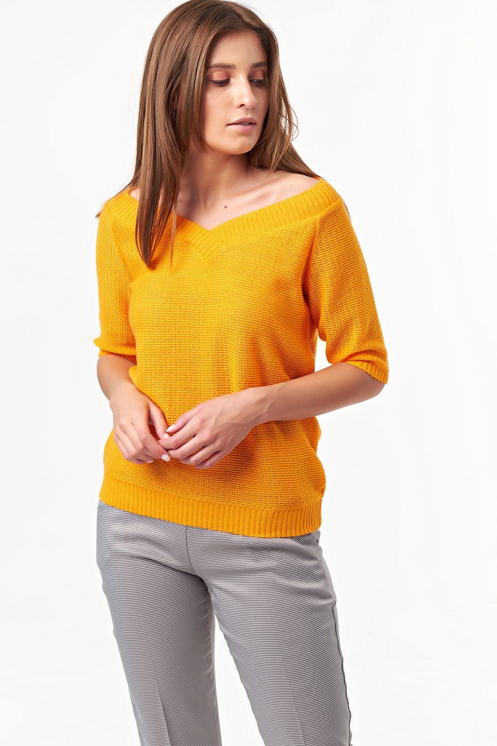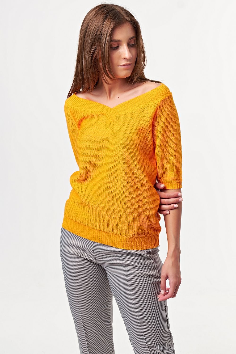 Особенности: Пуловер вязаный выполнен из смесовой пряжи, фактурным способом. Рукав реглан 1/2 и широкий вырез горловины, оформленный в рубчик.