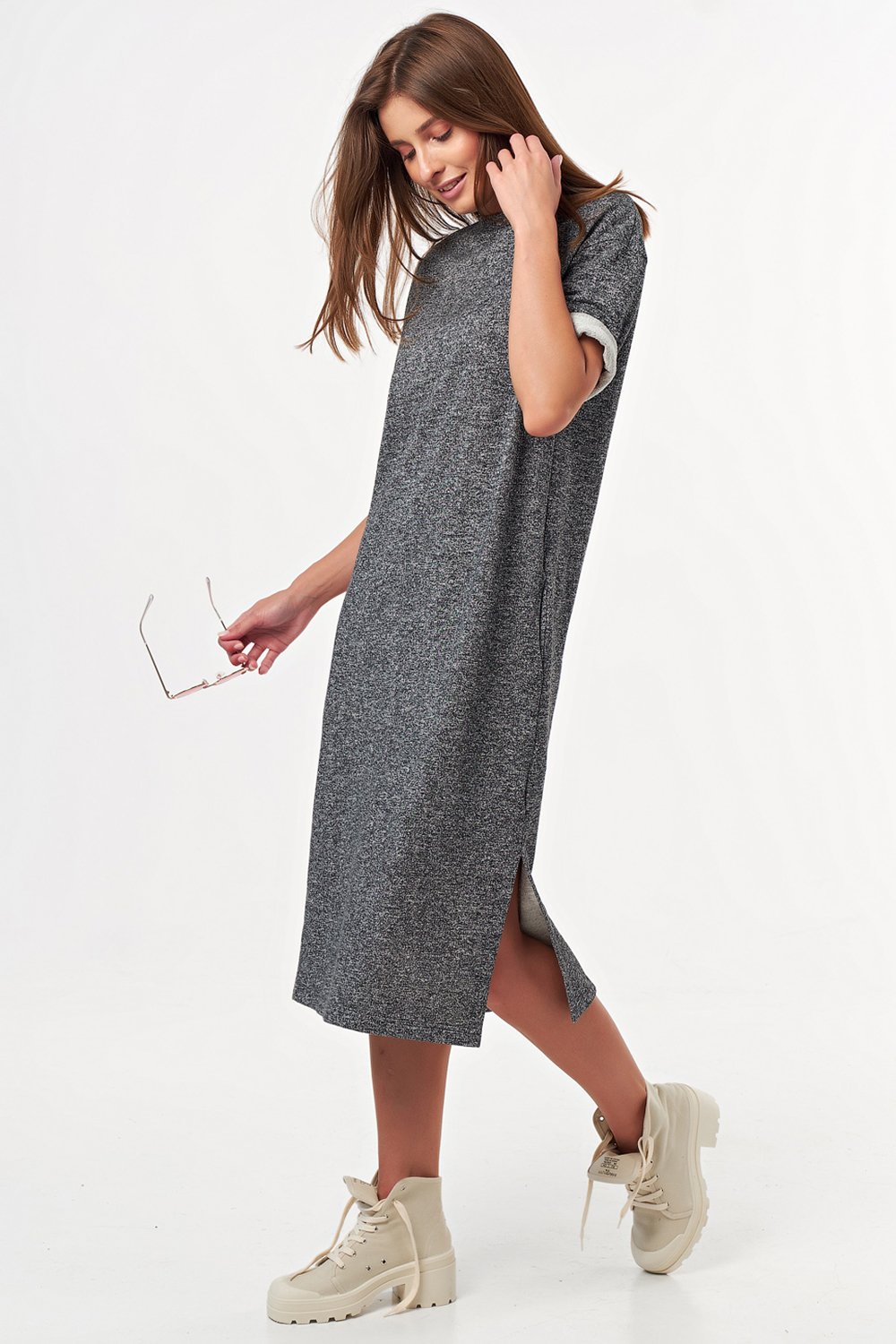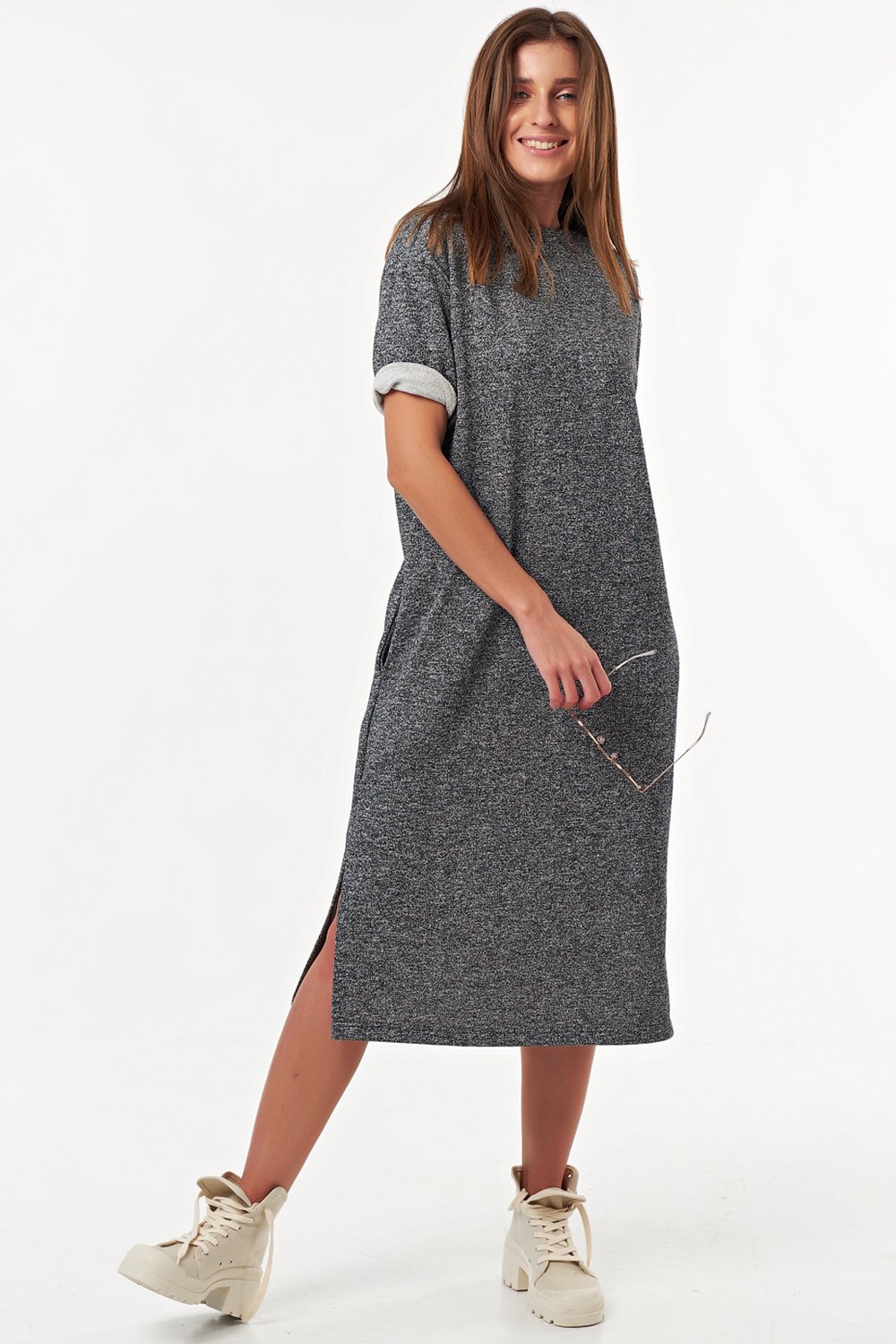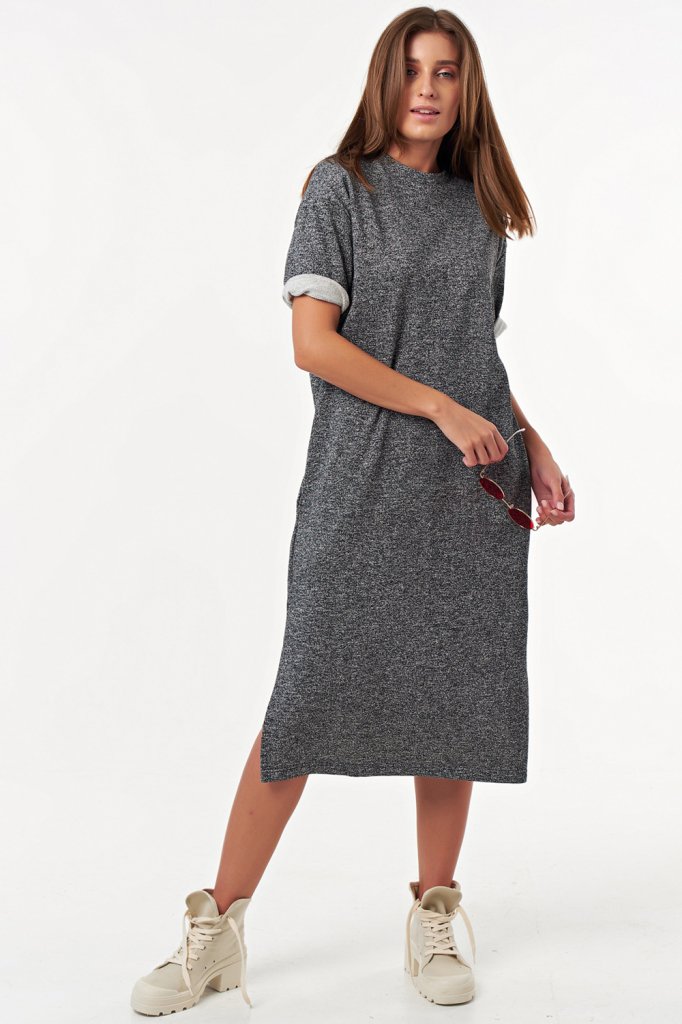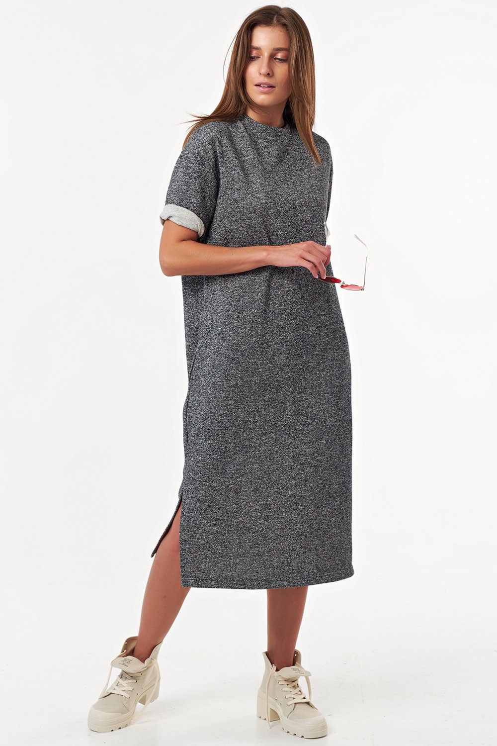 • Особенности: Платье прямого силуэта из трикотажа-футера, посадка свободная без прилегания. Детали: горловина обработана бейкой, карманы в боковых швах, разрезы. Без застежки.