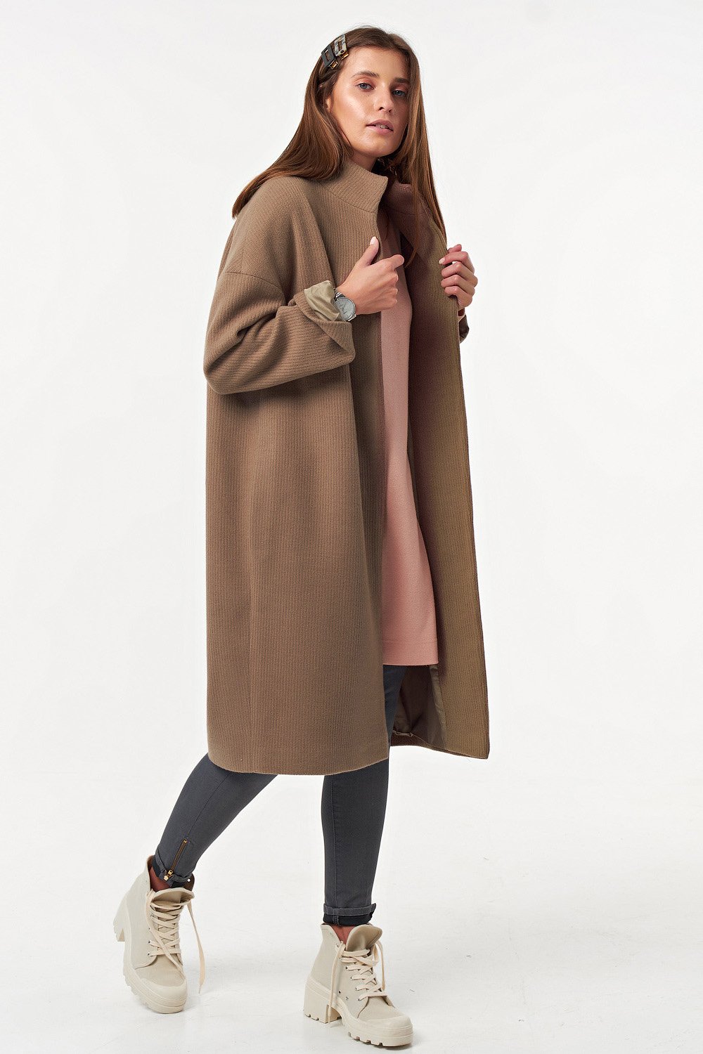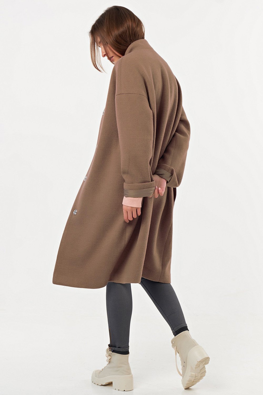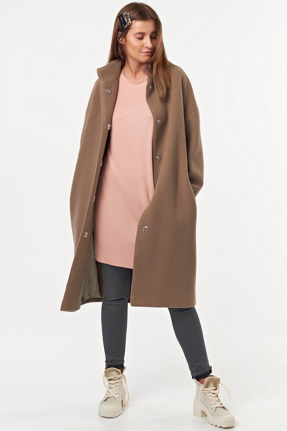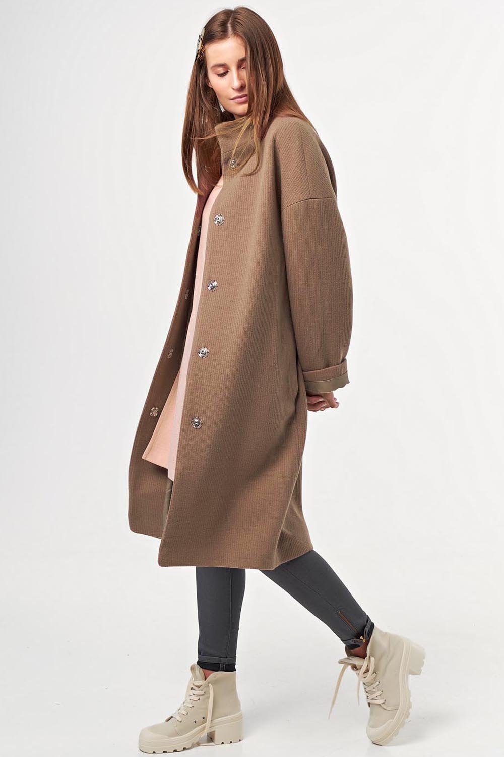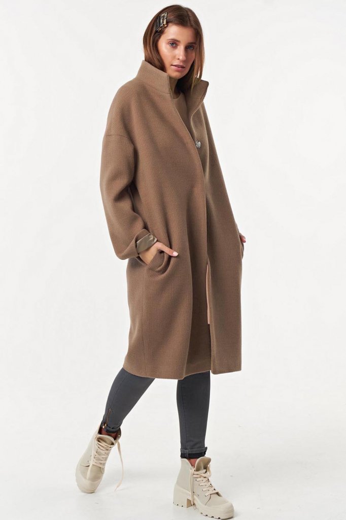 • Особенности: Пальто свободного силуэта oversize, слегка заужено книзу. Ткань пальтовая с фактурой вязаного трикотажа. Детали: воротник стойка, втачной рукав со спущенной проймой, застежка на кнопки. Изделие на подкладке.