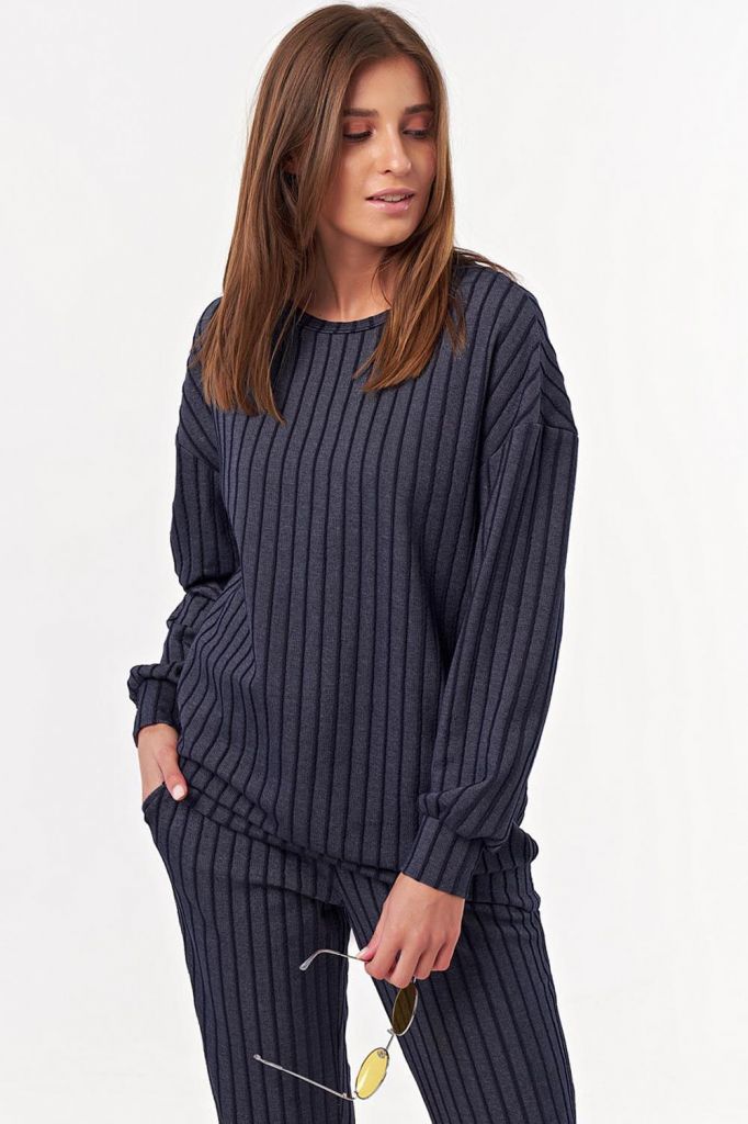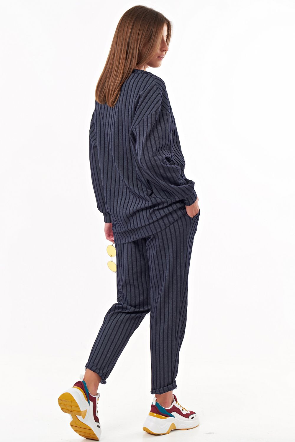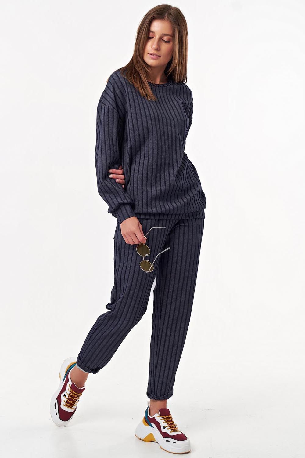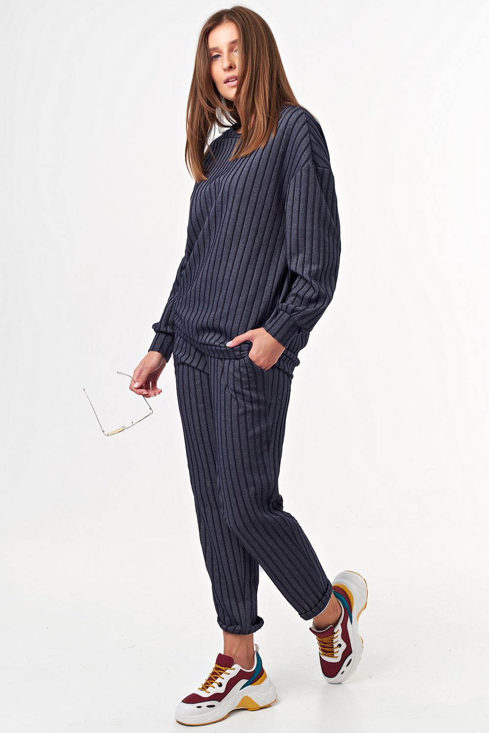 • Особенности: Костюм из фактурного трикотажа состоит из свитшота и брюк. Детали свитшота: горловина округлой формы, обработана бейкой, спущенный длинный рукав на манжете, притачная манжета по низу свитшота. Брюки прямого силуэта, притачной пояс, брючные карманы.