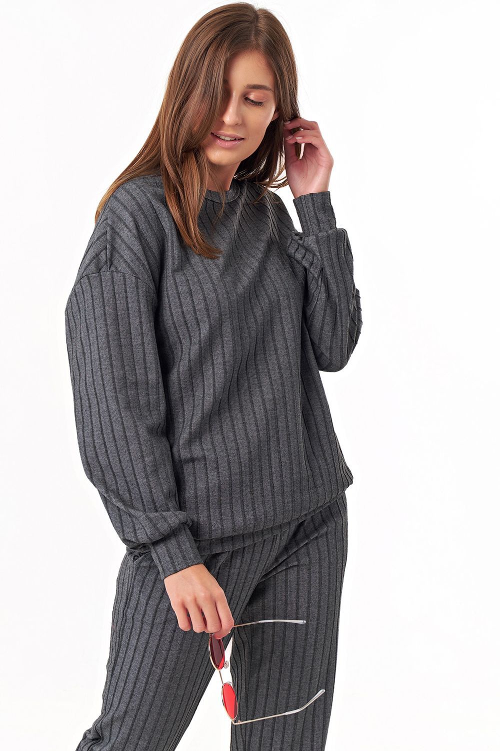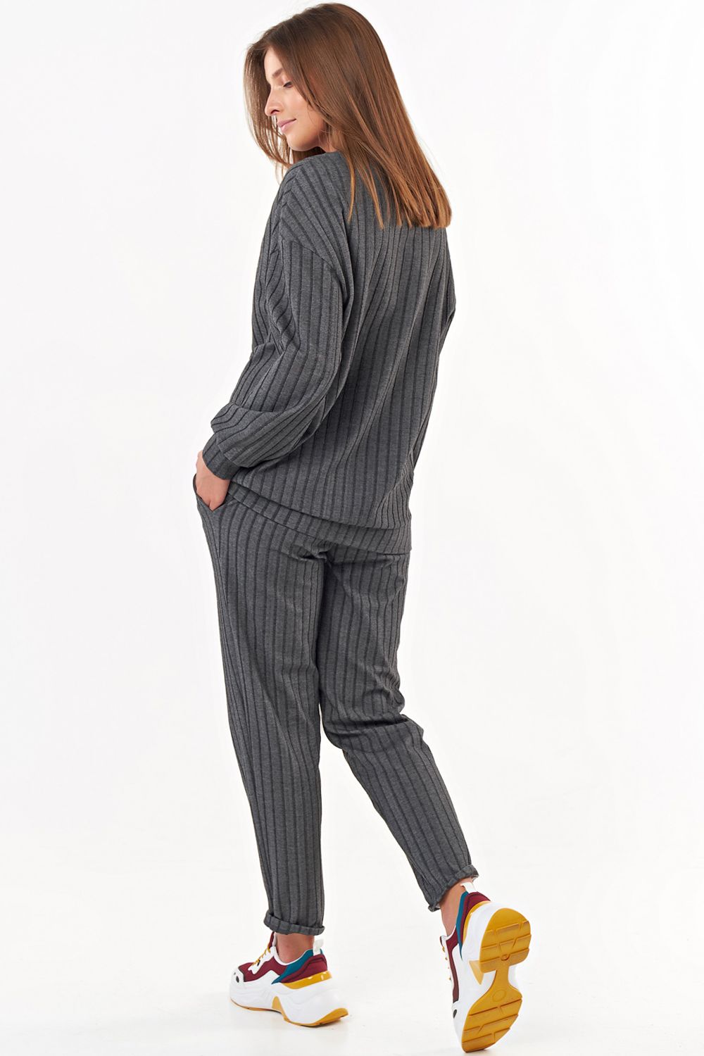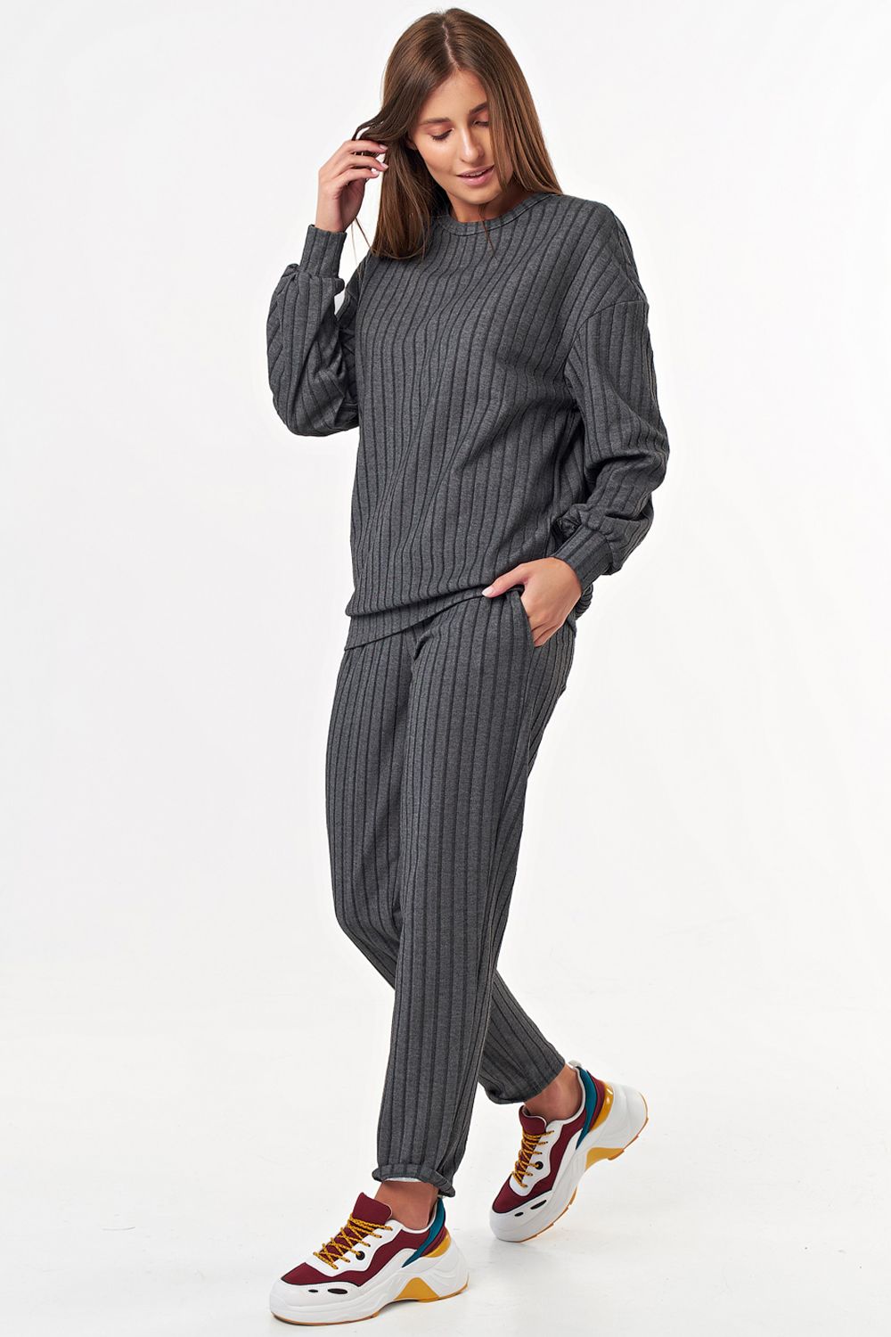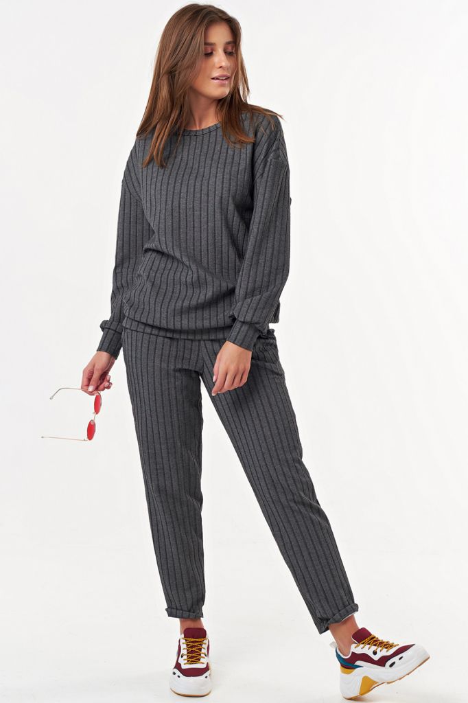 • Особенности: Костюм из фактурного трикотажа состоит из свитшота и брюк. Детали свитшота: горловина округлой формы, обработана бейкой, спущенный длинный рукав на манжете, притачная манжета по низу свитшота. Брюки прямого силуэта, притачной пояс, брючные карманы.