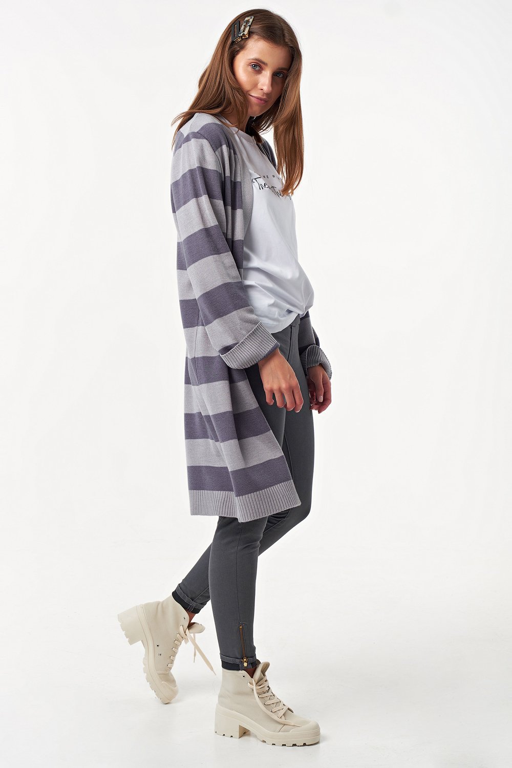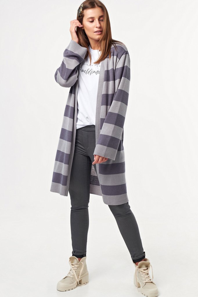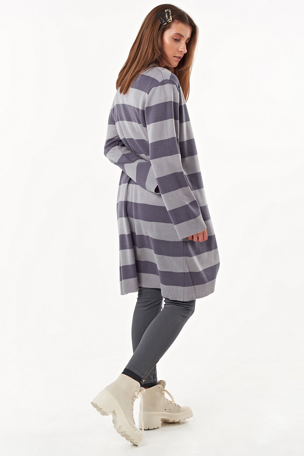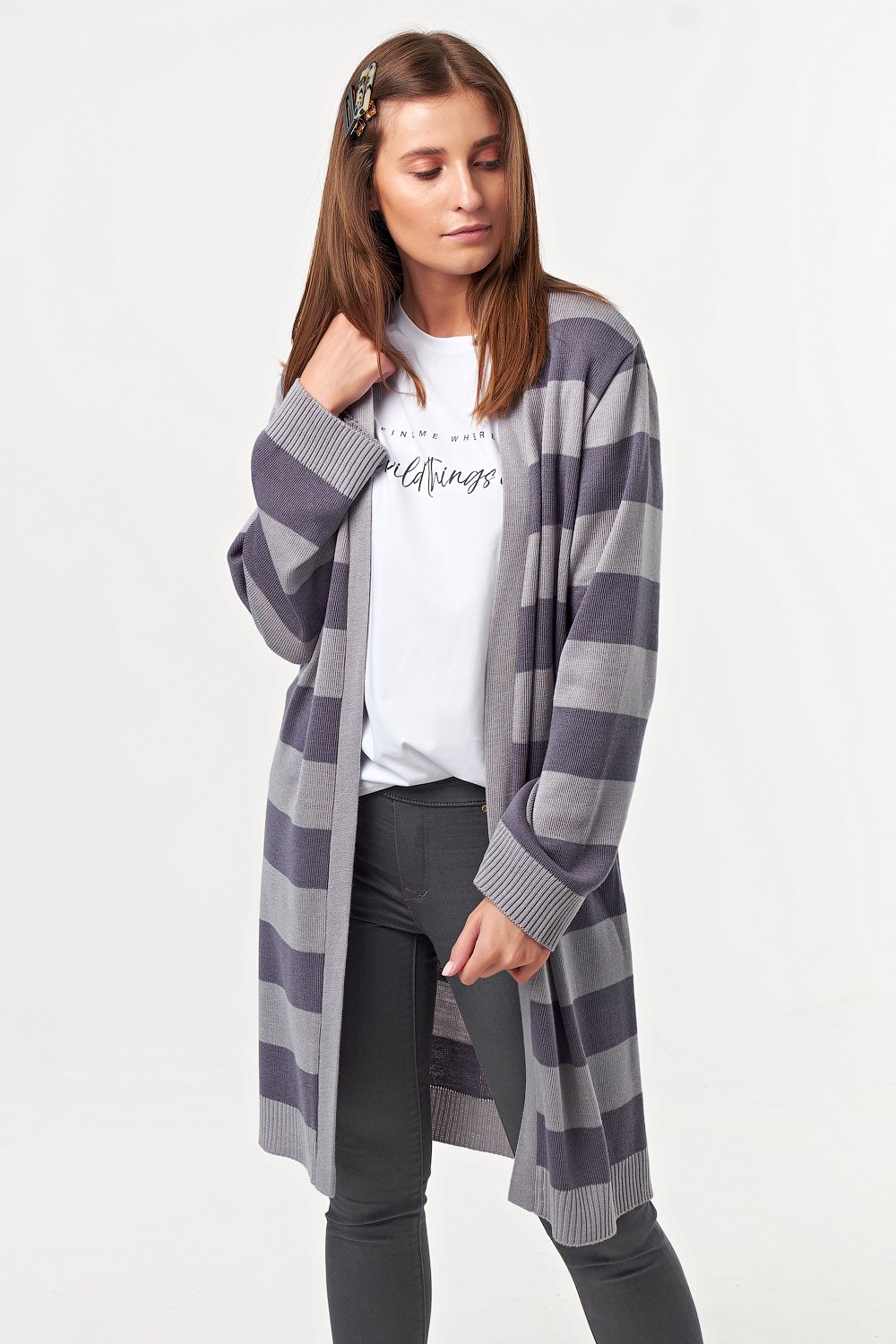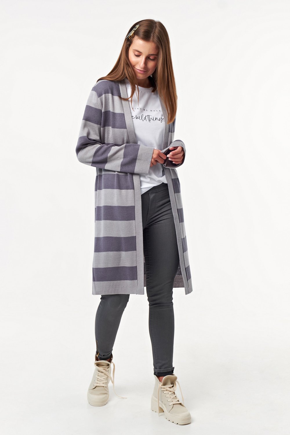 Особенности: Вязаный двухцветный кардиган прямого силуэта выполнен из полушерстяной пряжи. Кардиган оформлен контрастной обтачкой по переду. Рукава широкие оформлены резинкой