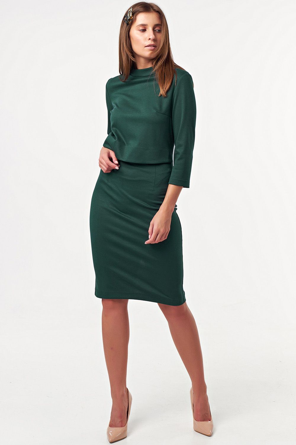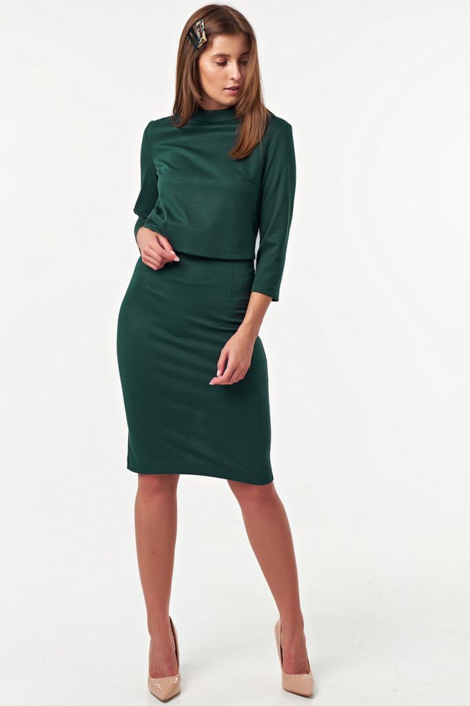 • Особенности: Платье прилегающего силуэта с втачным рукавом. Детали: воротник стойка, верхняя часть платья - отлетная, нижняя – цельная деталь.
