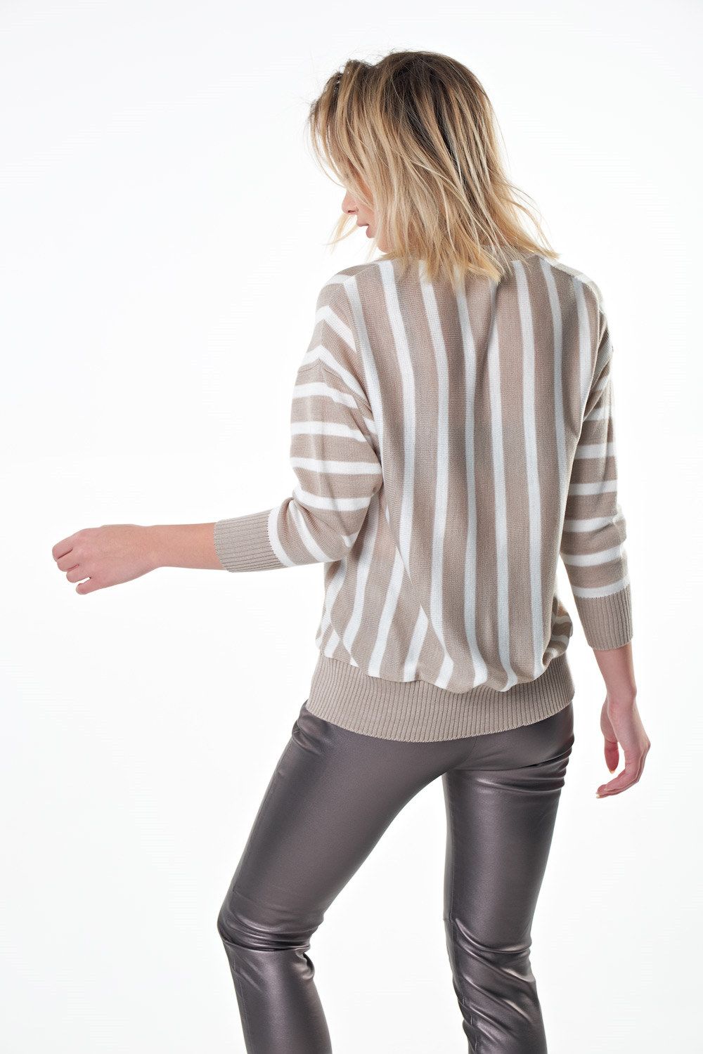 Особенности: Джемпер в вертикальную полоску свободного силуэта выполнен из полушерстяной пряжи. Низ джемпера, рукава и горловина оформлены резинкой.