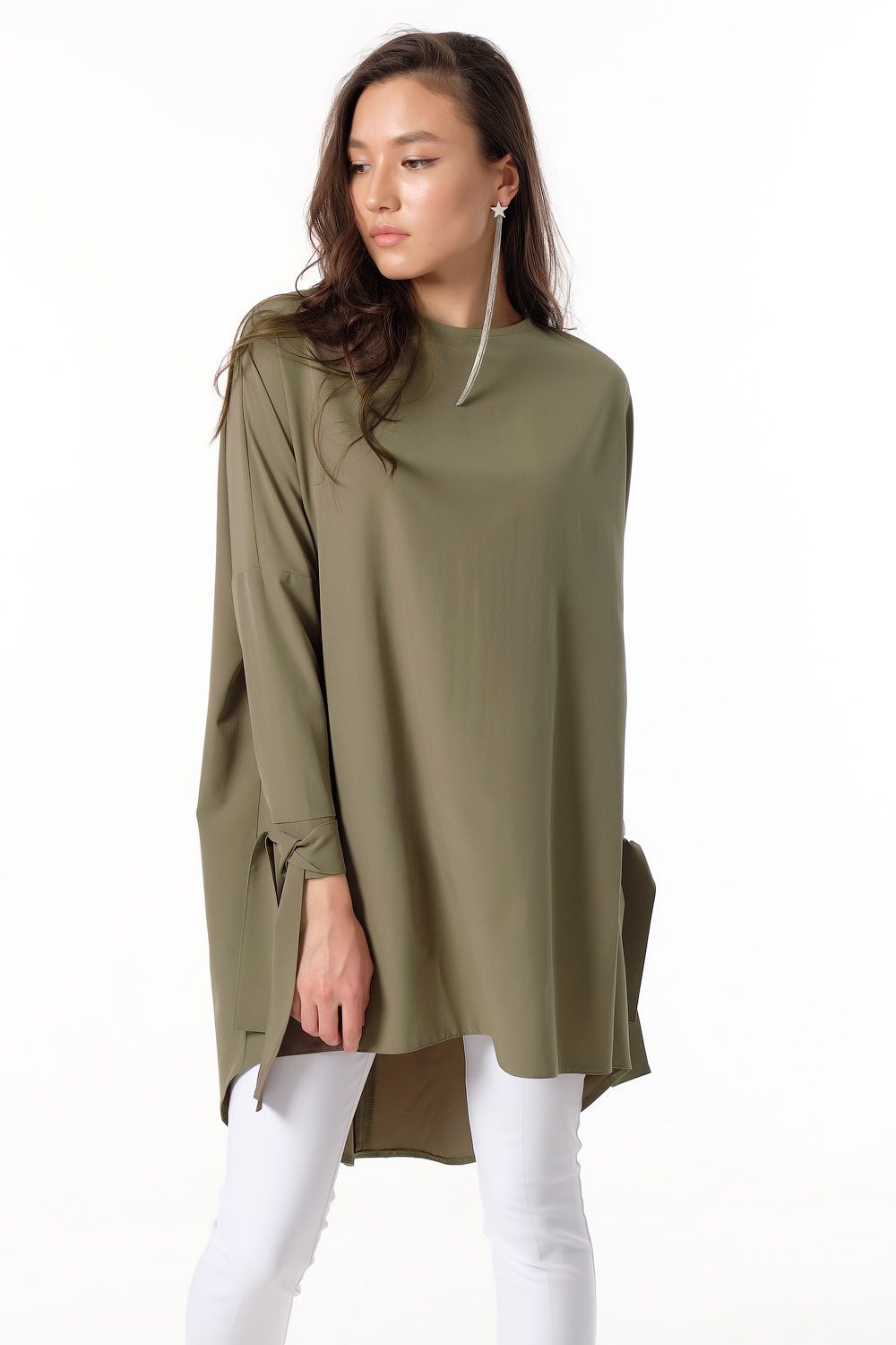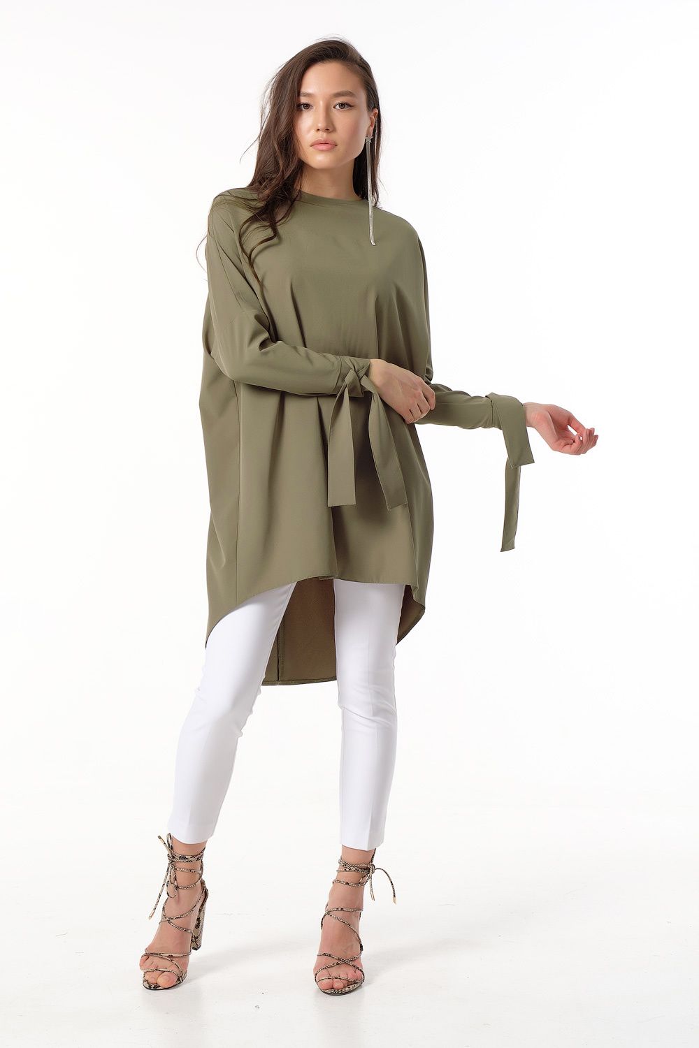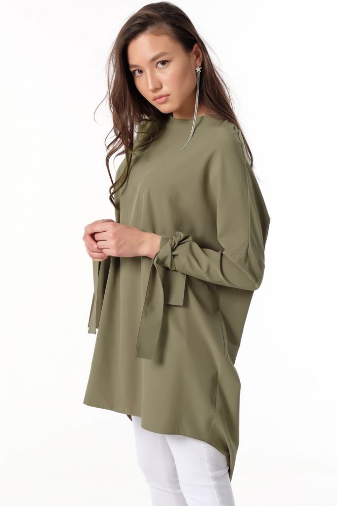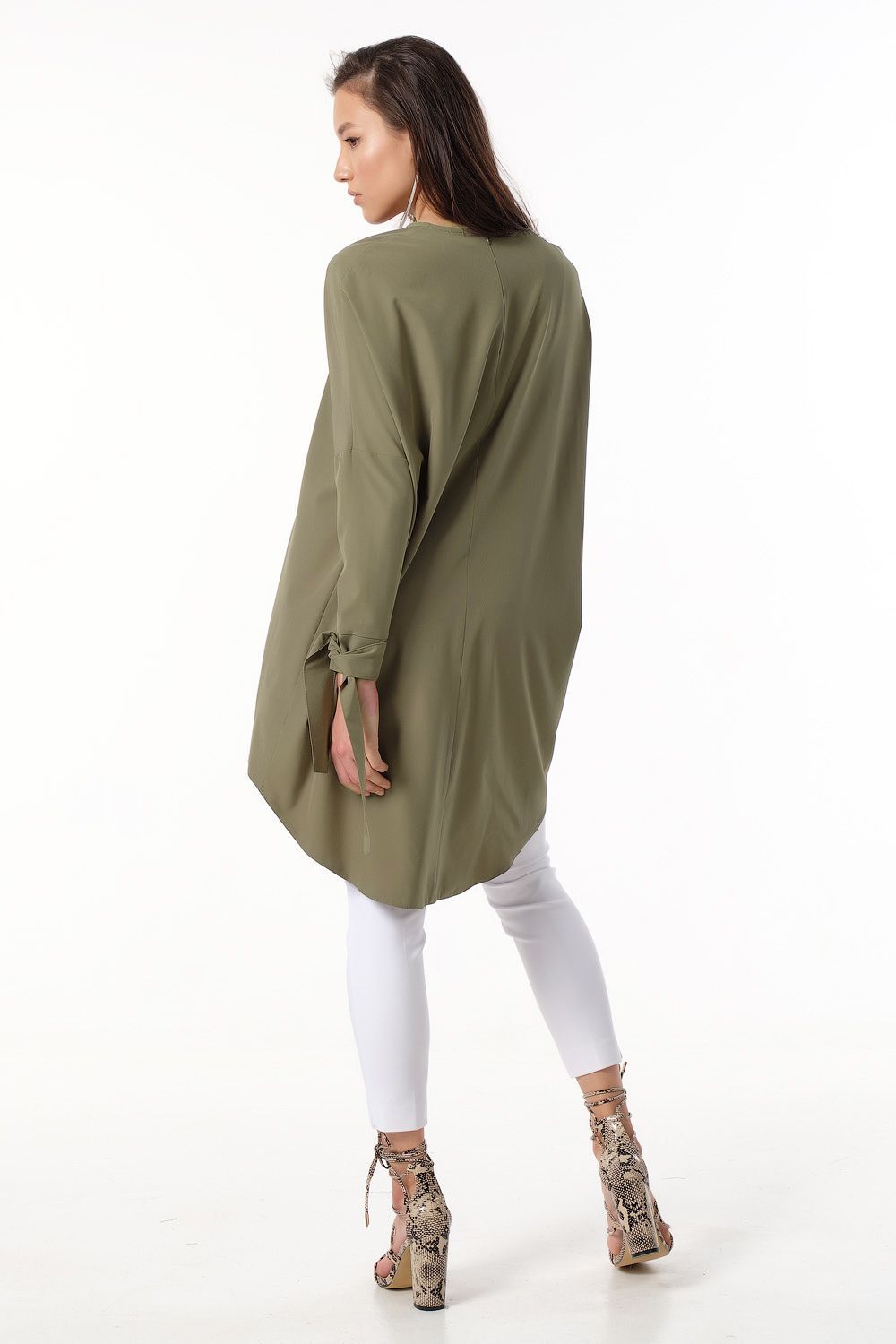 • Особенности: Блуза из тонкой блузочной ткани. Модель удлиненная свободного силуэта.;;Детали: сильно спущенная линия плеча, рукава с притачной манжетой, на манжетах декоративные завязки, спинка удлененная. Застежка на молнию в среднем шве спинки.