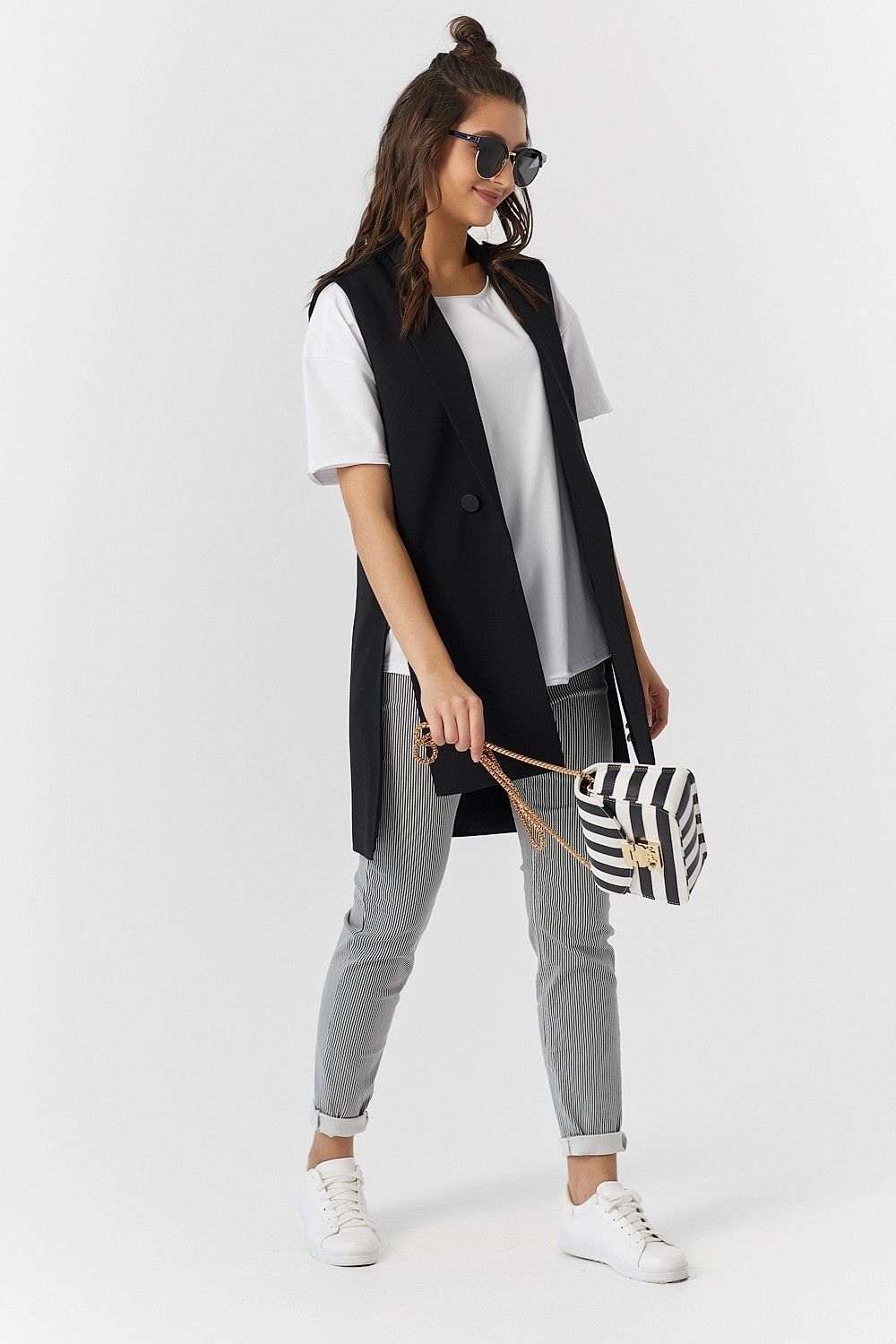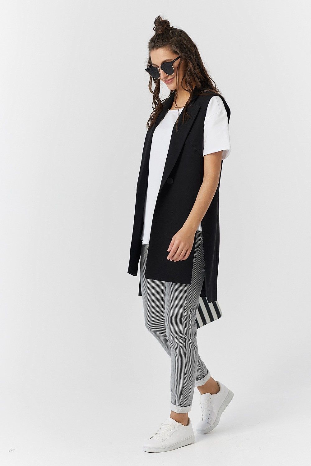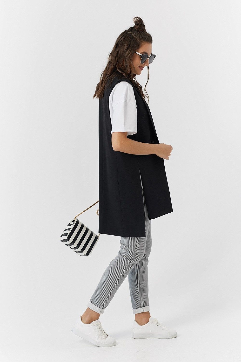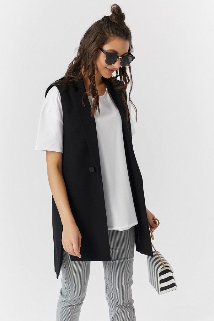 • Особенности: Жилет прямого силуэта. Детали: отложной пиджачный воротник, декоративные пуговицы, фигурная пройма, смещенные боковые швы переходящие в разрезы, удлиненная спинка.