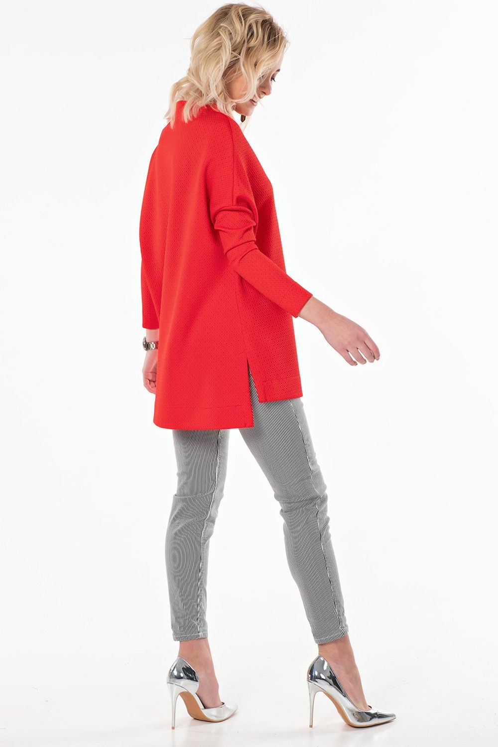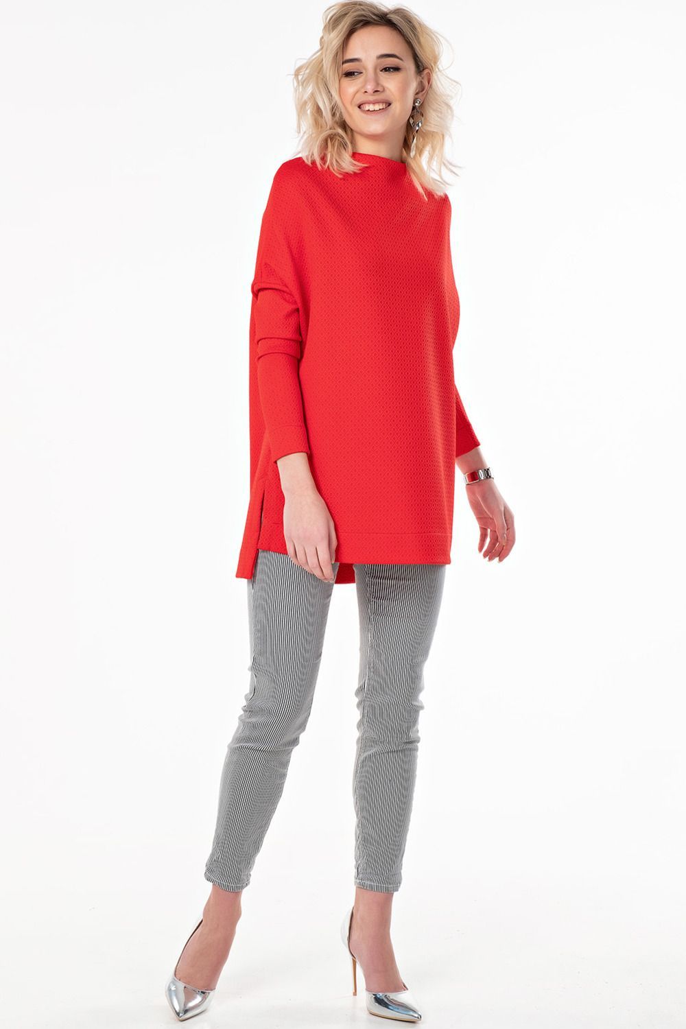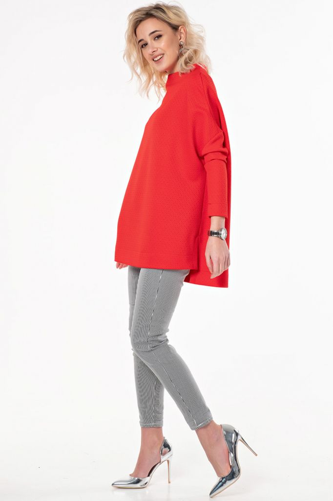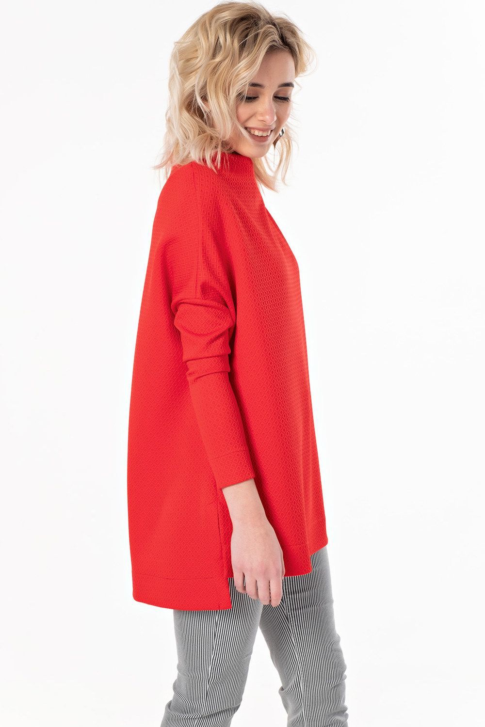 • Особенности: Блуза-туника свободного силуэта оверсайз из фактурного трикотажа. Детали: невысокая цельновыкроенная стойка, спущенная линя плеча, перед короче спинки на 5см, в боковых швах выполнены разрезы, низ изделия и рукавов с широкой подгибкой.