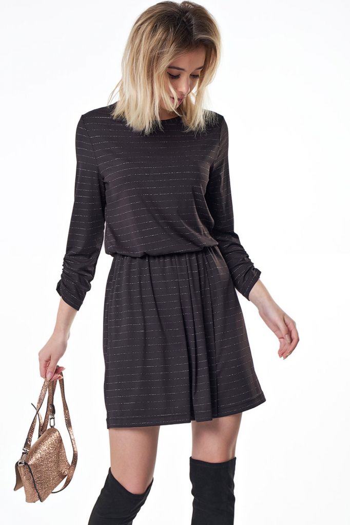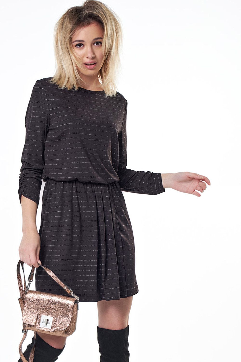 • Особенности: Платье прилегающего силуэта из трикотажа. Детали: горловина окантована, рукав 7/8 с застрочкой на шпульную резину по низу рукава, в нижней части платья выполнен запах с драпировкой по талии, по линии талии притачана резина. Без застежки.