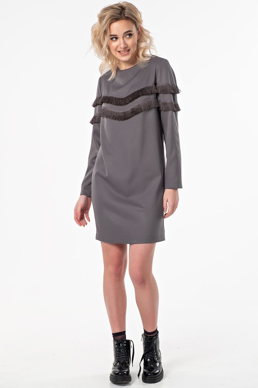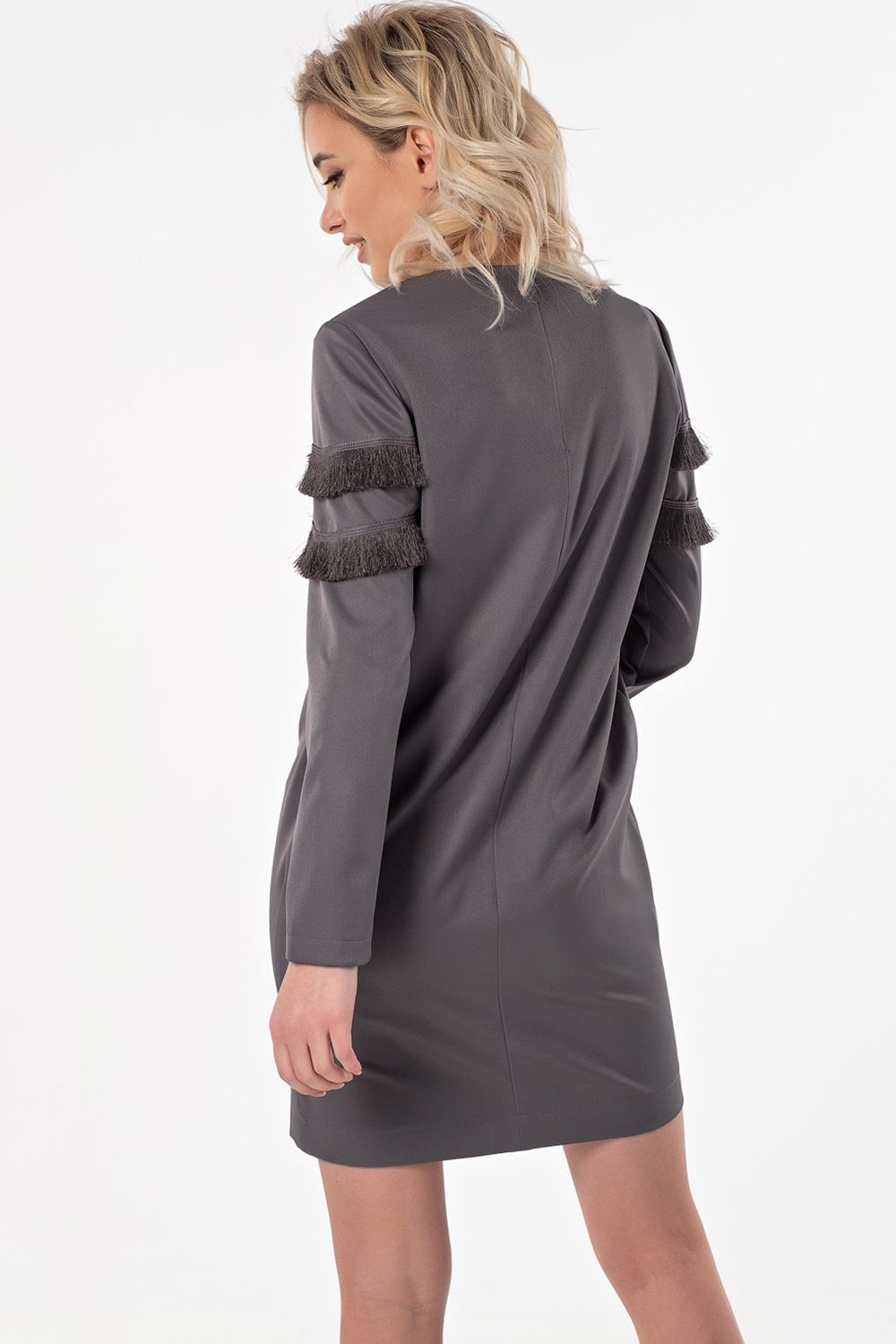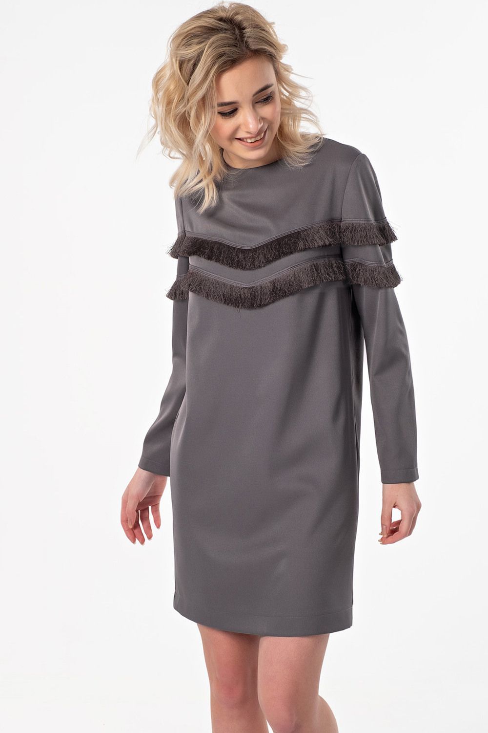 • Особенности: Платье прямого силуэта из костюмной ткани. Детали: горловина округлой формы, длинный прямой рукав, декоративная бахрома настрочена в два ряда по фигурным линиям.