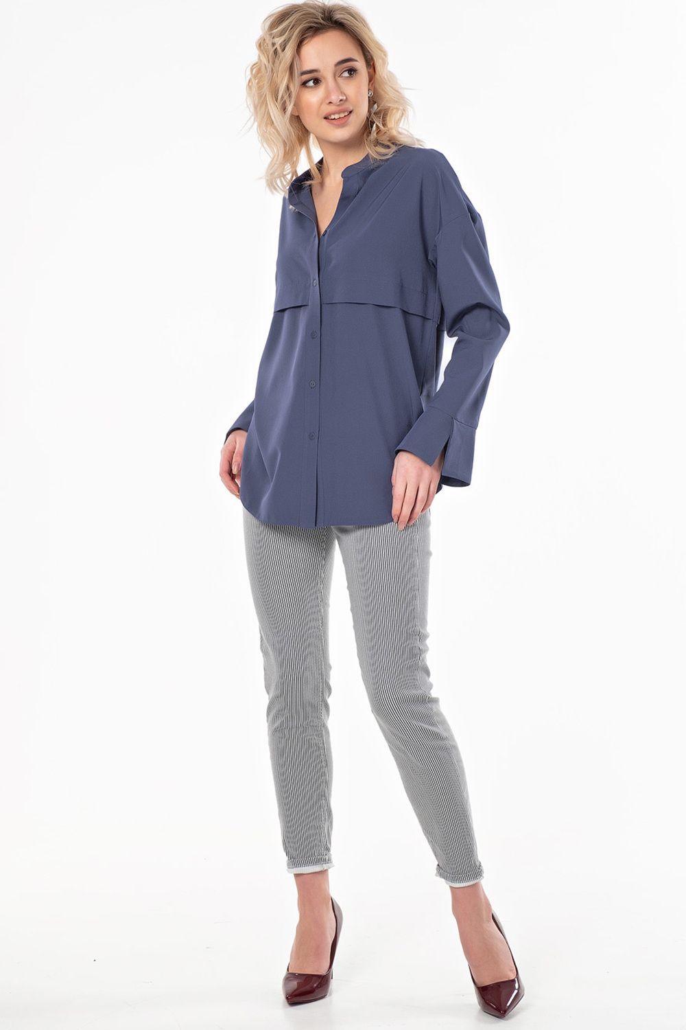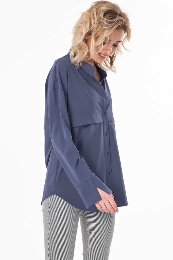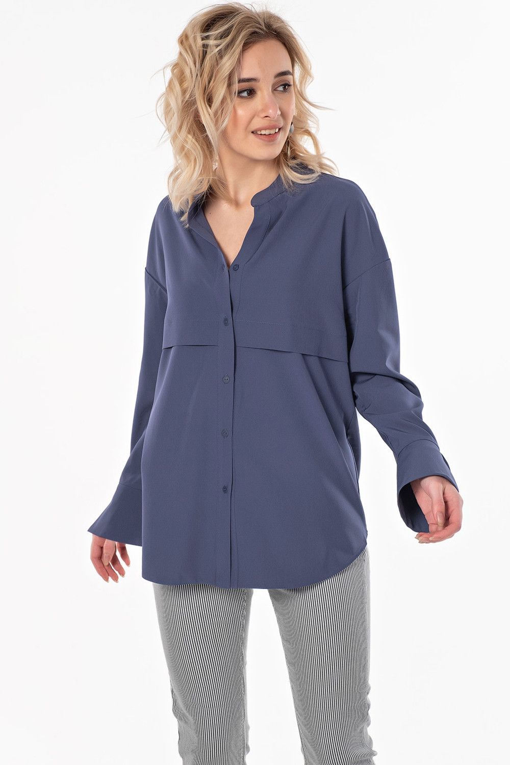 • Особенности: Рубашка из плотной ткани прямого силуэта. Детали: стойка по горловине, планка с застежкой на петли и пуговицы, горизонтальная широкая складка; рукав длинный, втачной со спущенной проймой, по низу рукава выполнена манжета с запахом; низ изделия асимметричный.