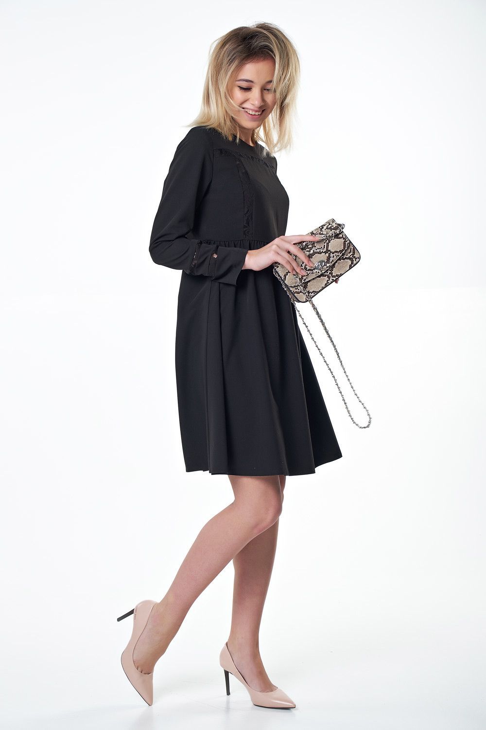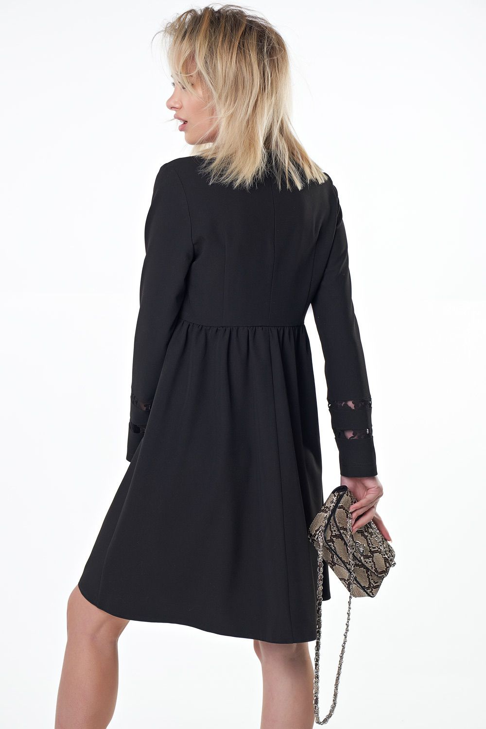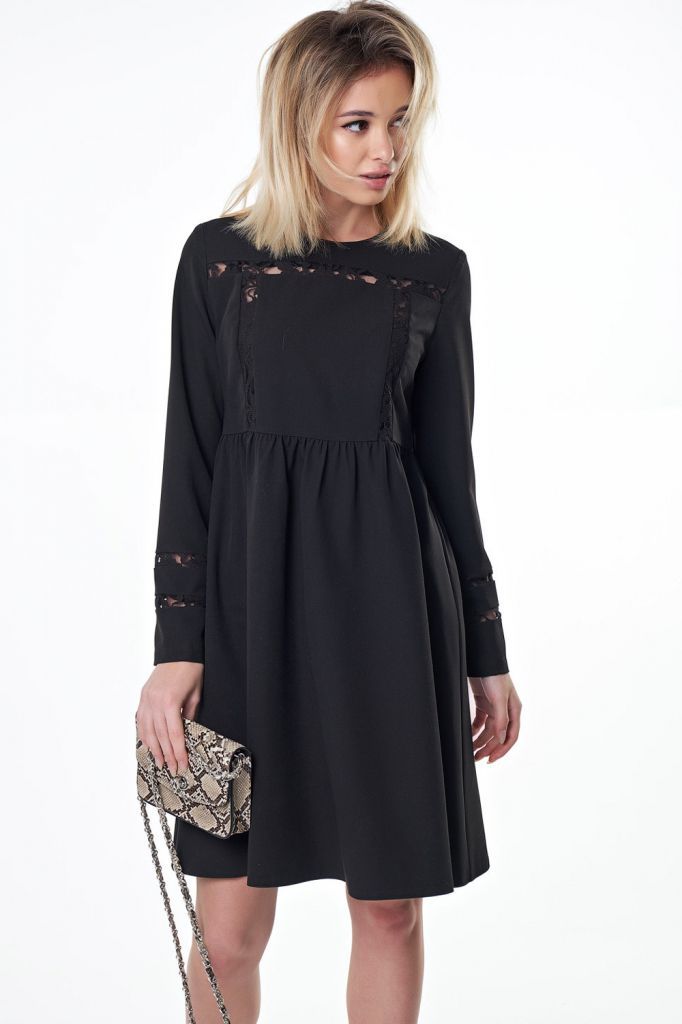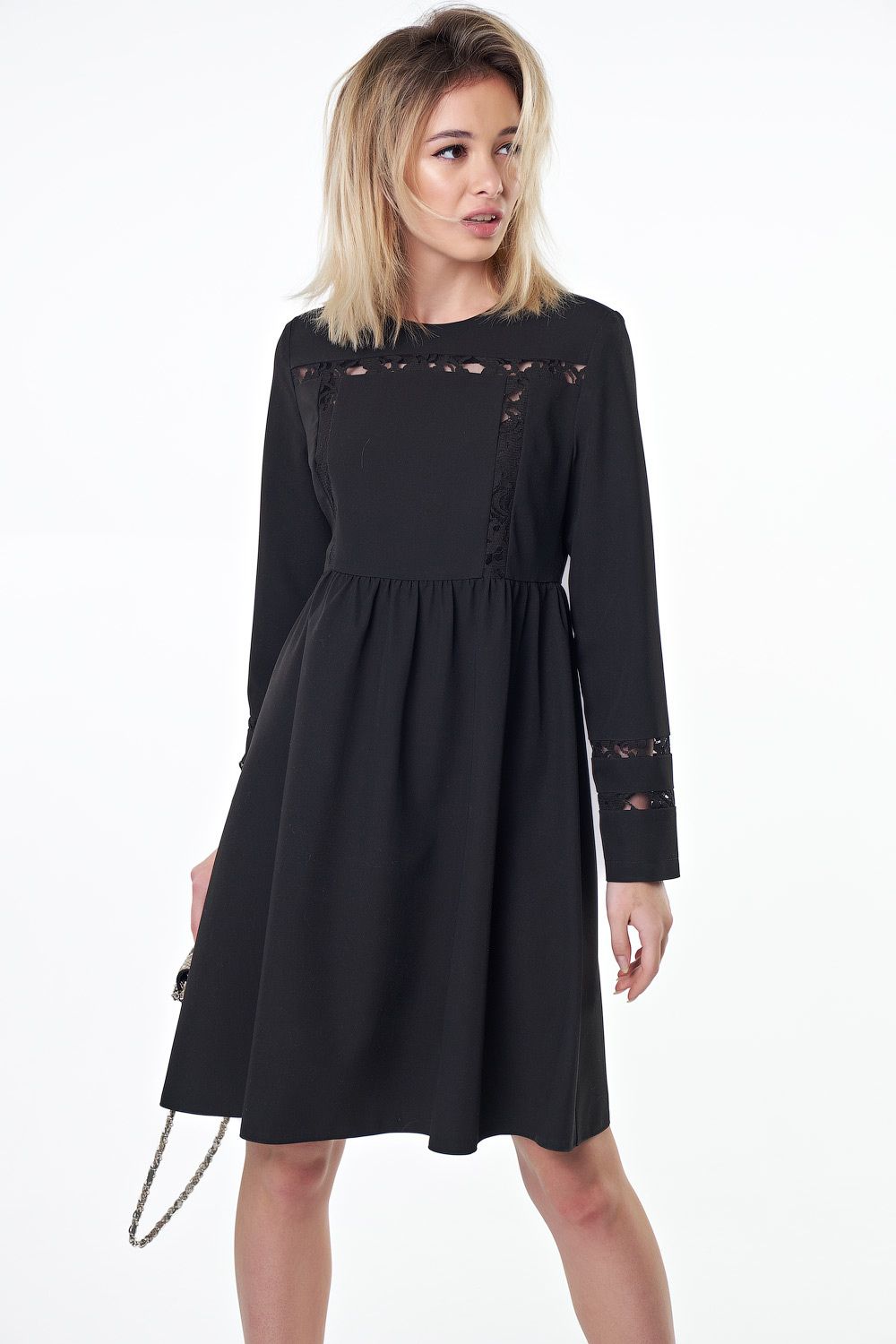 • Особенности: Платье прямого силуэта из плательной ткани с кружевными вставками. Детали: горловина округлой формы, втачной длинный рукав, отрезное по талии, юбка со сборкой. По переду и по рукаву выполнены членения с кружевными вставками.