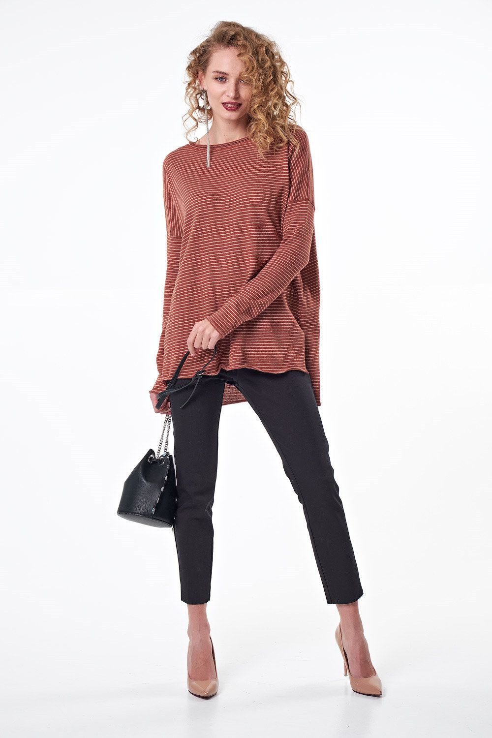 • Особенности: Кофта прямого силуэта из трикотажа в полоску. Детали: горловина округлой формы, обработана окантовкой. Рукав втачной, пройма спущенная, по низу рукава декоративные завязки.