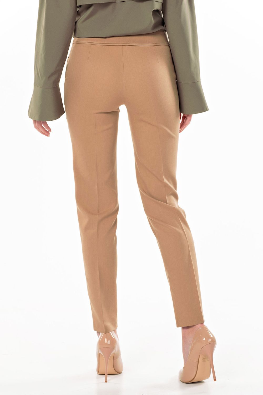• Особенности: Брюки из костюмной ткани полуприлегающего силуэта. Детали: пояс-кокетка, декоративный кант из основной ткани по линии кокетки, боковые карманы с планкой. Застежка на потайную молнию в боковом шве.
