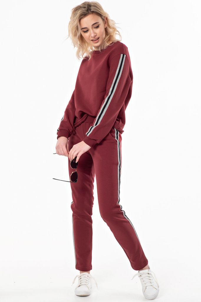 • Особенности: Костюм из футера с декоративными лампасами состоит из свитшота и брюк. Детали свитшота: горловина округлой формы, прямой силуэт, втачной длинный рукав со спущенной проймой, по низу рукава - манжета, по рукаву настрочен лампас, нижний край свитшота обработан бейкой с открытым срезом. Брюки прилегающего силуэта, притачной пояс, брючные карманы, по боковому шву настрочен лампас.