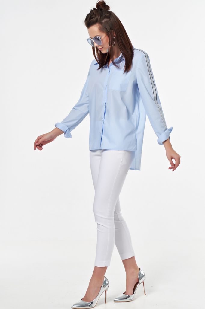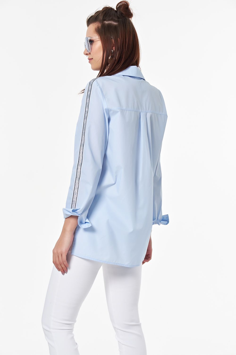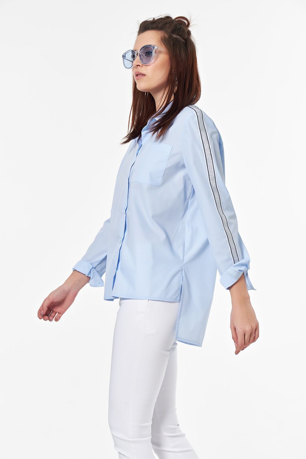 • Особенности: Рубашка прямого силуэта из сорочечной ткани. Детали: отложной воротник на стойке, по плечевым швам и середине рукава настрочена декоративная тесьма, длинные втачные рукава с манжетой, разрезы в боковых швах, разная длина переда и спинки, накладной карман по передй, кокетка по спинке. Застежка на петли-пуговицы по планке переда.