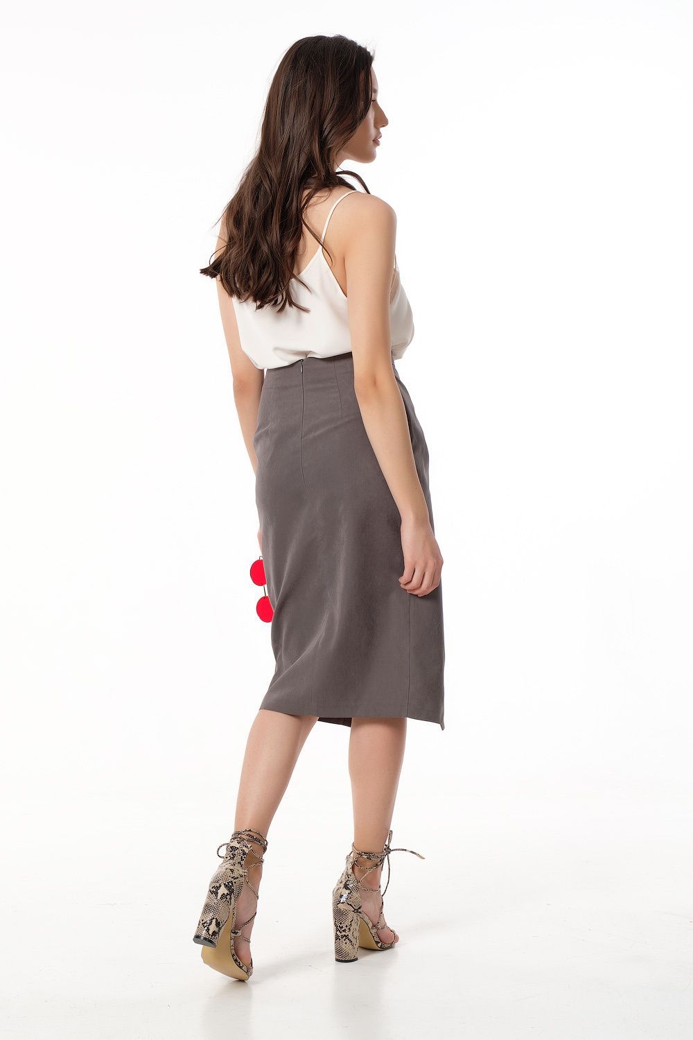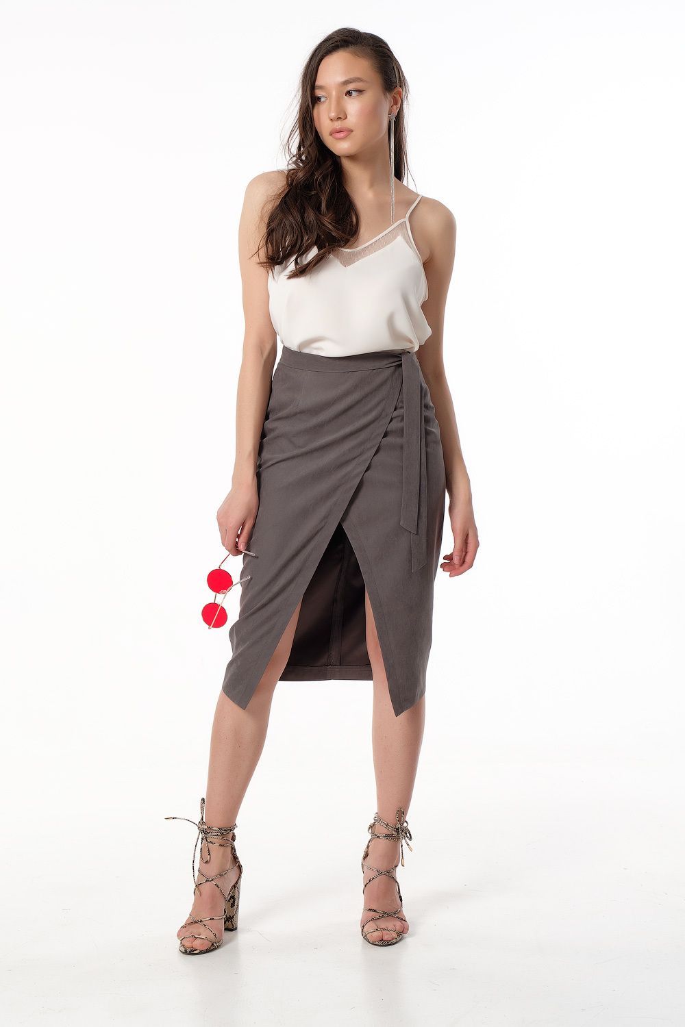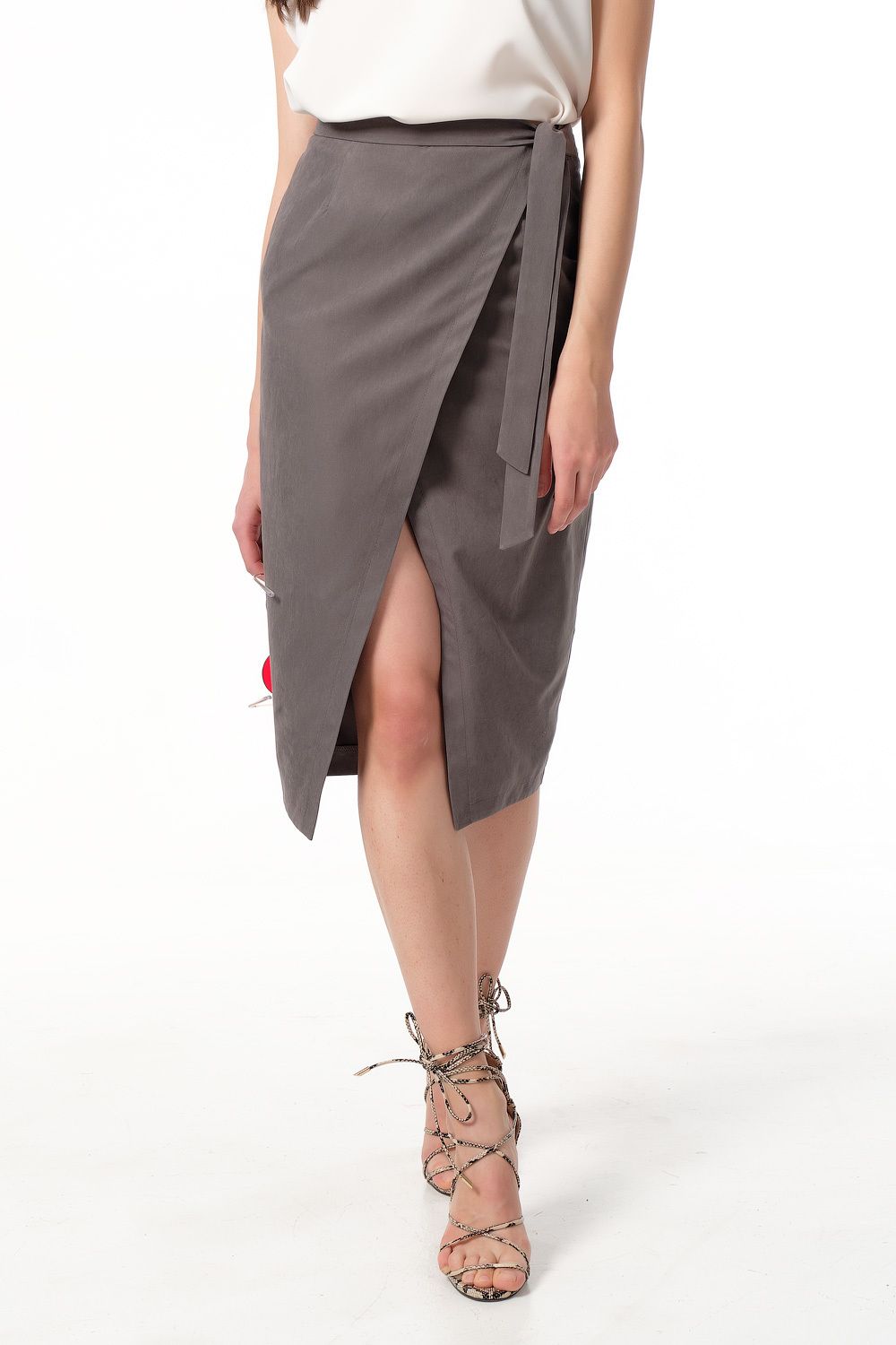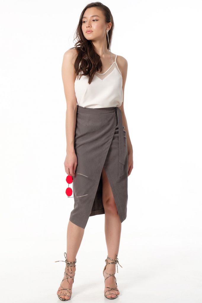 • Особенности: Юбка с имитацией запаха. Детали: притачной пояс с завязками, запах по переду, вытачки, застежка на молнию.