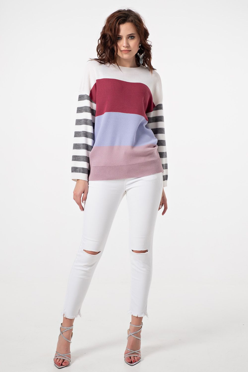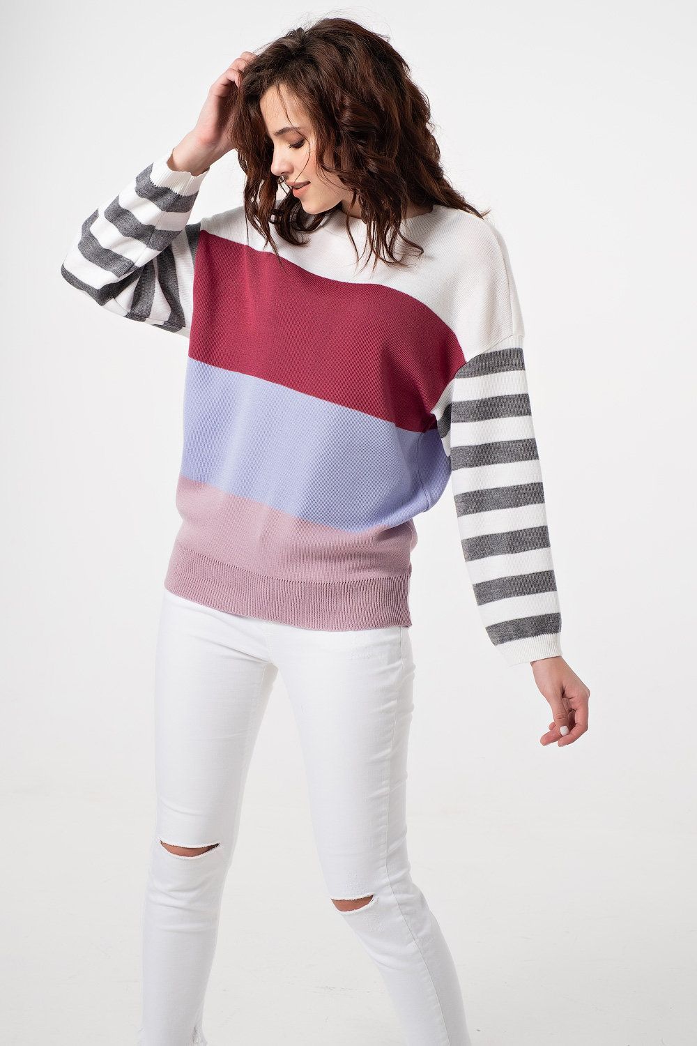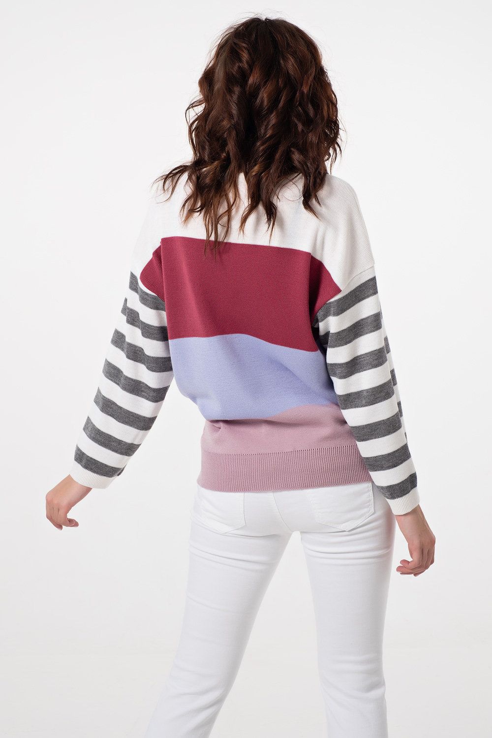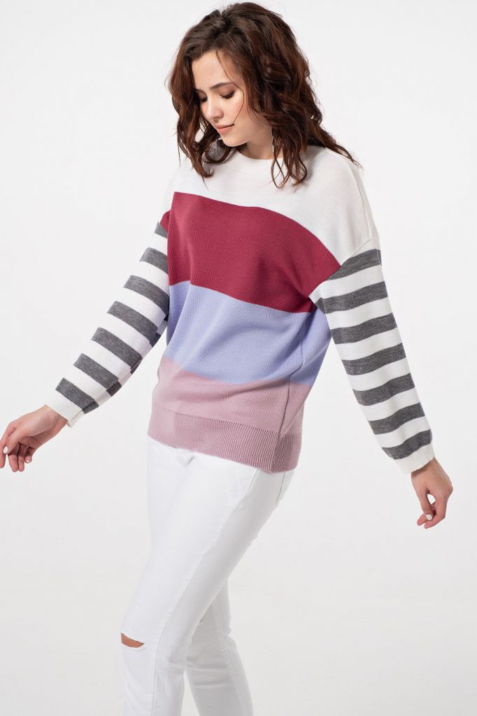 Особенности: Джемпер свободного силуэта в стиле «oversize» выполнен из полушерстяной пряжи в стиле color-block. Горловина, рукава и низ джемпера оформлены резинкой в рубчик.