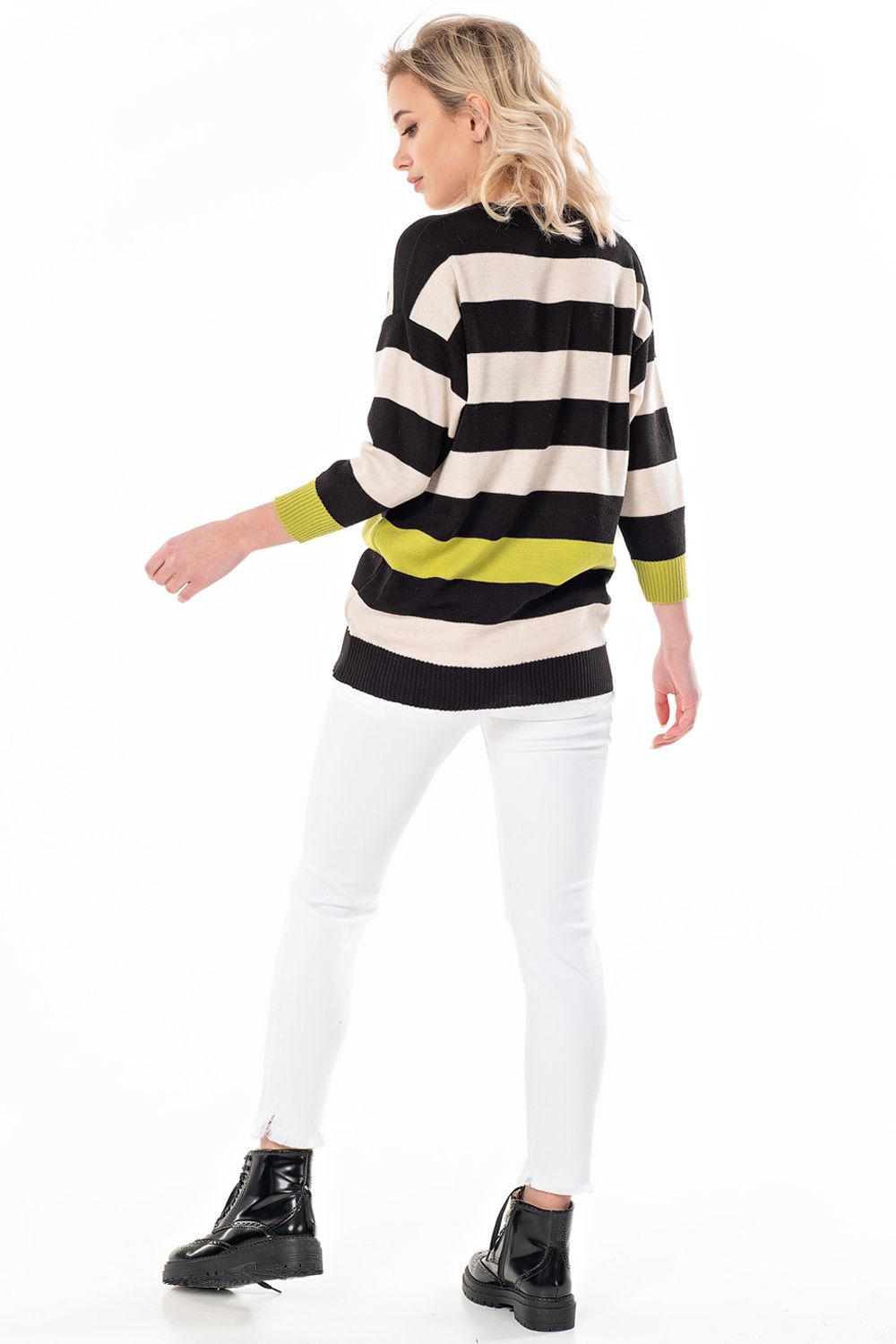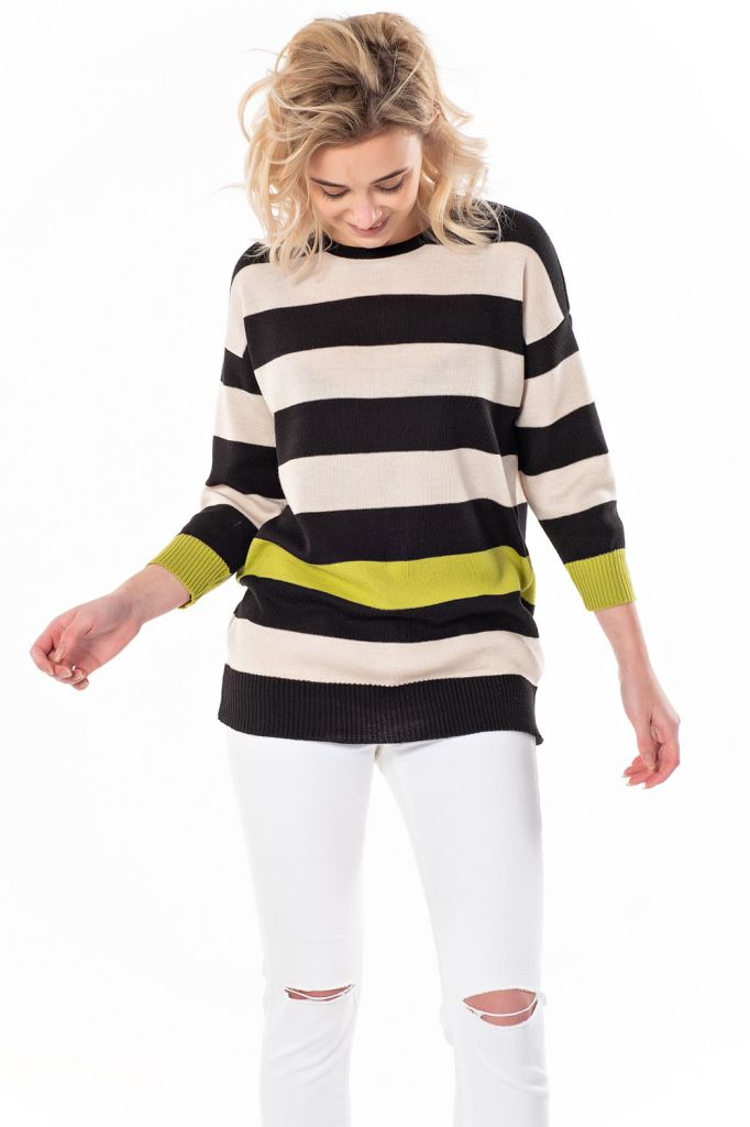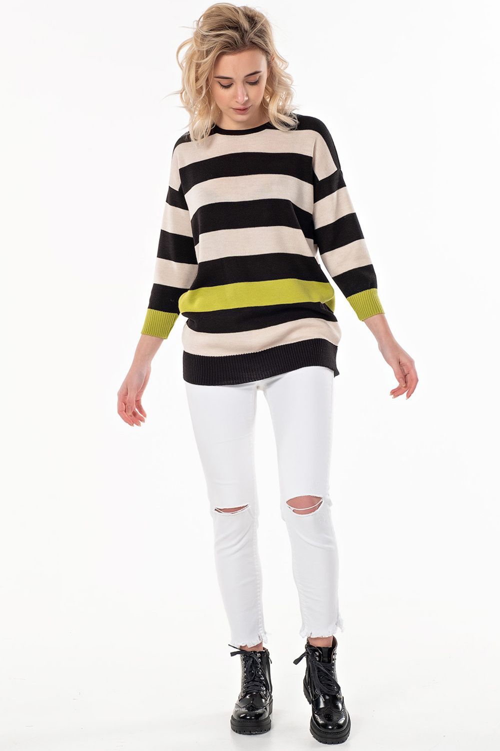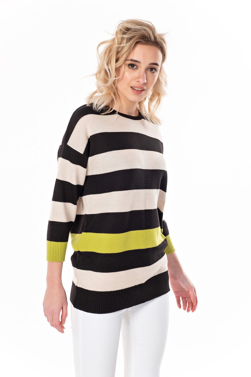 Особенности: Вязаный джемпер в крупную полоску со спущенной проймой.
