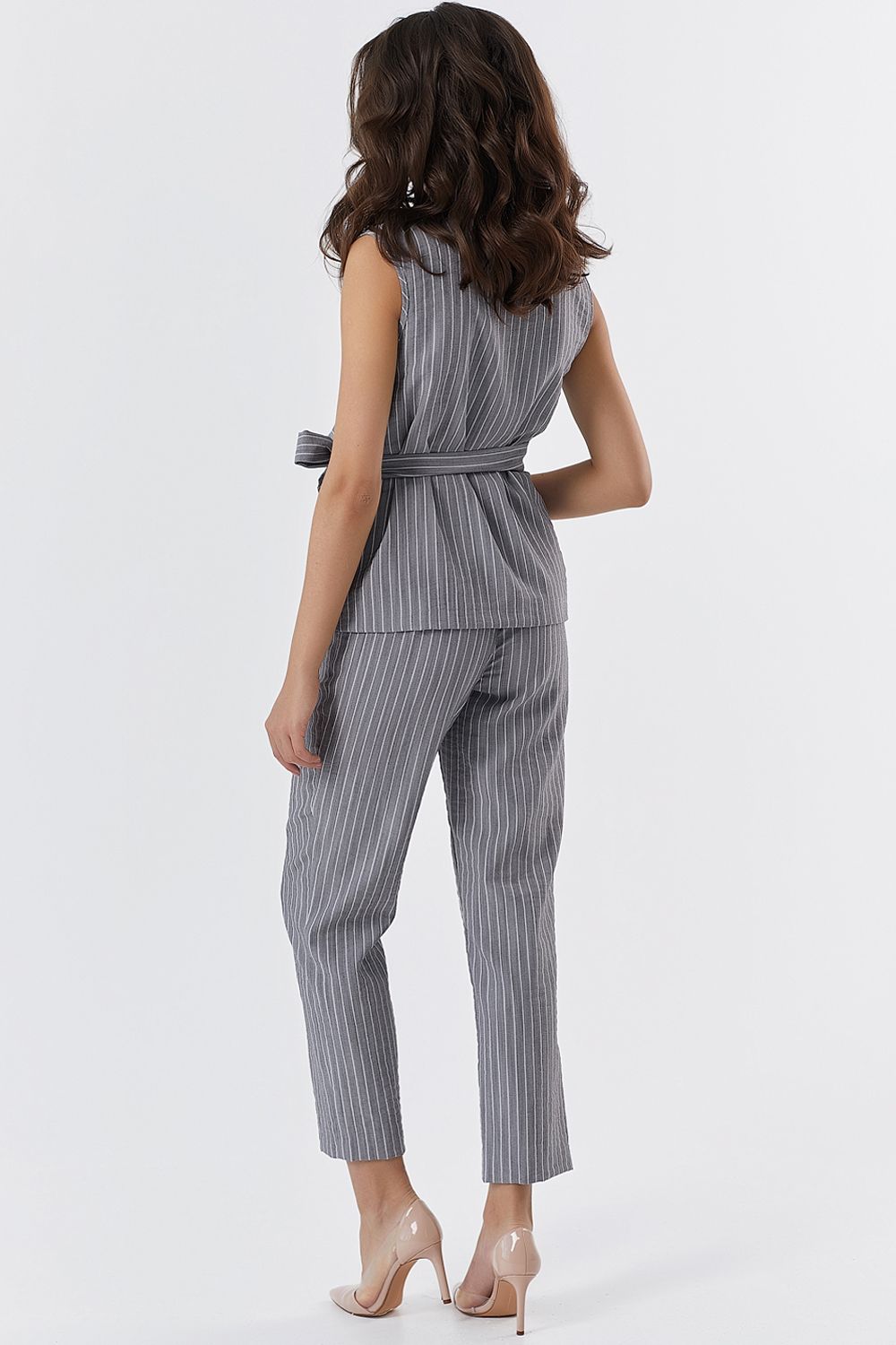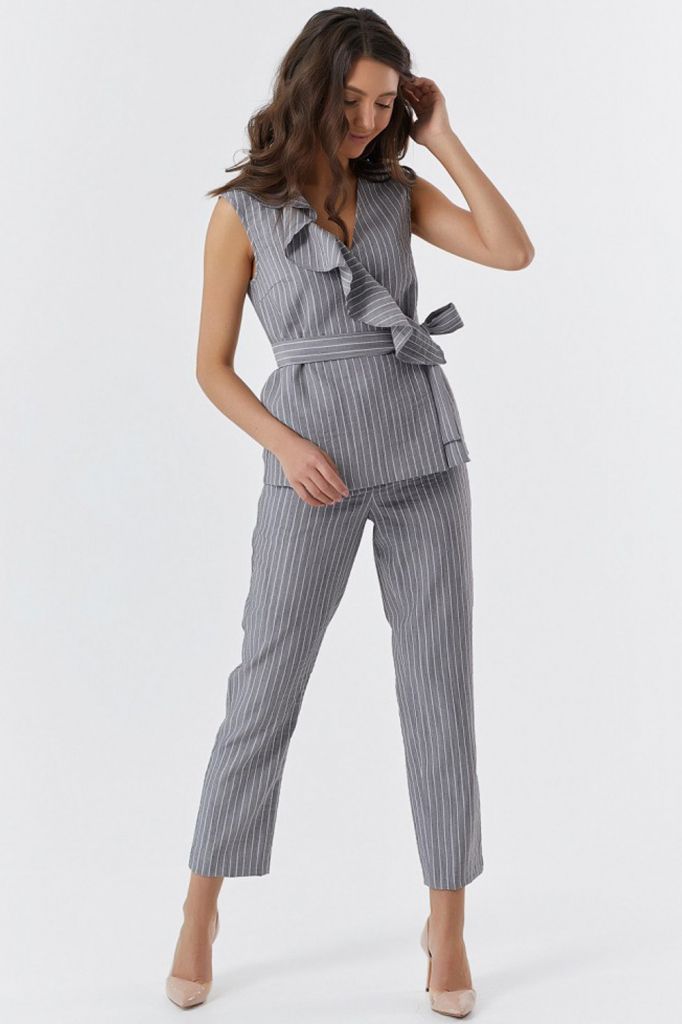 • Особенности: Костюм состоит из блузы прямого силуэта и укороченных брюк прилегающего силуэта. Детали блузы: на правой полочке волан, застежка на потайную кнопку, длинный пояс. Детали брюк: брючные карманы, притачной пояс с застежкой на две пуговицы.